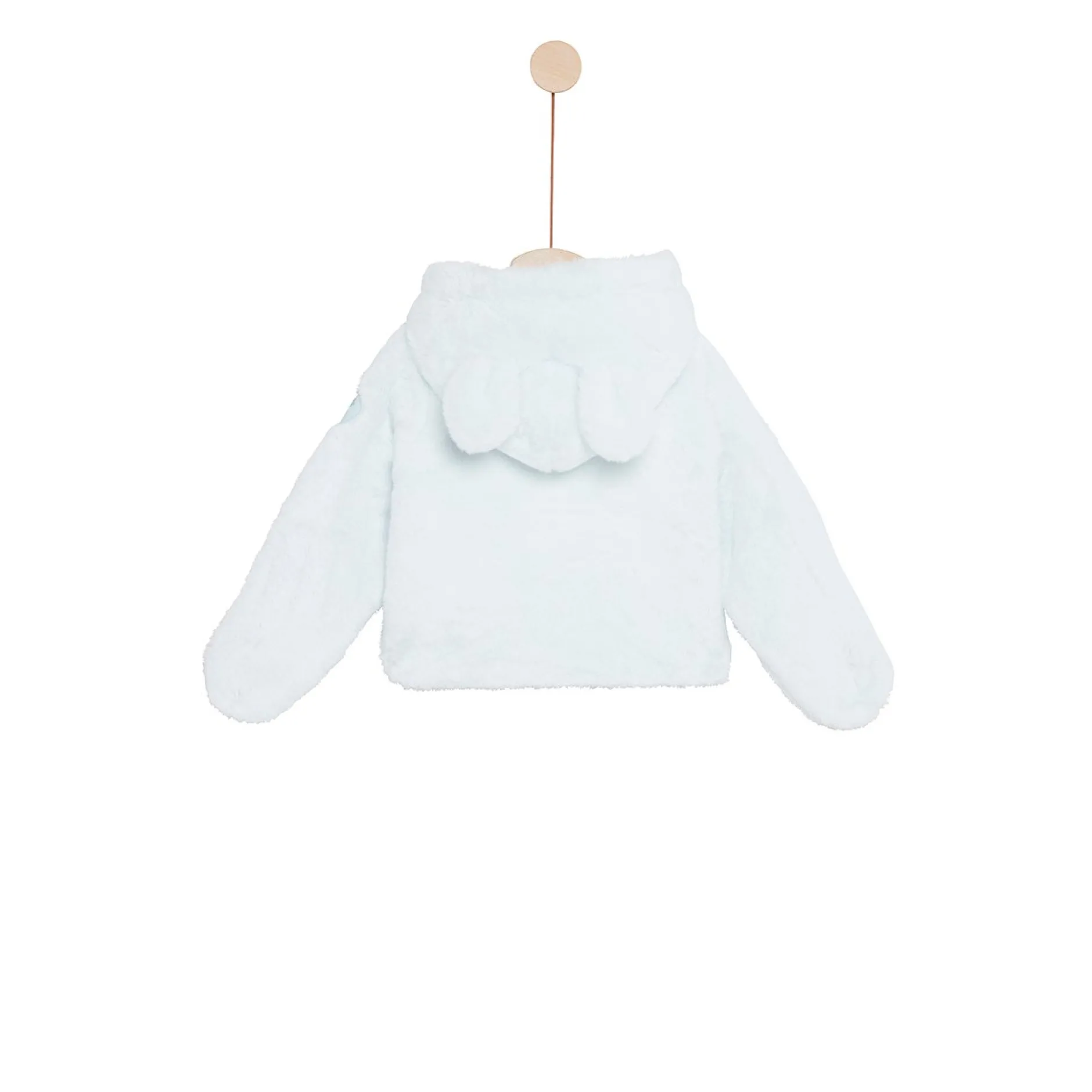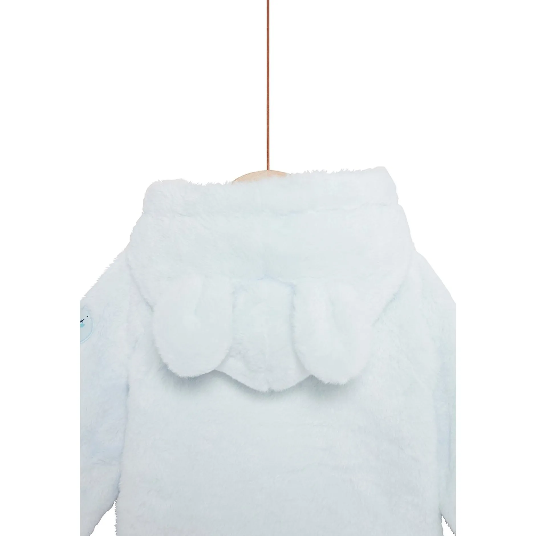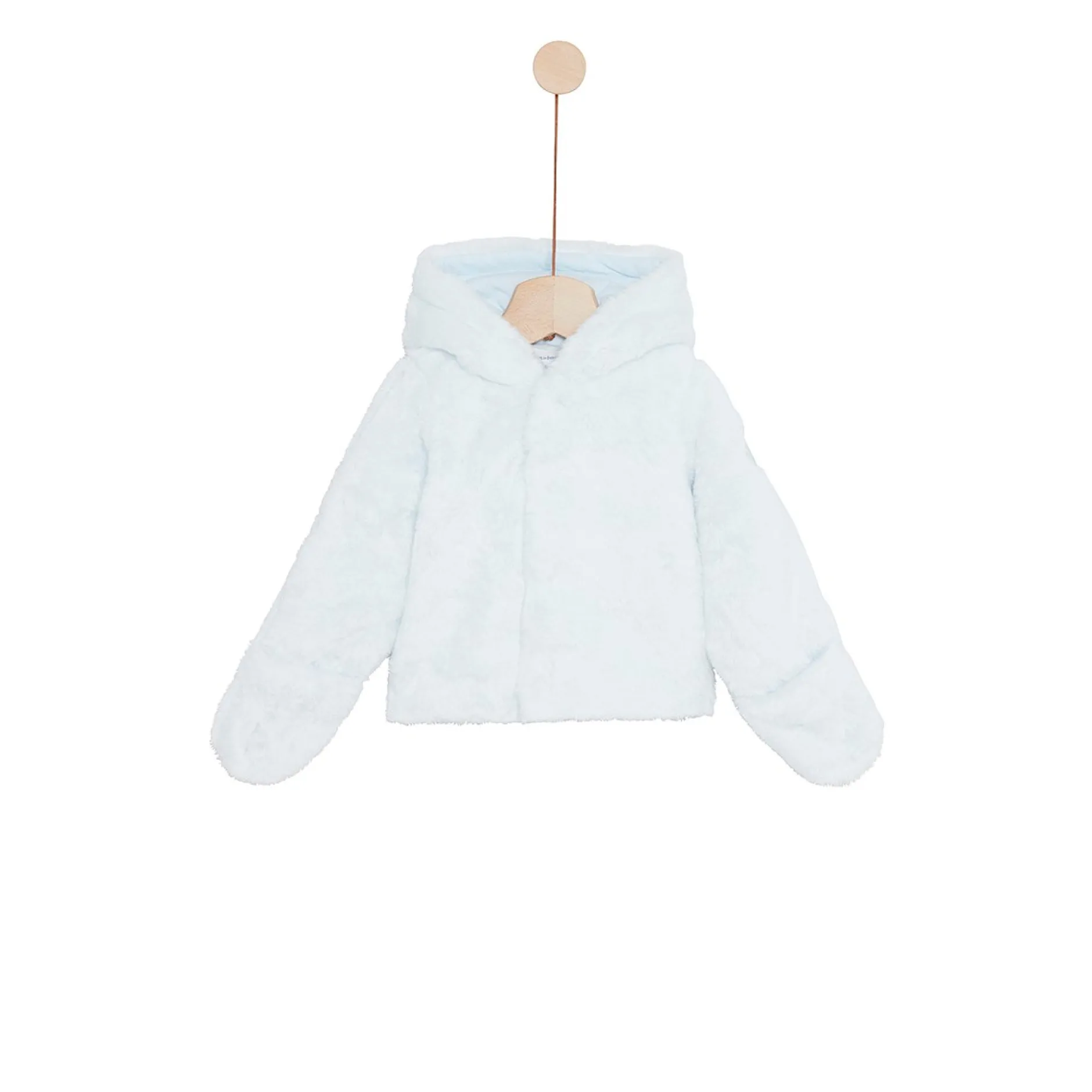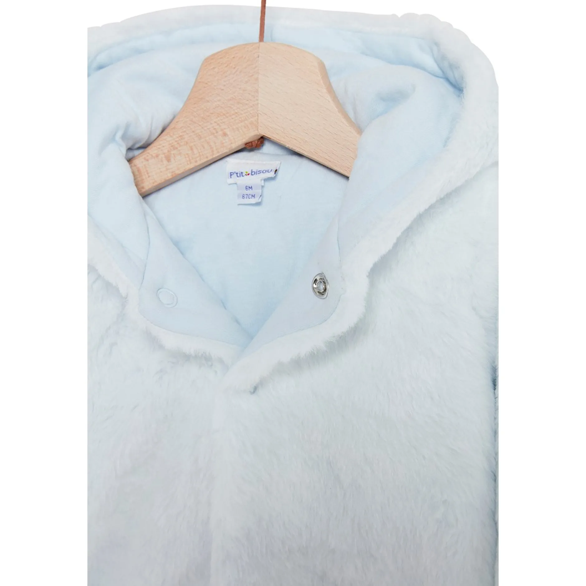 Veste à capuche P’tit Bisou en fausse fourrure très douce bleu pâle doublé de jersey uni bleu.