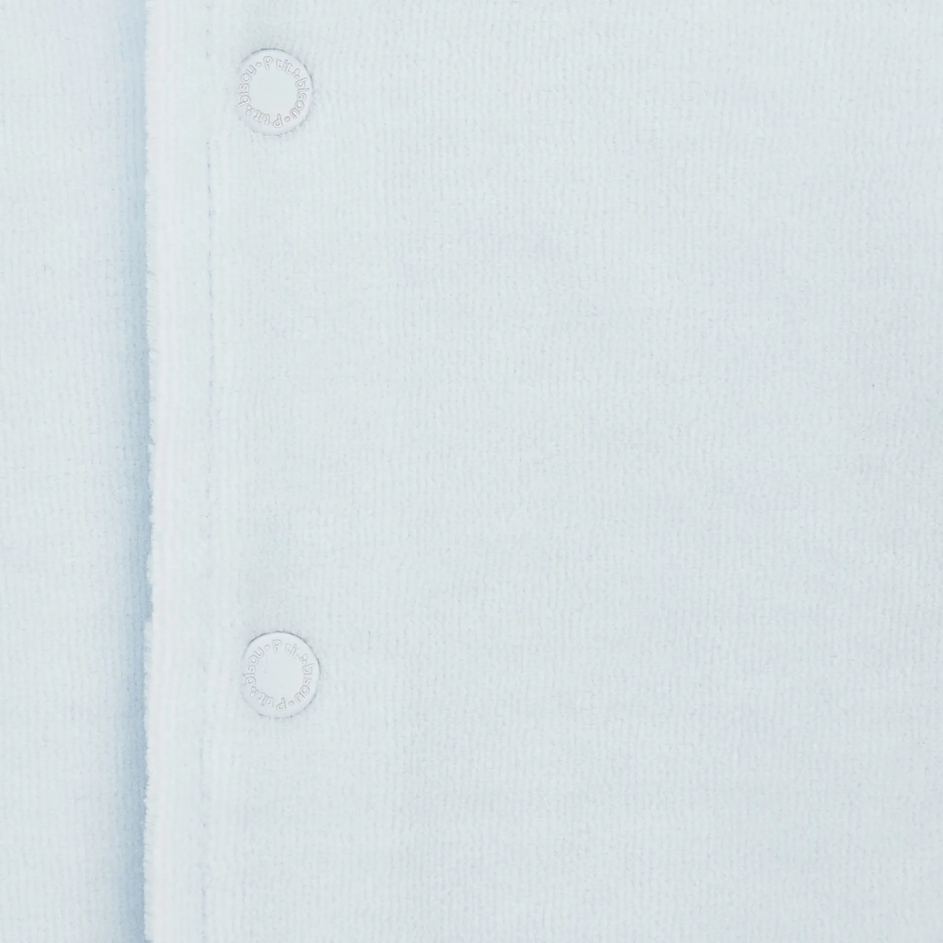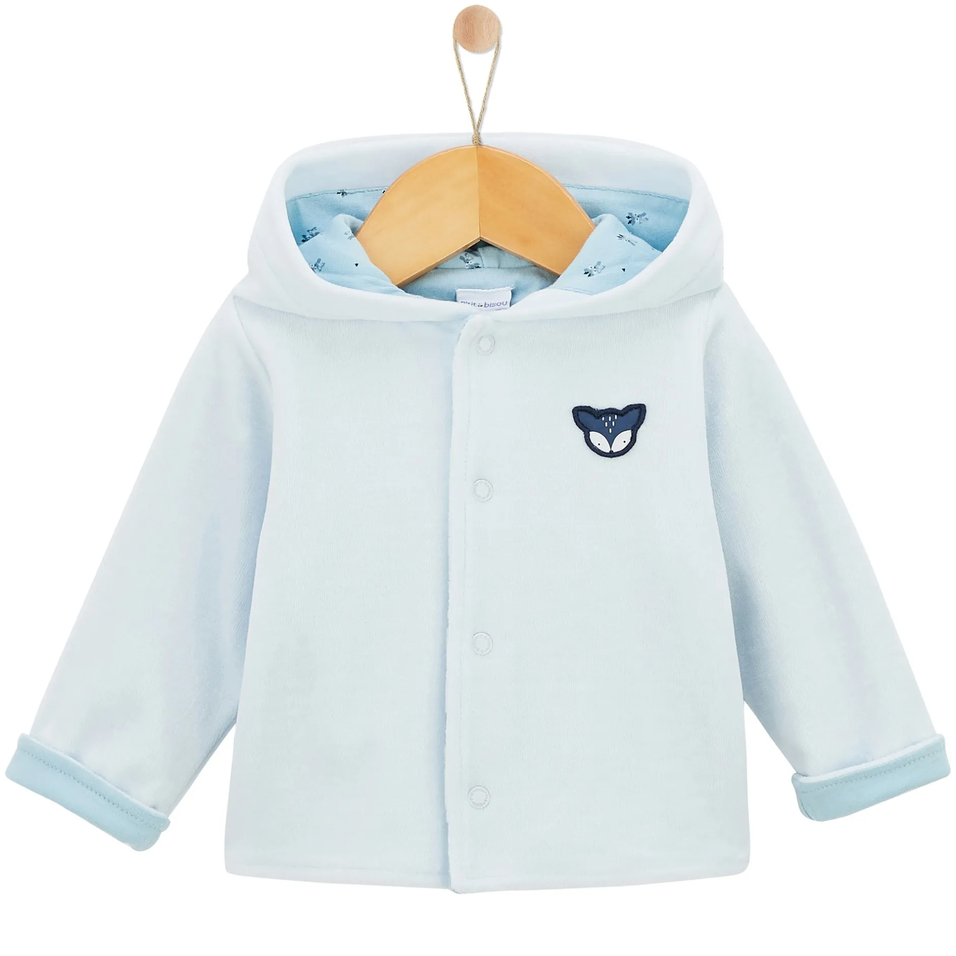 Veste à capuche P’tit Bisou en velours très doux bleu pâle doublé de jersey imprimé petits daims.