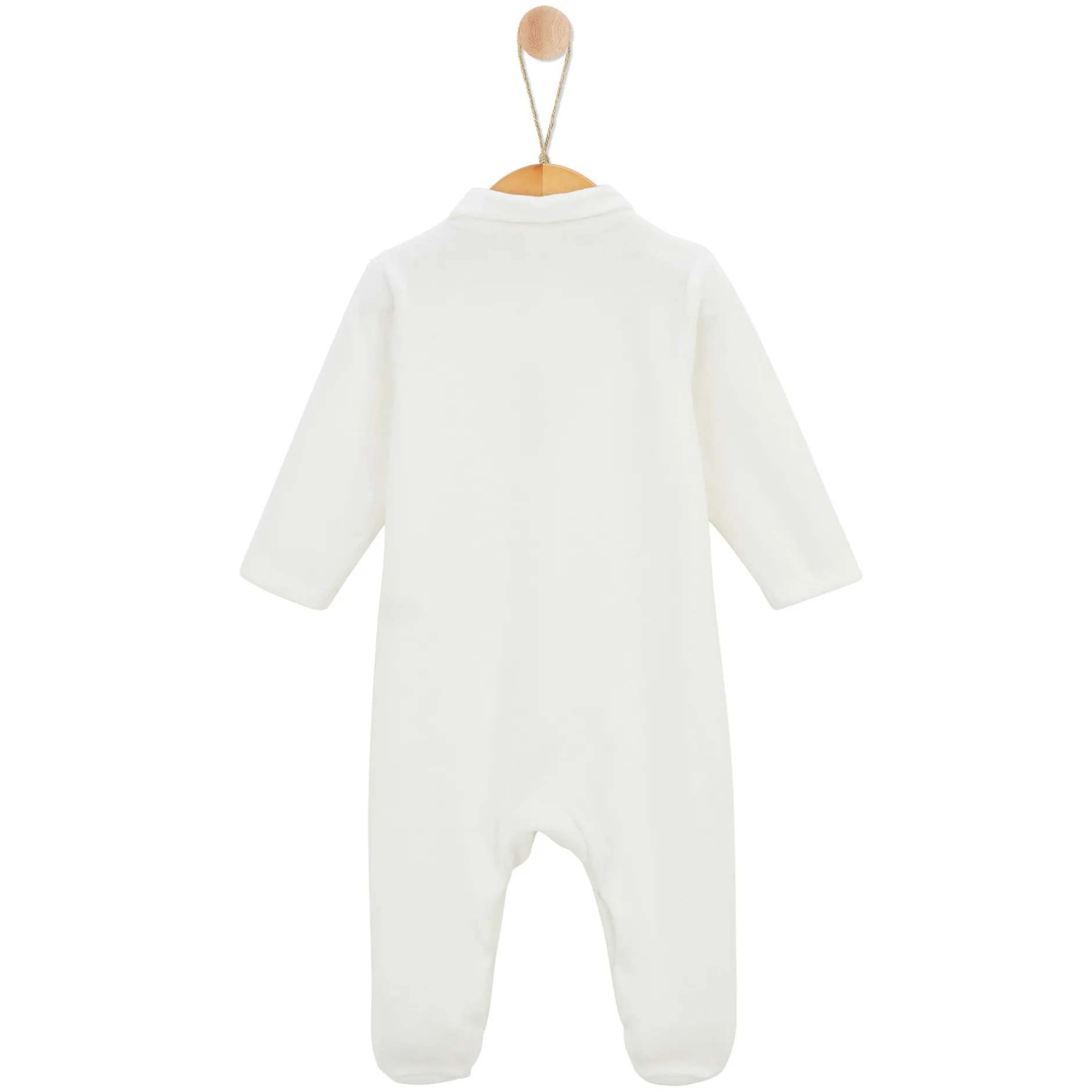 Pyjama P’tit Bisou en velours tout doux en écru avec son col qui lui confère un aspect chic. Ouverture devant par pressions pour plus de fonctionnalité et faciliter le change de bébé. Très jolie animation représentant un petit daim en sérigraphie sur le devant, tellement adorable ! Une pièce confort qui habillera bébé aussi bien le jour que la nuit.