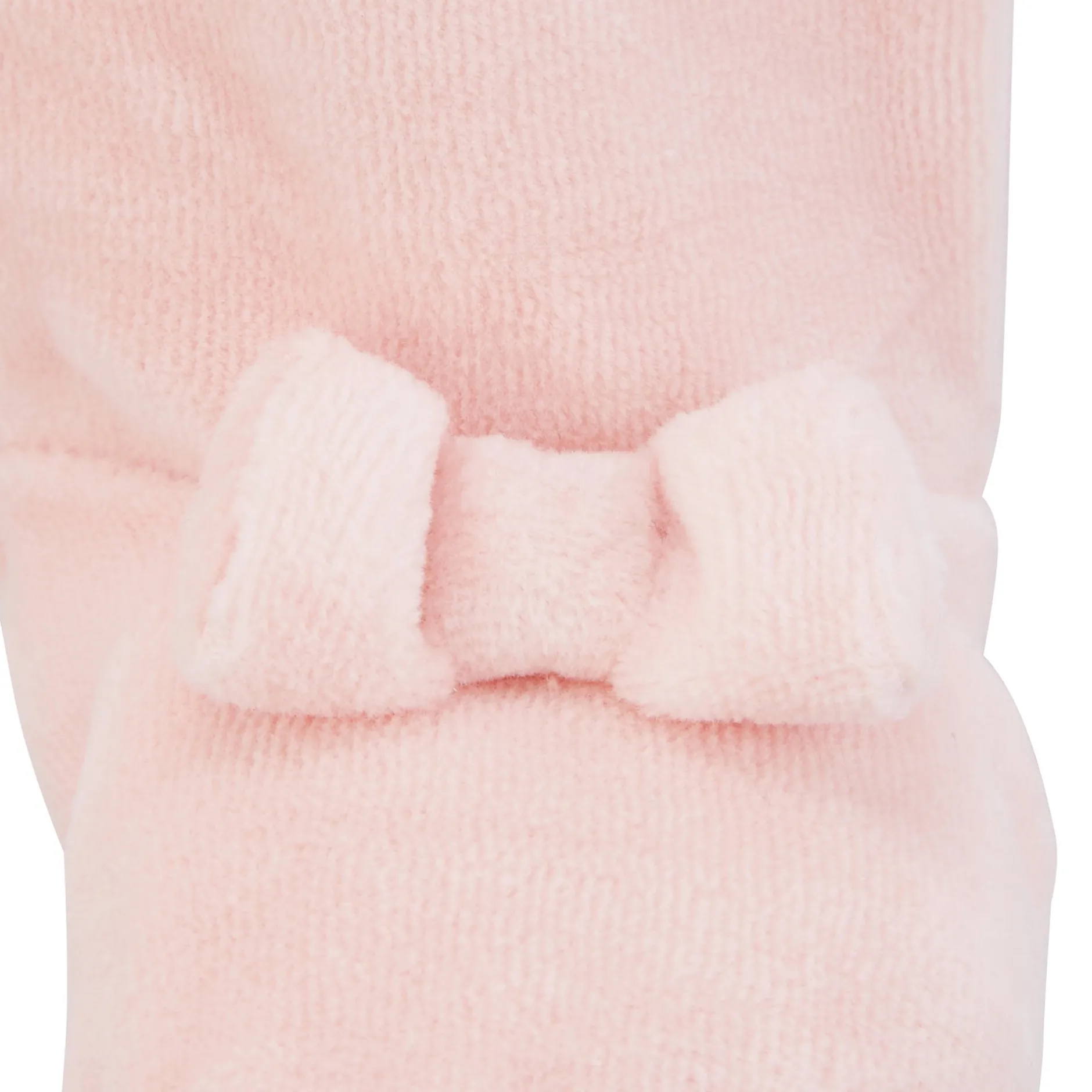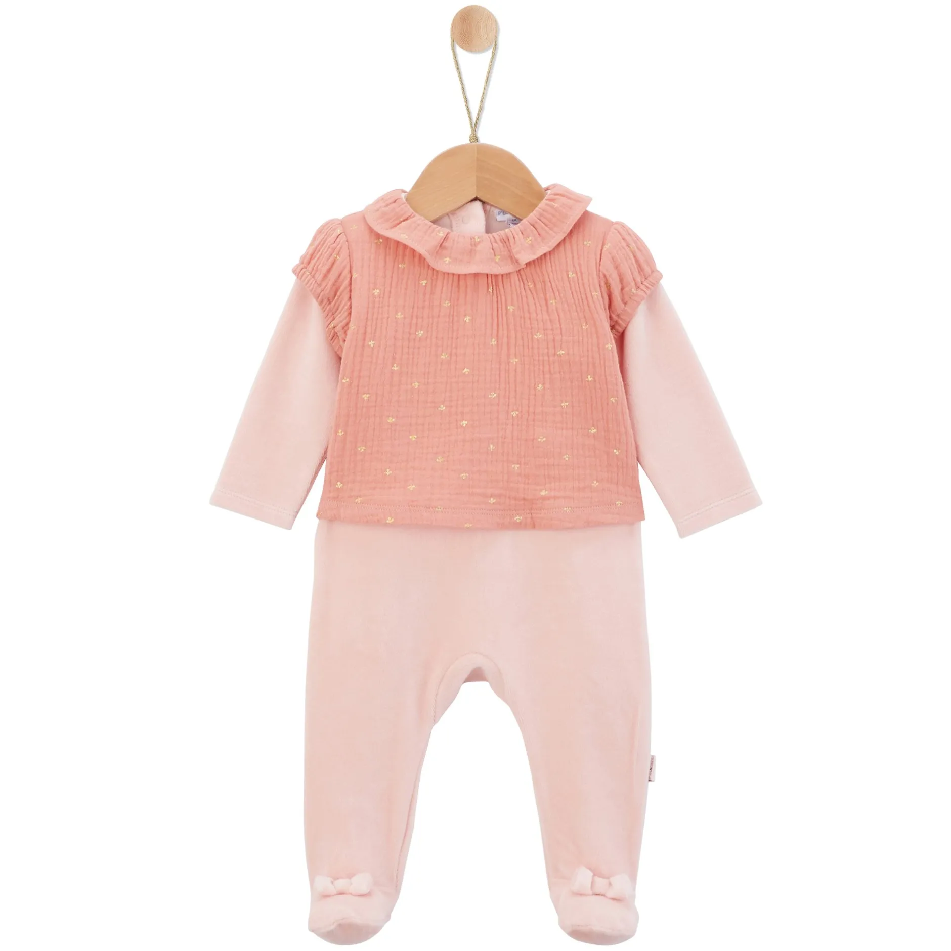 Pyjama avec pieds P’tit Bisou en velours rose avec le haut en forme tunique manches courtes en mousseline gaze rose terracotta très tendance avec motif floral à paillettes dorées. Ouverture pont dos et dos tunique par pressions pour plus de fonctionnalité. Des détails très féminins ornent la pièce : des jolis nœuds sur les pieds et des volants sur manches et cols.
