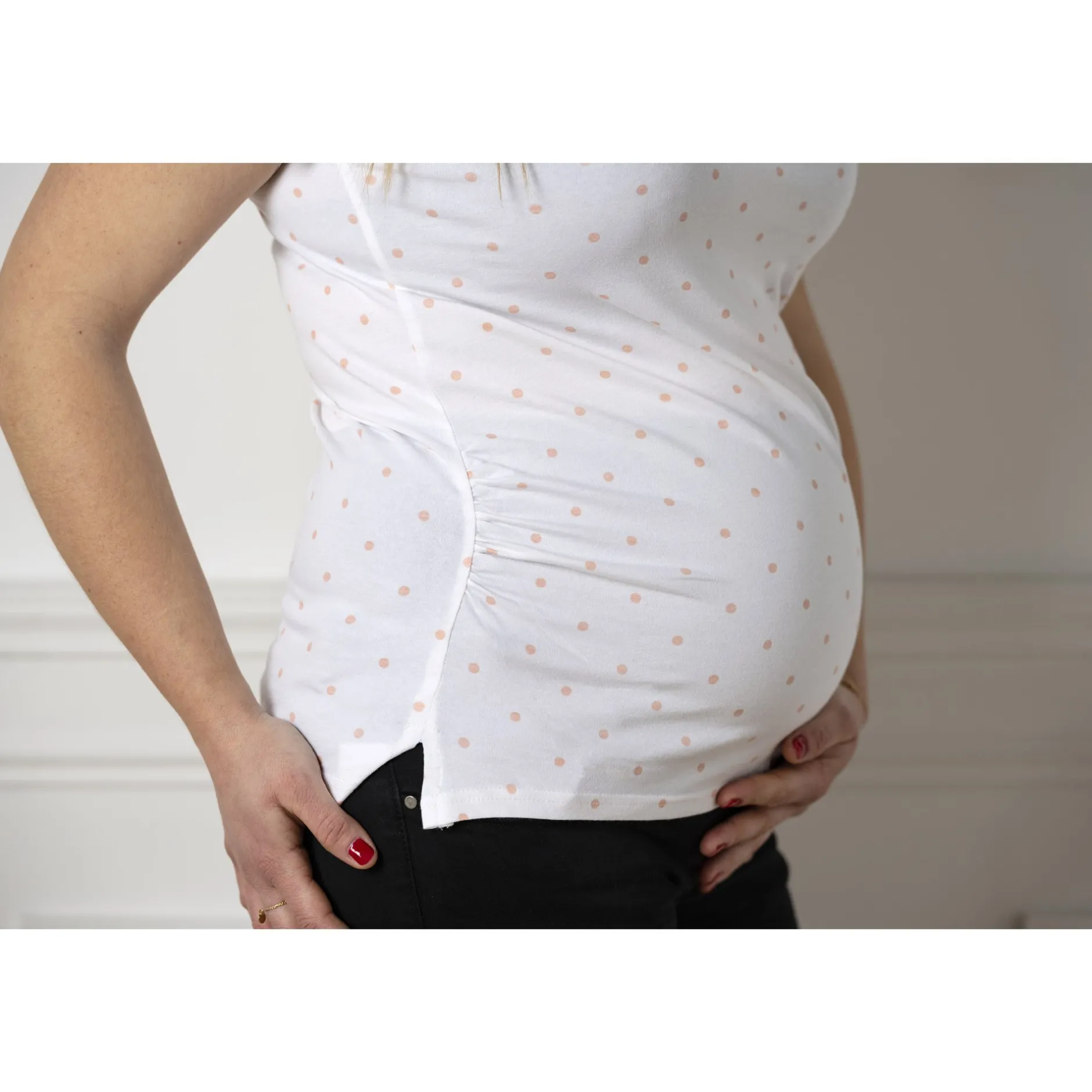Spécialement conçus pour vous accompagner dès les premiers mois de votre grossesse jusqu’au moment de la naissance de bébé, ce t-shirt blanc à manches courtes adapté à votre ventre tout rond de femme enceinte. Ravissant motif à pois rose et inscription en paillette rose gold « Dream Team » .