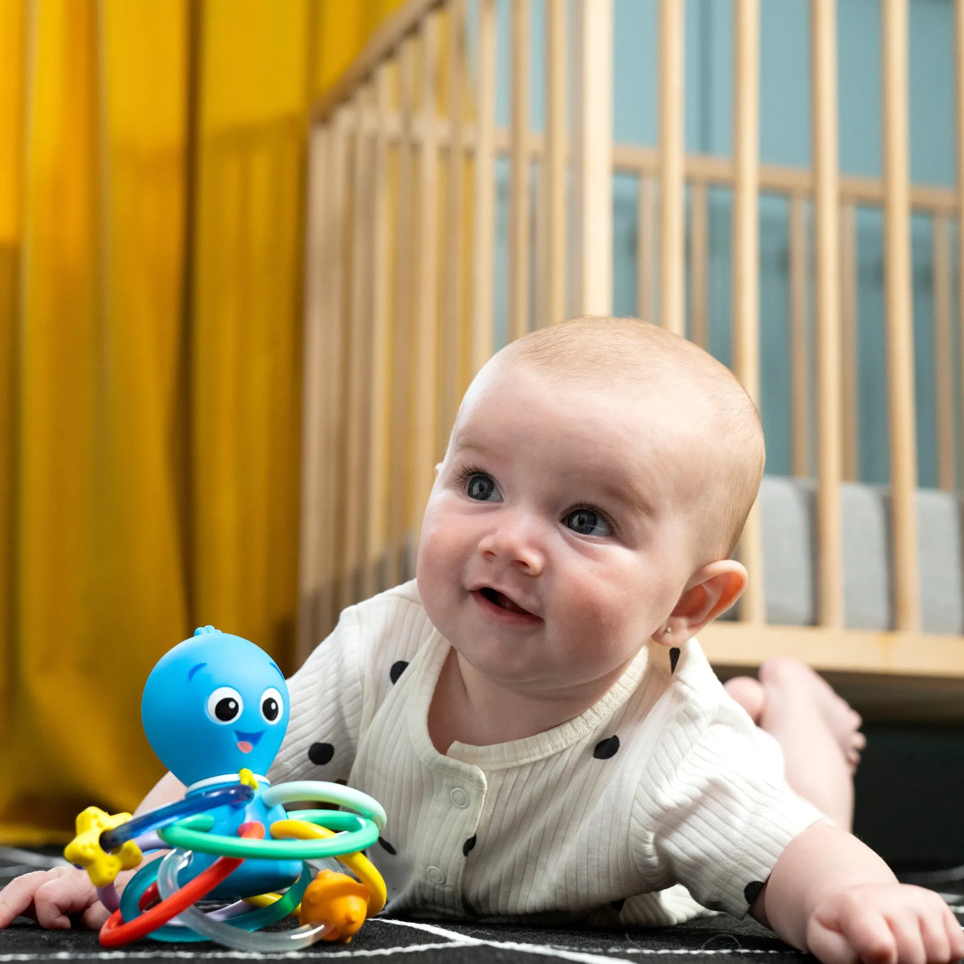 Le hochet et anneau de dentition Ocean Explorers Opus’s Shake & Soothe Teether de Baby Einstein calme les gencives gonflées et stimule les sens de bébé avec de multiples textures, de vives couleurs et un hochet à découvrir. 6 anneaux faciles à manipuler, avec des bouliers pour jouer à la maison ou en promenade.