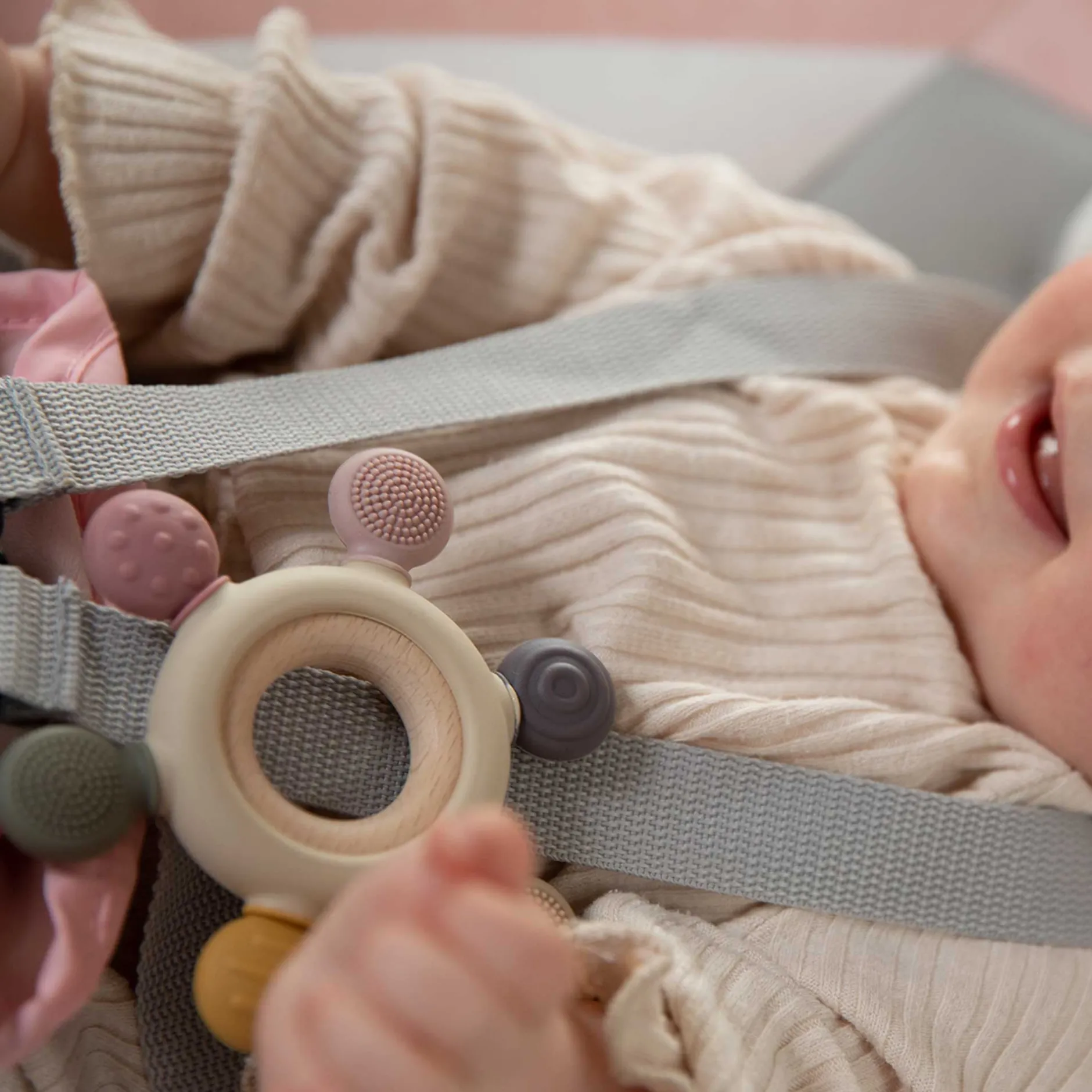 La partie en silicone de l’anneau présente une variété de textures et de formes, soulageant les gencives sensibles de votre bébé et stimulant ses sens au fur et à mesure qu’il explore. Avec son design simple mais élégant et sa gamme de couleurs douces et agréables, notre anneau multisensoriel plaira certainement aux bébés comme aux parents.