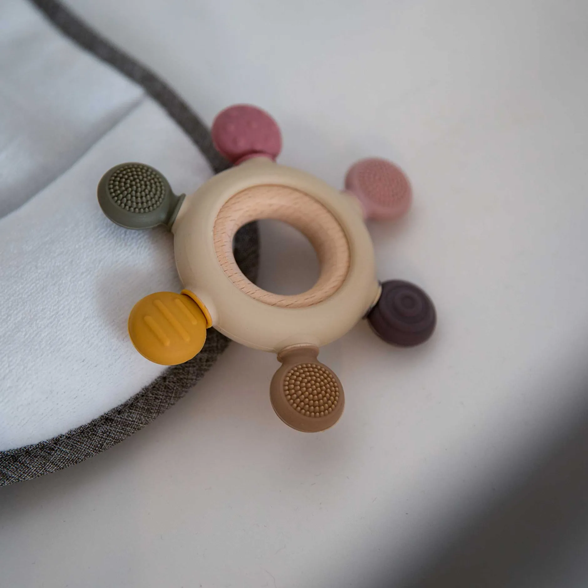 Fabriqué en silicone et en bois sûrs et durables, ce hochet à mordiller est parfait pour calmer les douleurs de dentition tout en offrant des heures de divertissement.