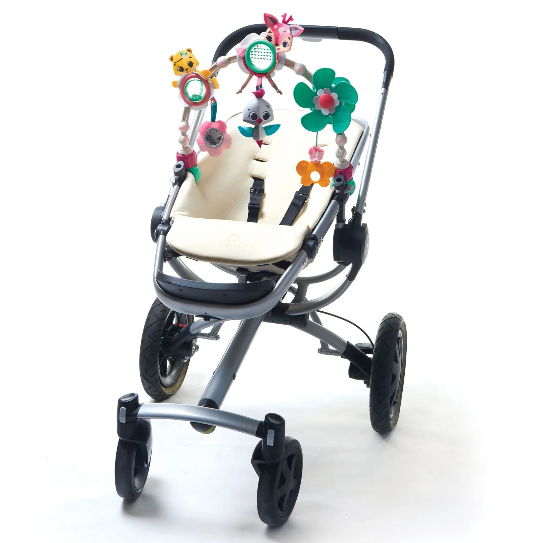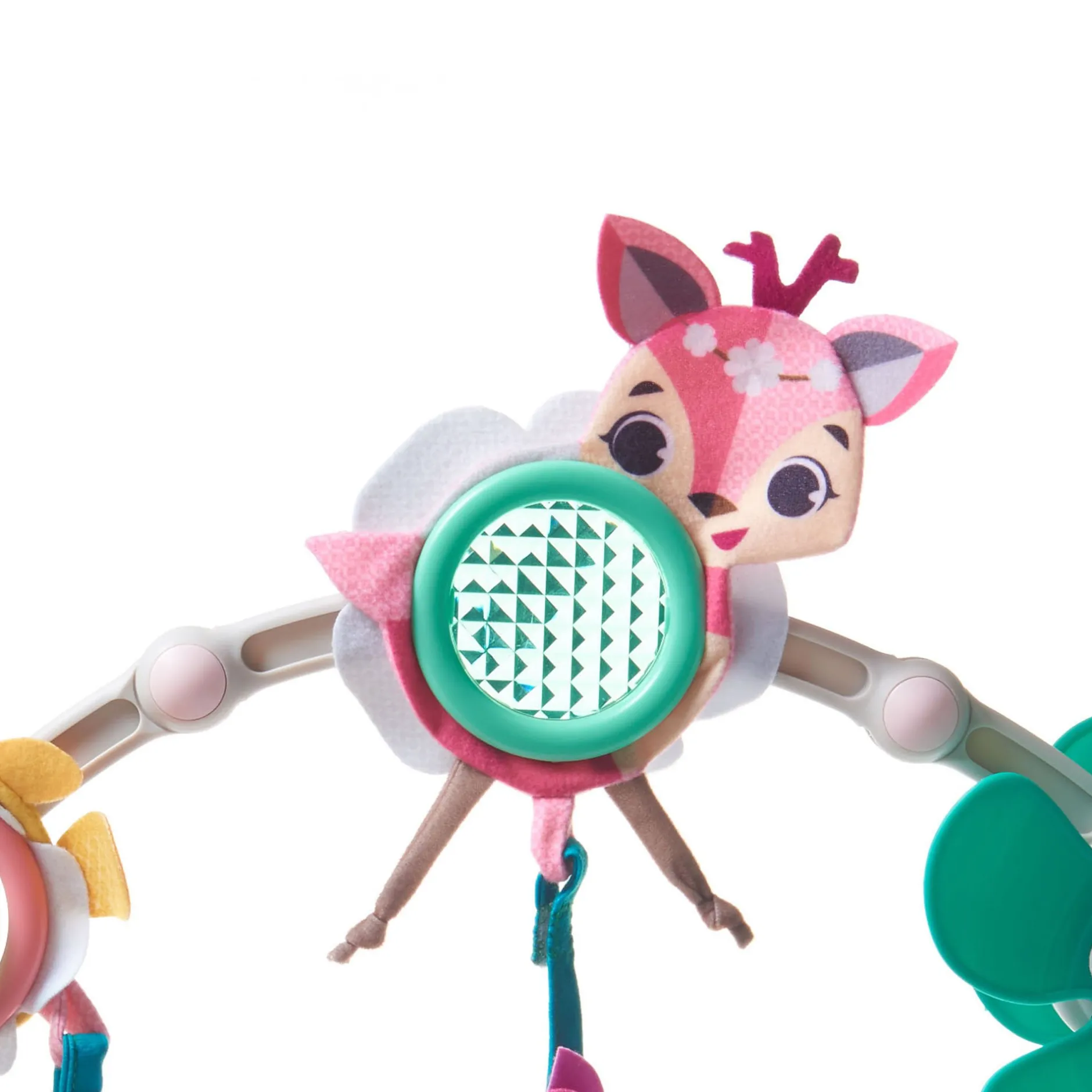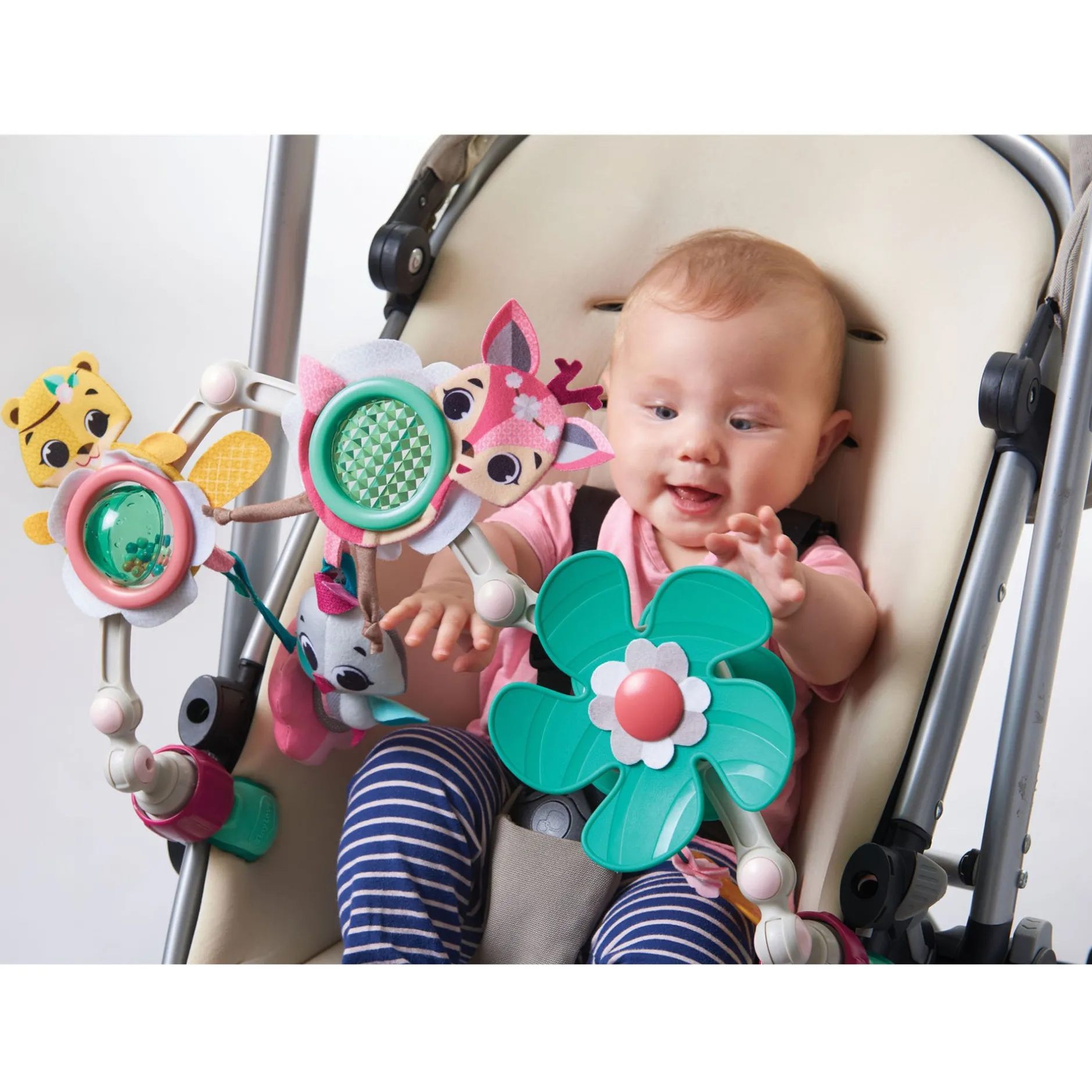 - 6 jouets d’activités : balle à texture bruissante, miroir fleur, hélice, poignée, anneau de dentition, peluche