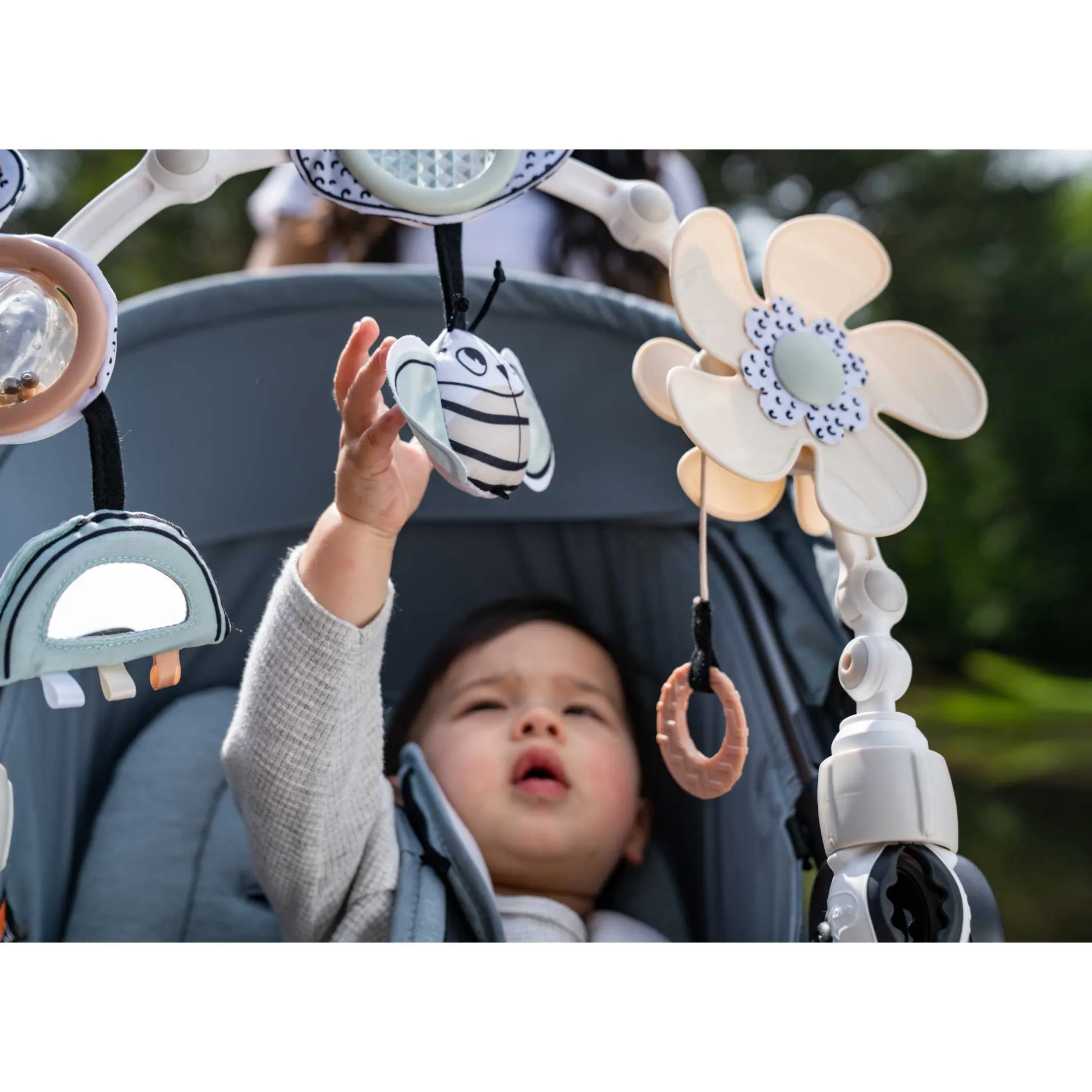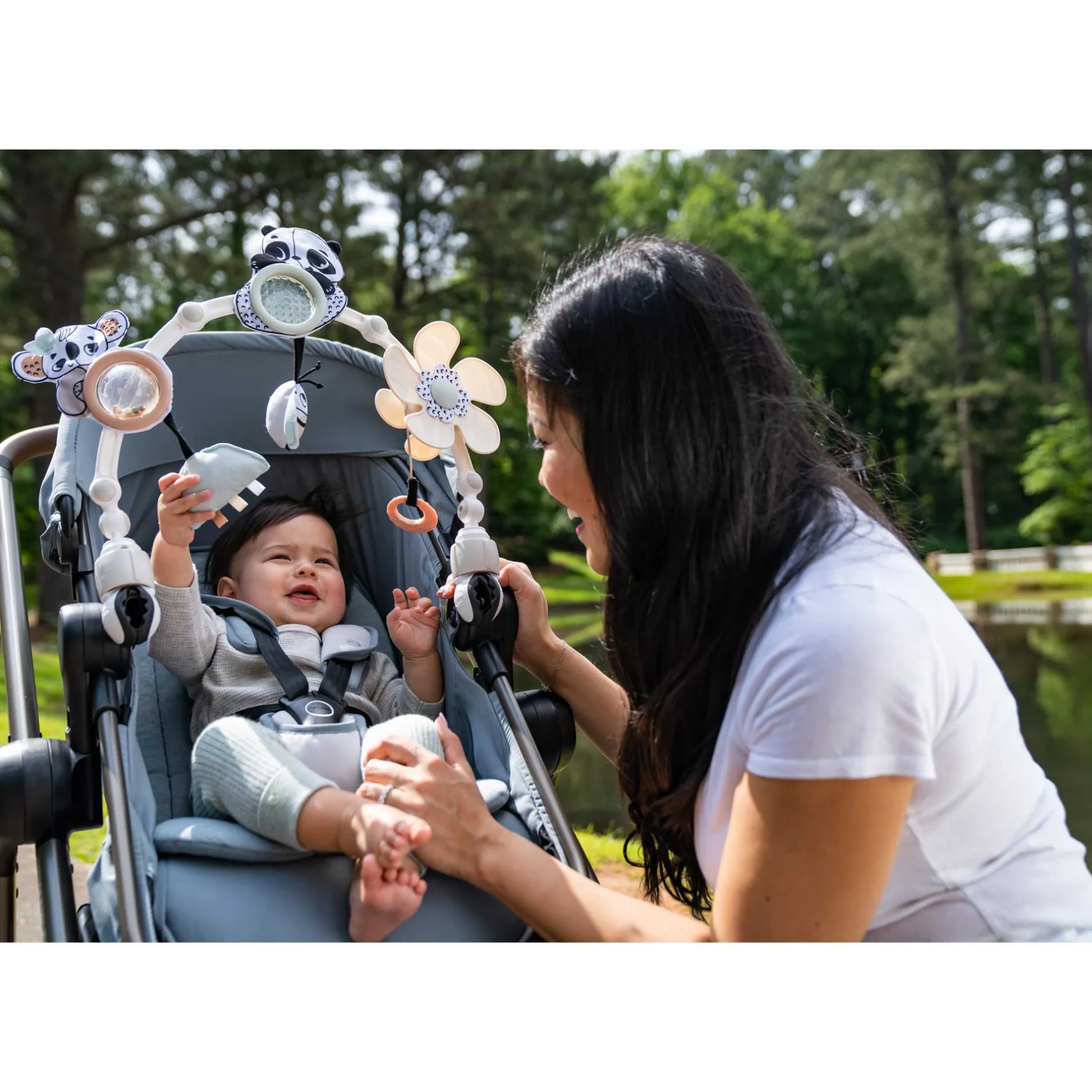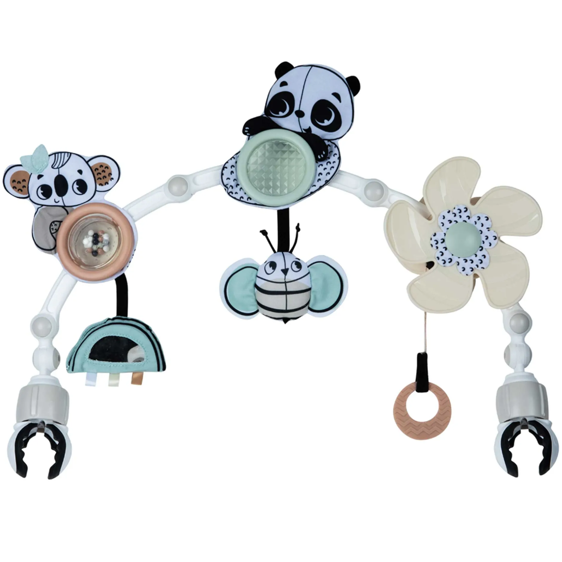 Magnifique arche Sunny Stroll Black & White avec 6 activités d’éveil attrayantes et un réglage de l’angle, pour l’amusement et le divertissement où que vous alliez ! L’arche flexible s’adapte pour être compatible avec l’âge de bébé et ses préférences de jeu.