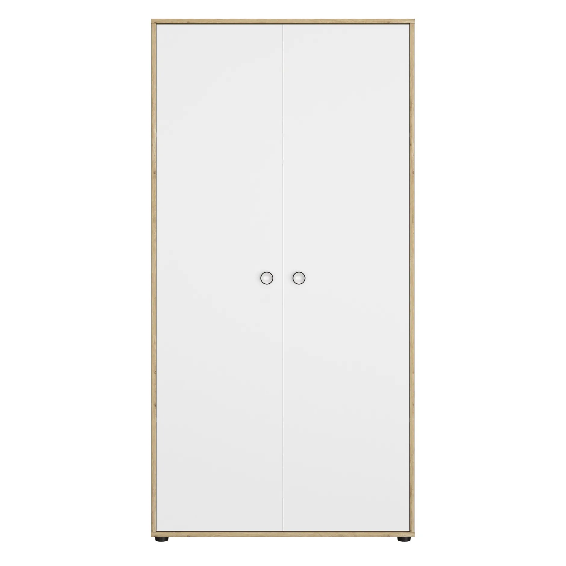 Pour plus de rangements, optez pour cette armoire au style moderne. Un joli décor bois, des portes blanches, le tout complété par des poignées blanches cerclées de noir pour une chambre mixte et contemporaine.