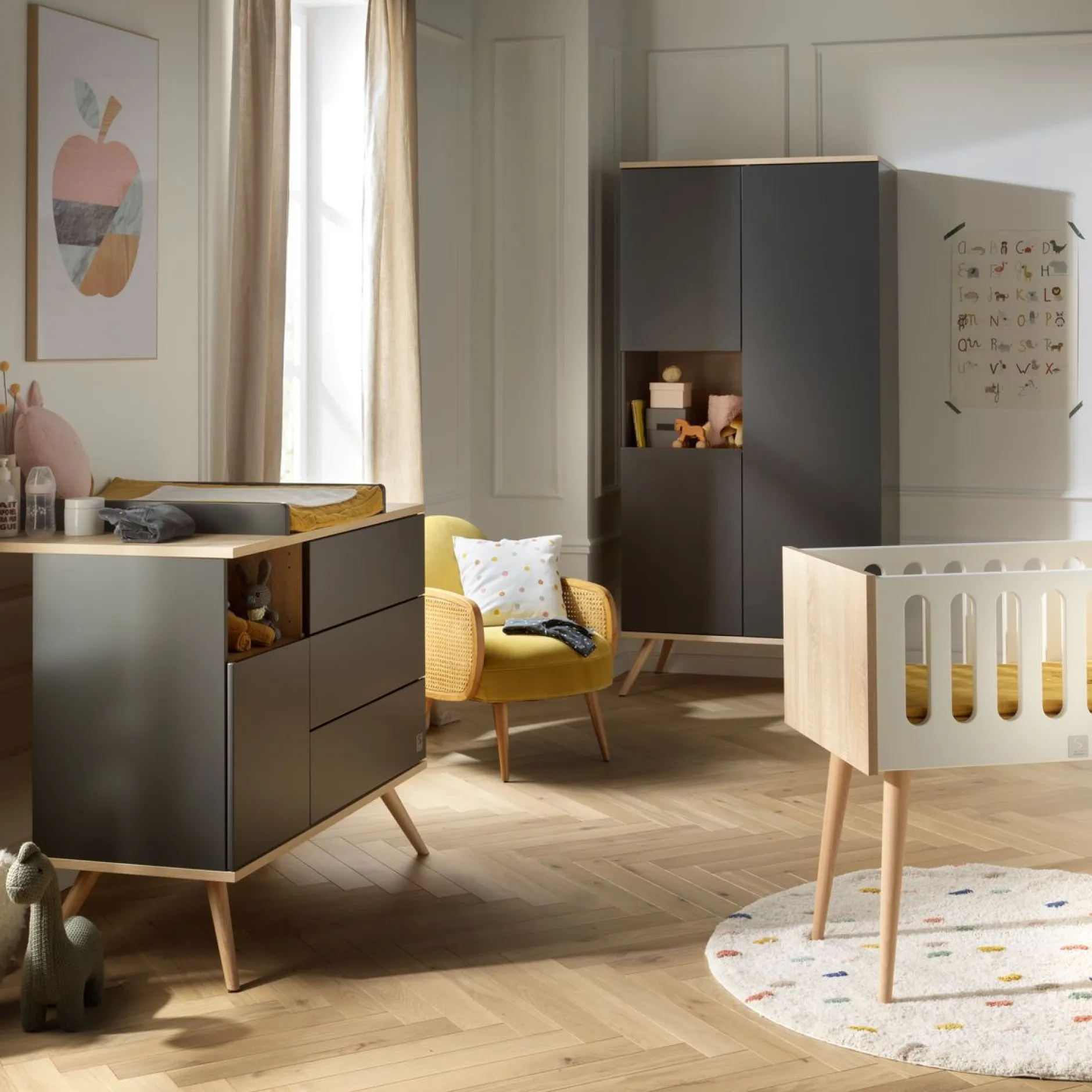 Elle est dotée de 3 portes derrière lesquelles se cachent de grandes étagères et des penderies pour les vêtements et les accessoires de bébé.