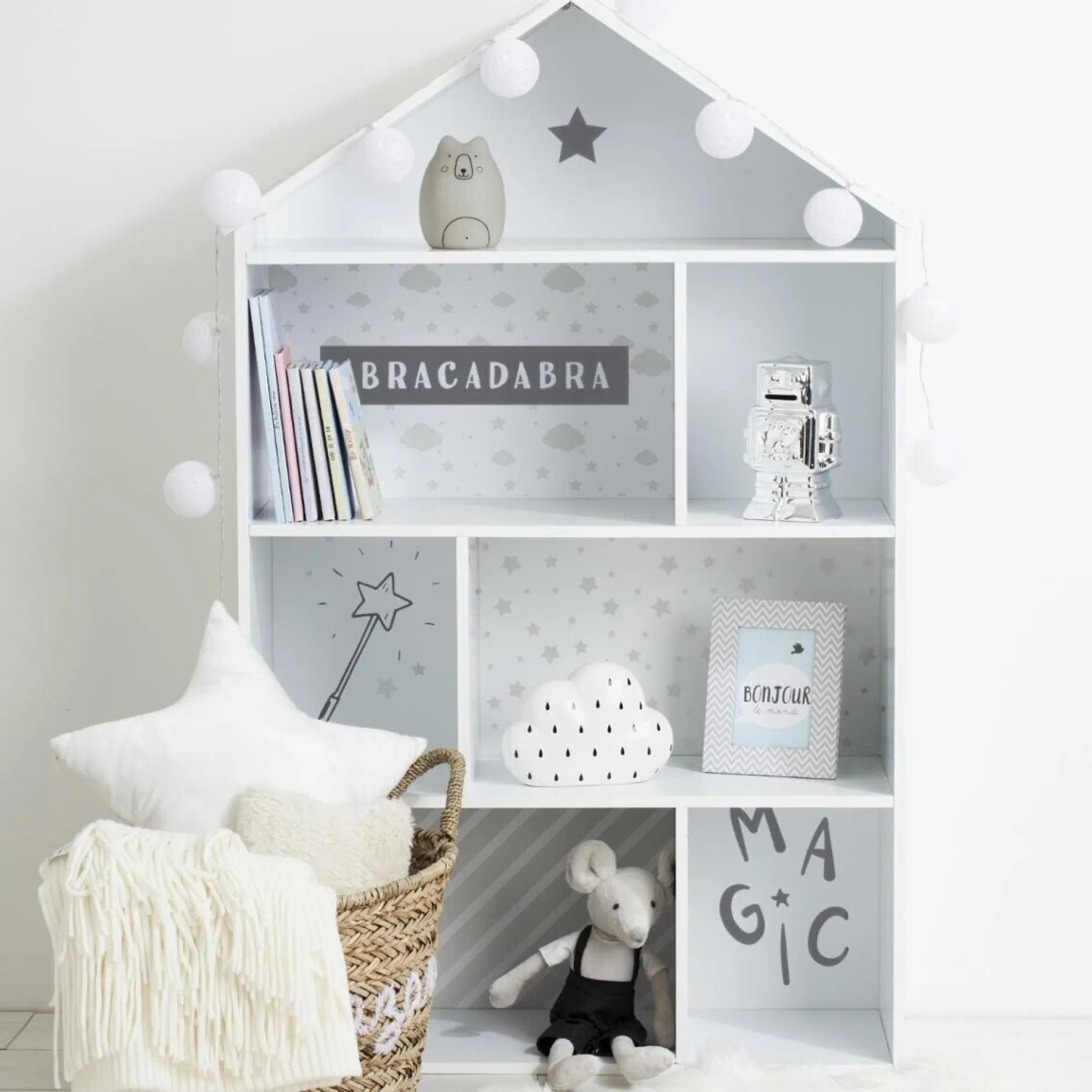 Bibliothèque maison 7 cases, idéal pour ranger les livres et les jouets de votre enfant. Plus grand il pourra même l’utiliser comme maison de poupée. Coloris gris.