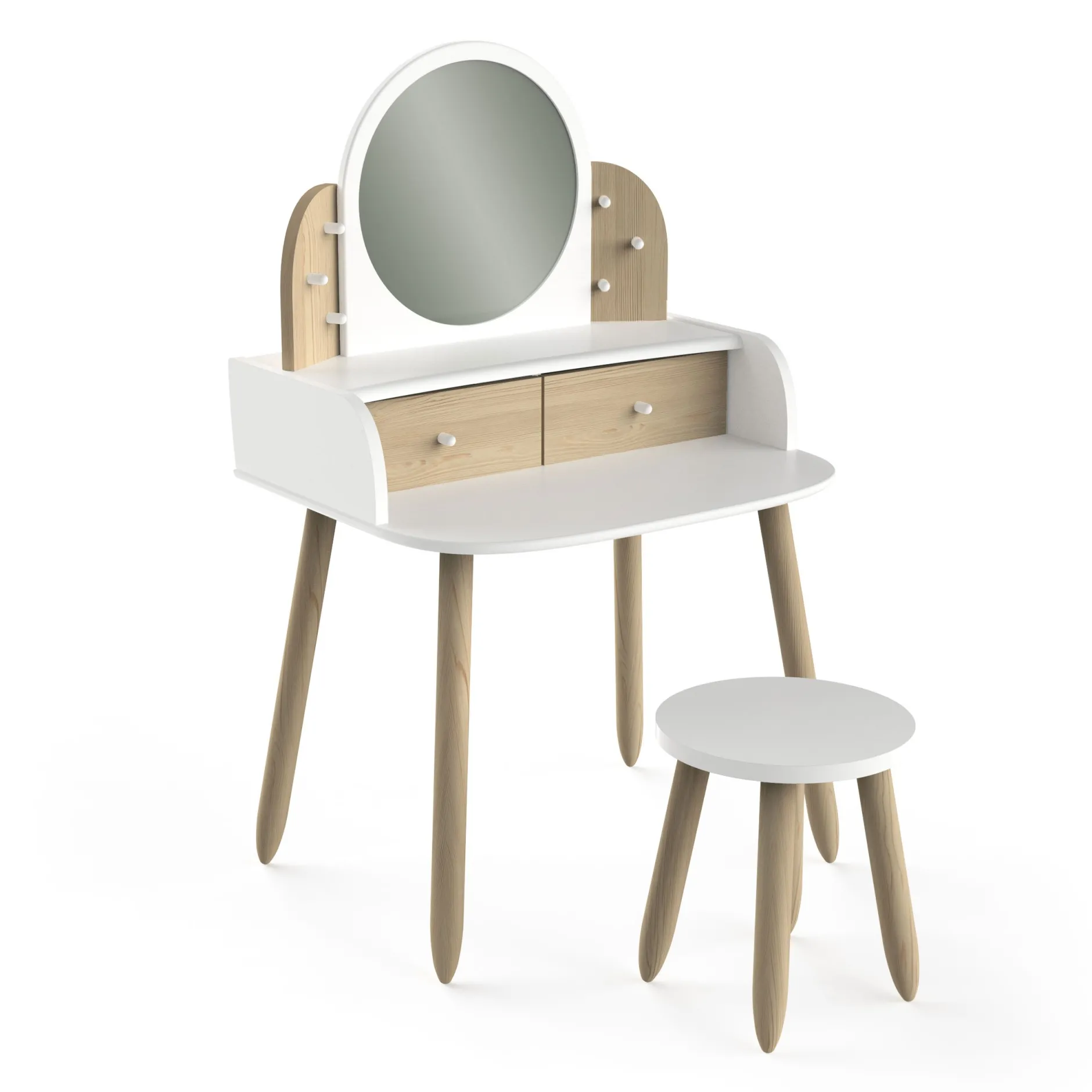 Une coiffeuse avec son petit tabouret, composée d’un miroir, d’une tablette et de 2 tiroirs en bois naturel & blanc.