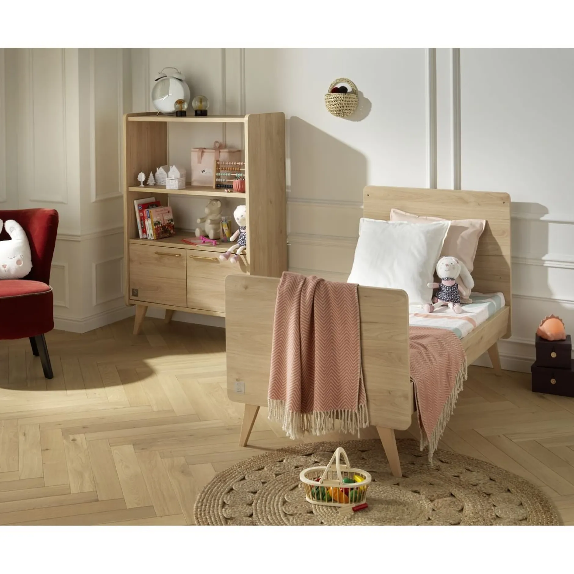 Des lignes rétro en panneaux décor Chêne Suave avec des finitions arrondies pour une chambre cocooning inspirée des tendances vintage.