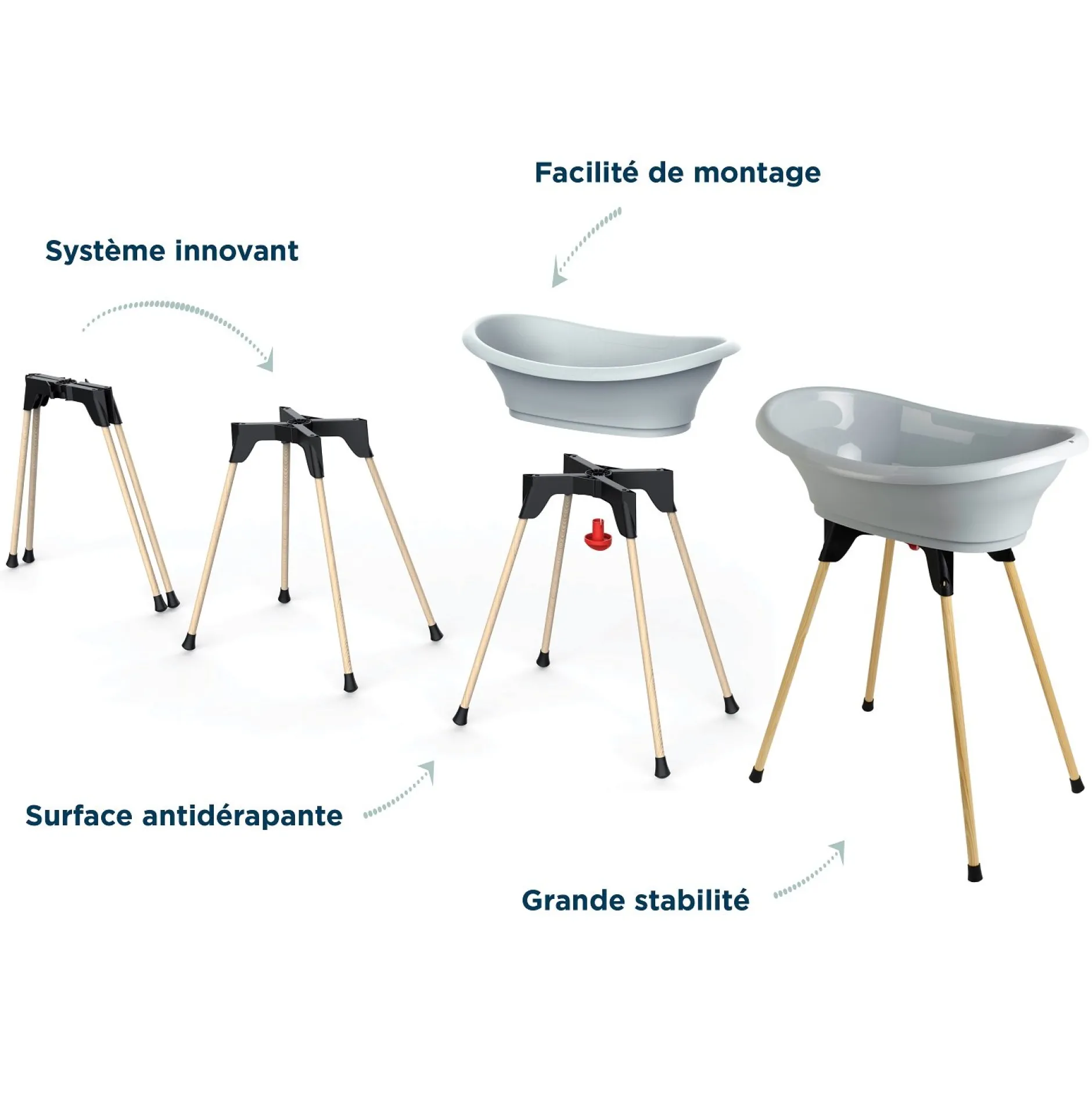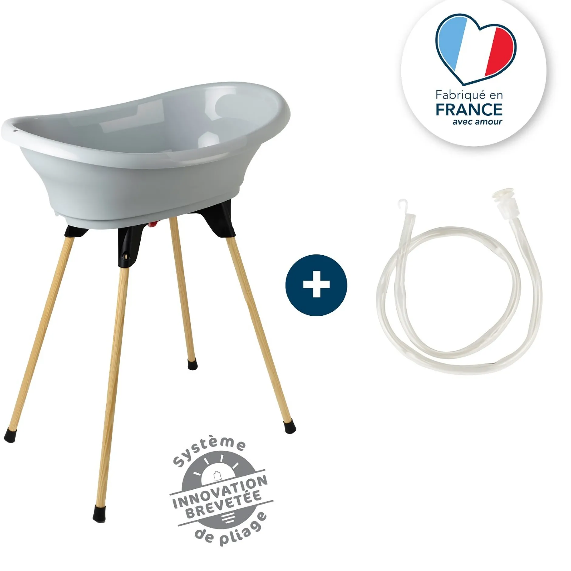De plus, la baignoire VASCO peut accueillir l’un de nos transats, afin que bébé soit à l’aise lors du bain. Le pied fabriqué en bois, est léger et design. Il se plie et se déplie pour un rangement facile dans les petits espaces, c’est un gain de place assuré contrairement aux autres supports de baignoire traditionnels. Un fois plié, il peut se ranger derrière la porte de la salle de bain ! Lorsque le bain est fini, le tuyau de vidange permet de vider la baignoire sans effort, pratique pour soulager le dos des parents. Le kit VASCO devient l’indispensable de vos salles de bain !