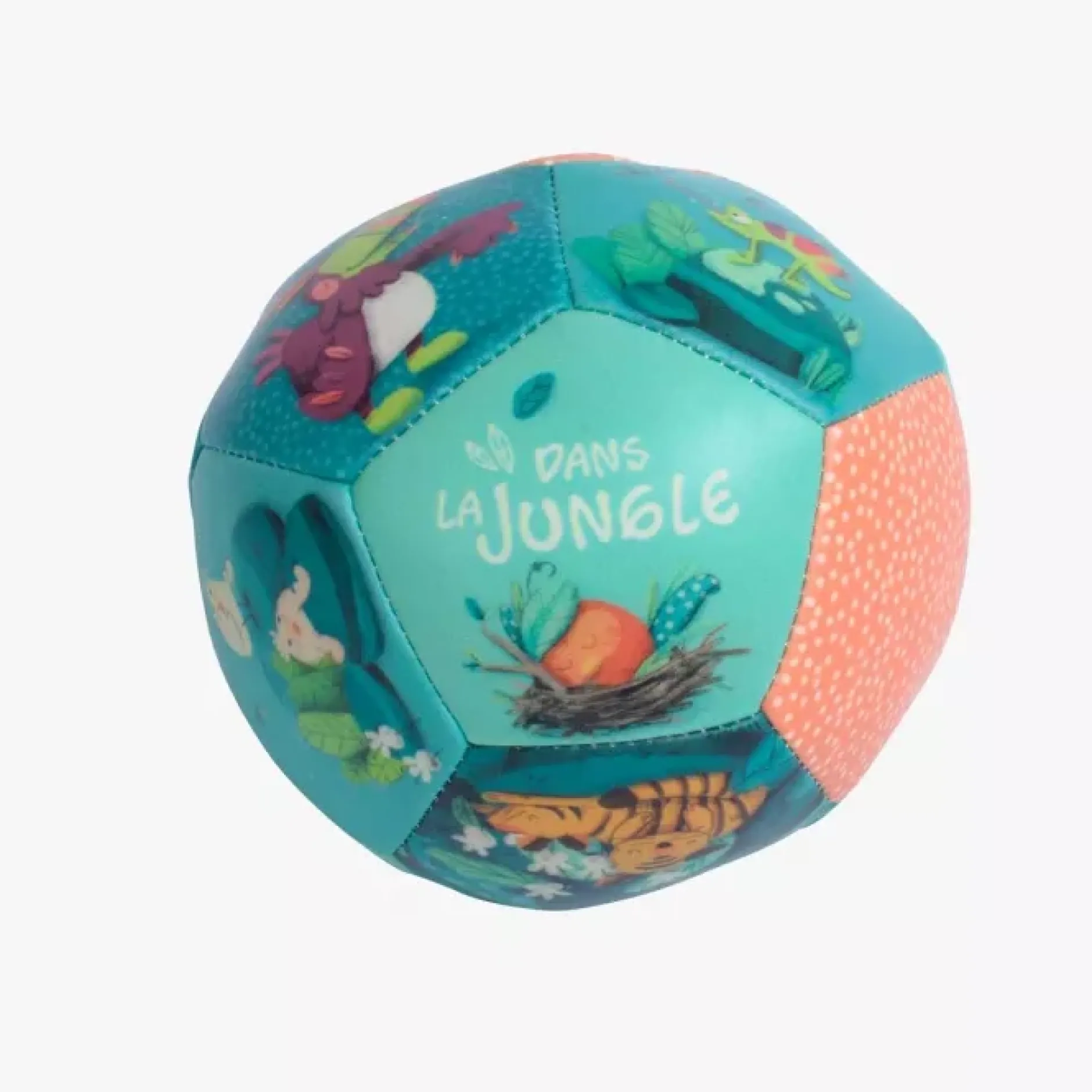 Balle souple en vinyle pour jouer à l’intérieur comme à l’extérieur de la maison, aux différentes faces colorées et illustrées avec les personnages de la collection.