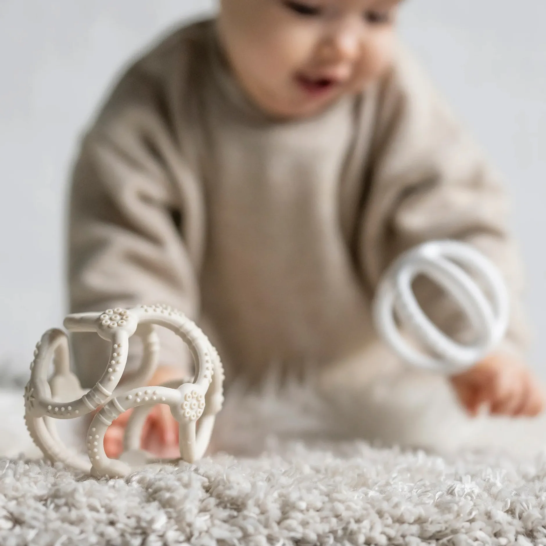 De plus, les deux boules peuvent s’emboîter pour former un seul objet de jeu. Il n’y a pas plus multifonctionnel! Anneau de dentition en silicone avec surface rugueuse pour masser les gencives et soulager les maux de dents.