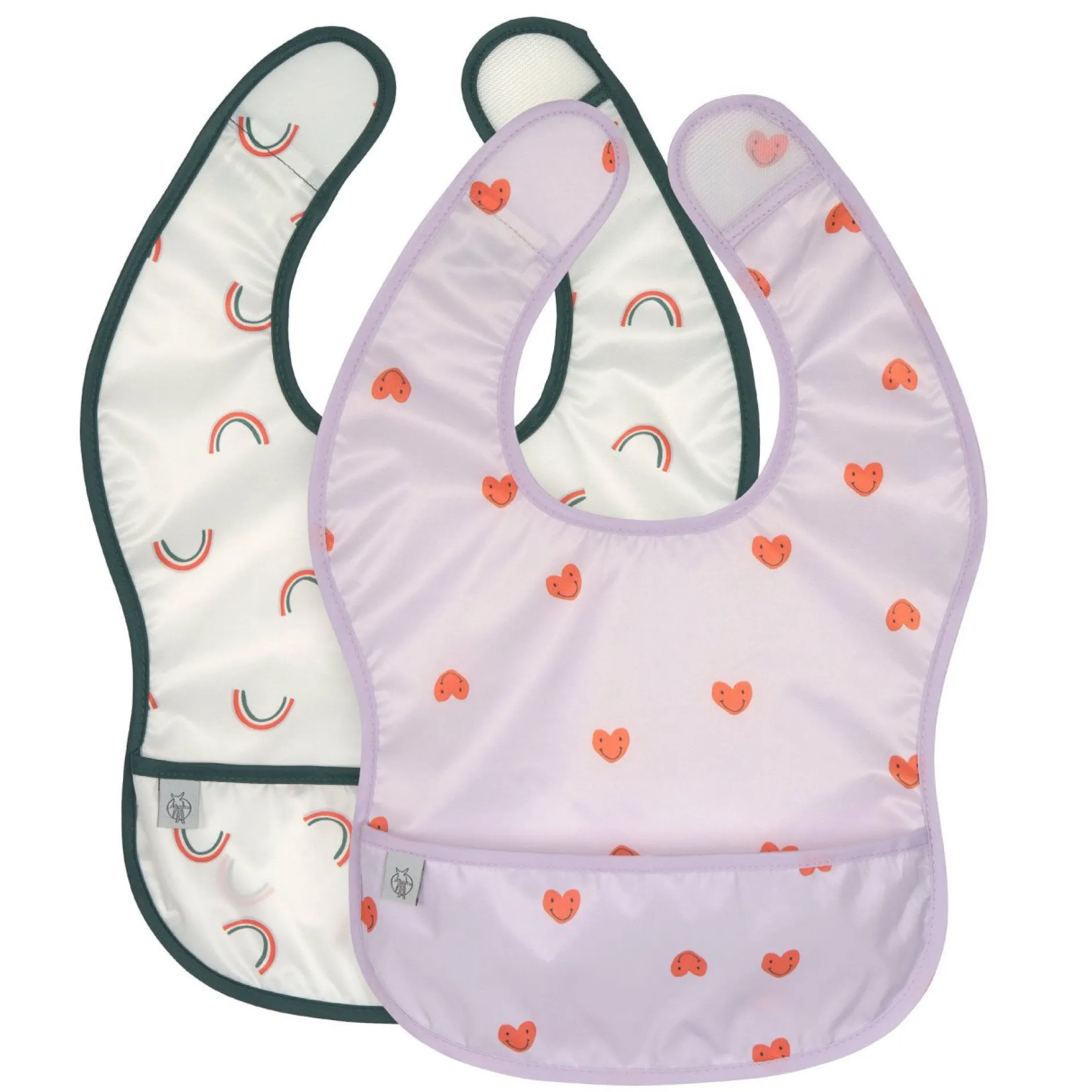 Le pack de deux bavoirs légers et compacts se décline en deux modèles différents et se glisse dans tous les sacs, idéal pour les repas lors des sorties. Lavables à 40°C.