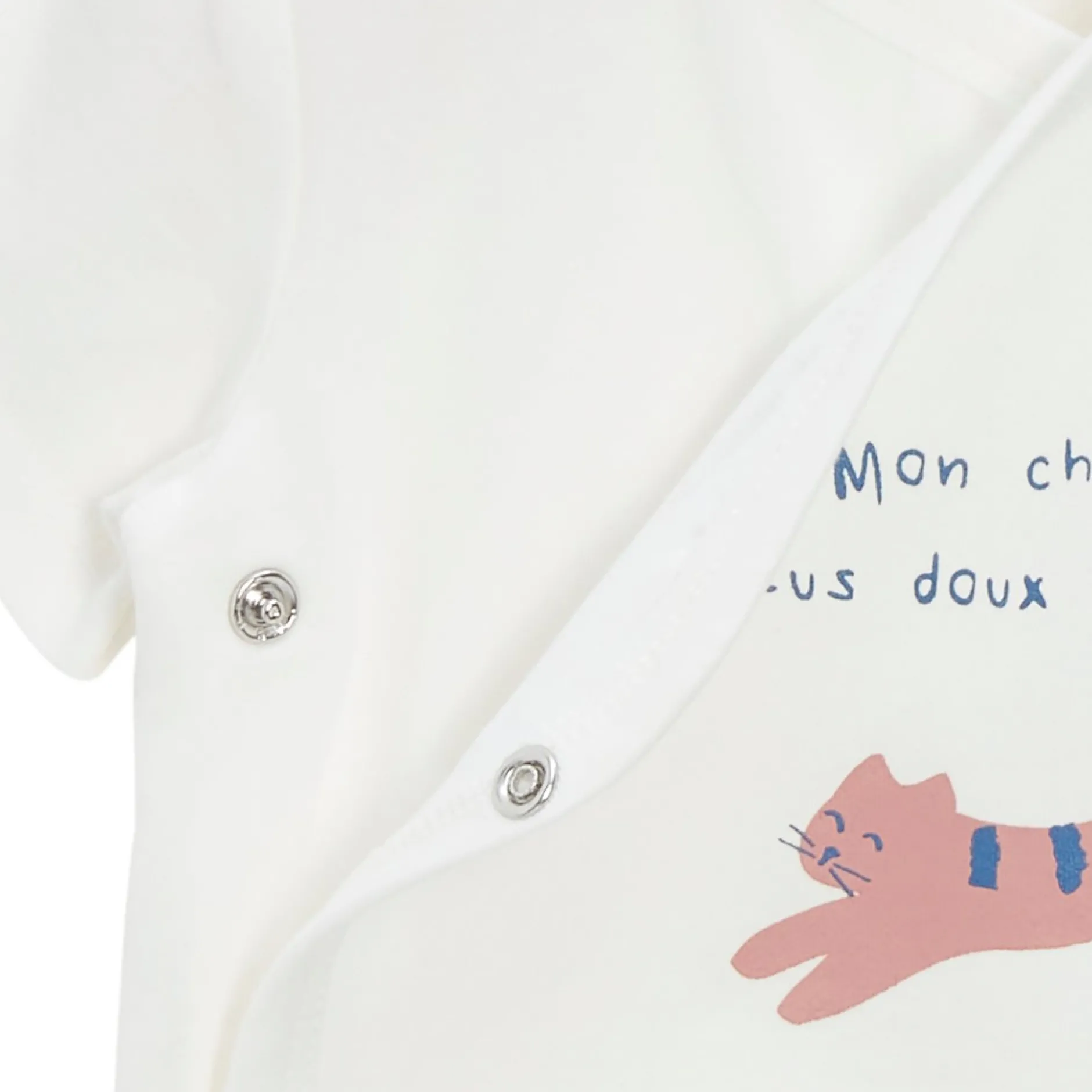 Body manches courtes Marèse en jersey écru. Très belle animation ludique devant représentant un petit chat qui court avec un texte : » Mon chat le plus doux du monde ». Très fonctionnel avec ouverture devant et entrejambes par pressions pour davantage de fonctionnalité. Très beau produit qui s’associe avec toutes les silhouettes et qui en plein été peut se porter tout seul. Lavage conseillé à 30°C.