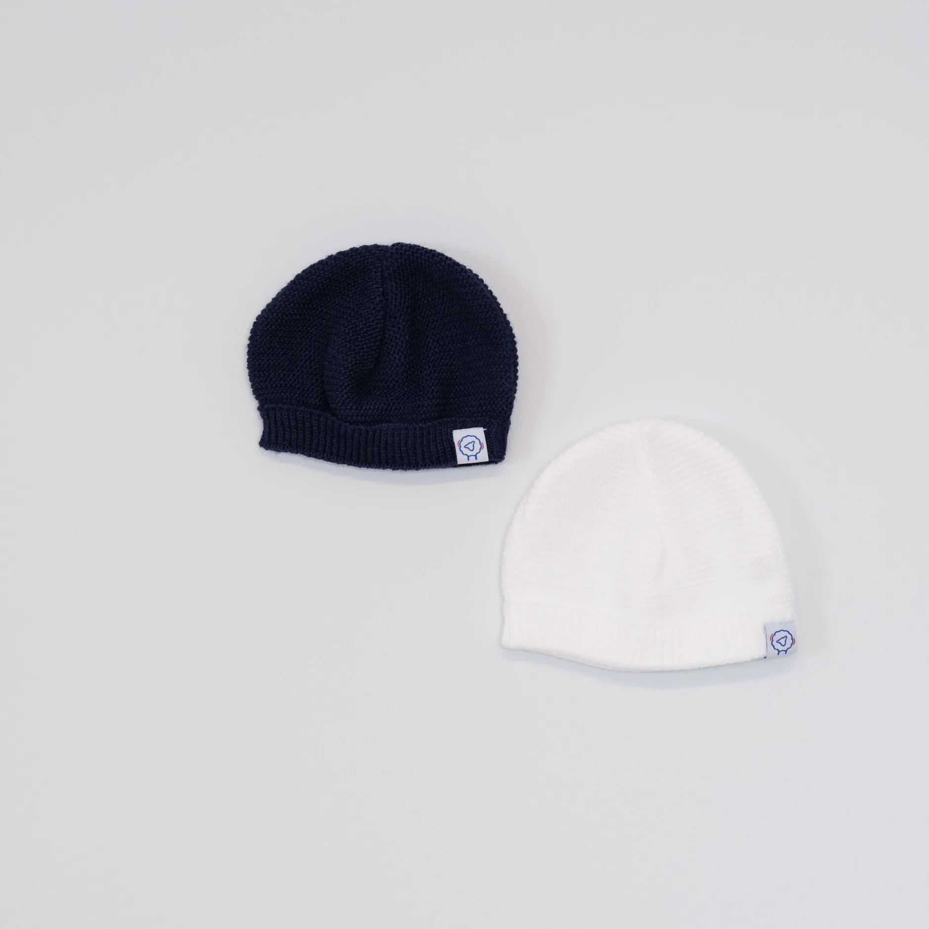 Lot de 2 bonnets de naissance tricotés en France, assemblés en tunisie.