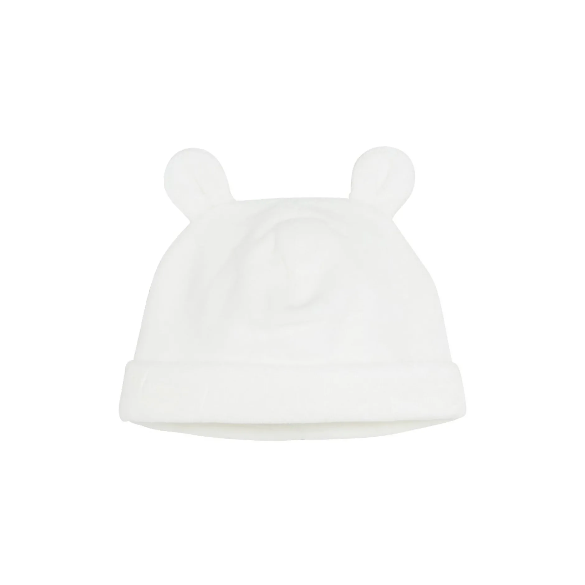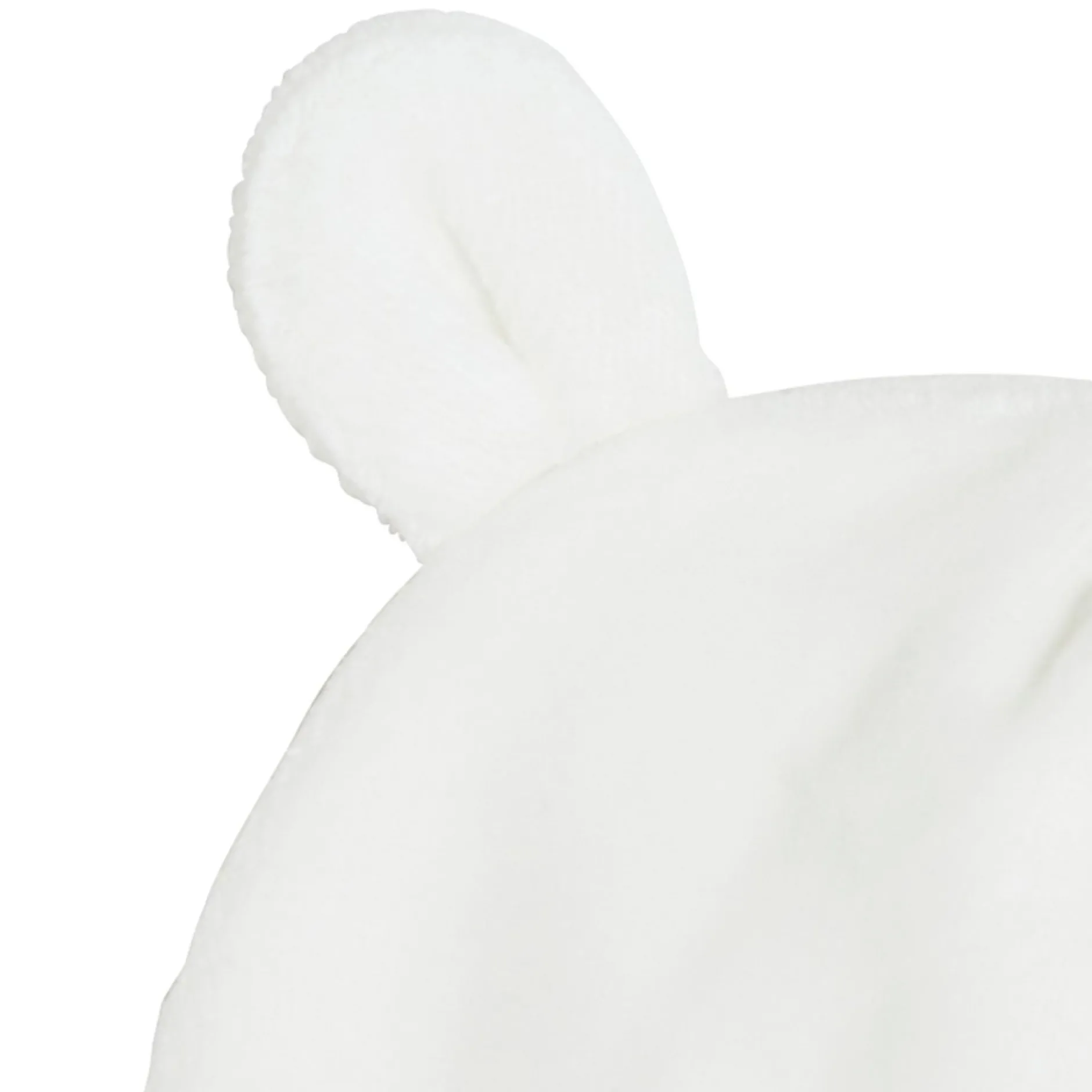 Bonnet Marèse en velours écru. Doublé de jersey écru pour le confort et la chaleur. Il allie fonctionnalité et côté ludique avec ses petites oreilles en volume et qui rappellent les oreilles du petit ourson, la mascotte du thème. Le parfait accessoire qui finit bien les silhouettes tout en maintenant la tête de bébé bien au chaud.