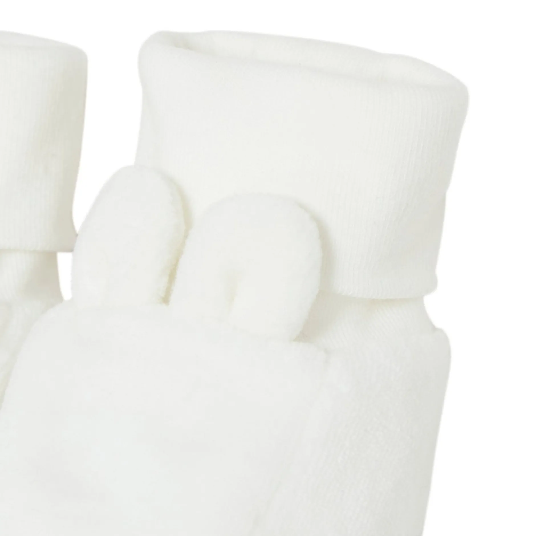 Chaussons Marèse en velours écru. Bord côtes aux chevilles pour faciliter le passage du pied de bébé. Ils allient fonctionnalité et côté ludique avec les petites oreilles en volume et qui rappellent les oreilles du petit ourson, la mascotte du thème. Le parfait accessoire qui finit bien les silhouettes tout en maintenant les petits petons de bébé bien au chaud.