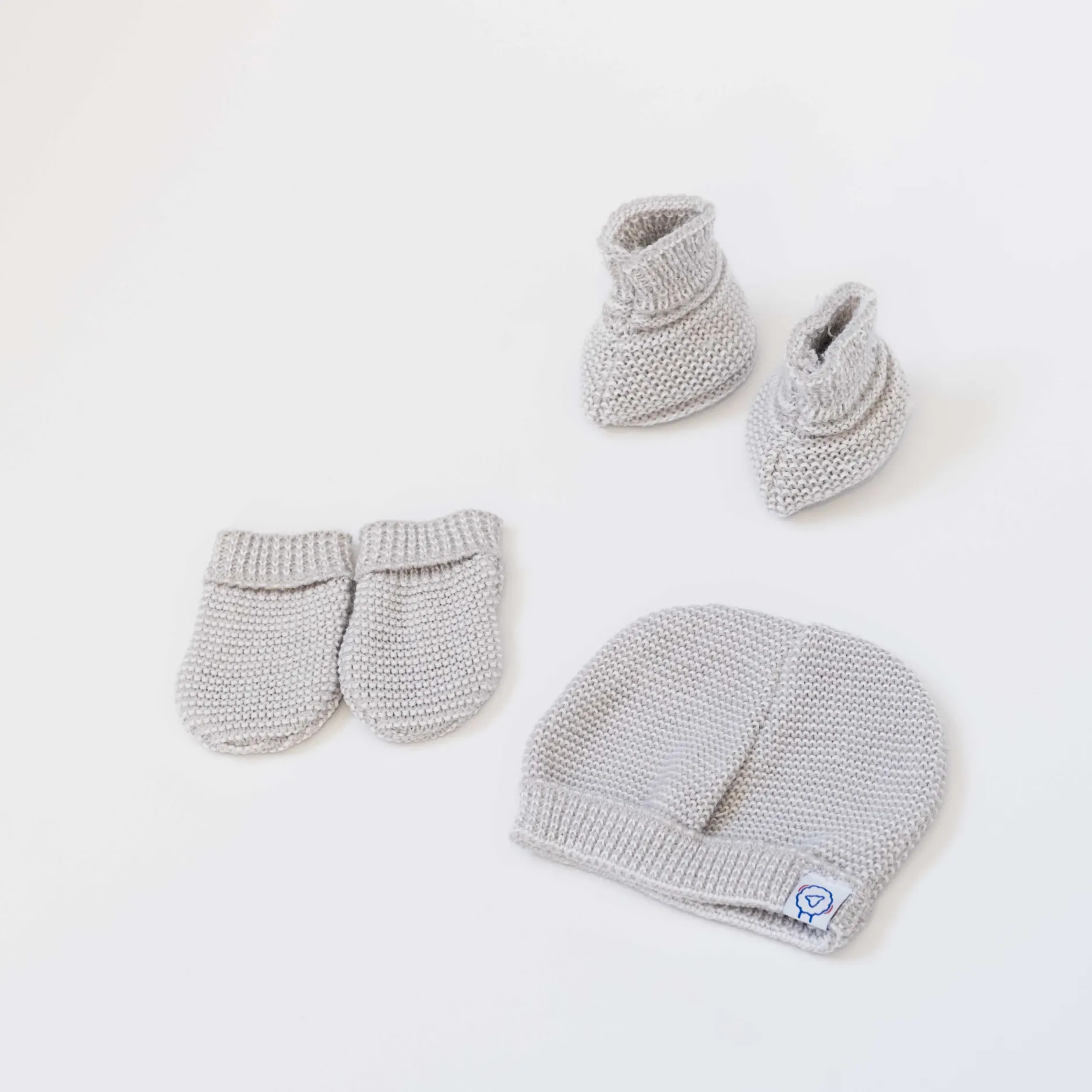Vous cherchez les premiers accessoires indispensables pour votre bout de chou ? Découvrez le trousseau naissance de P’tit bisou, composé de moufles, d’un bonnet et de chaussons. Idéal pour la naissance !