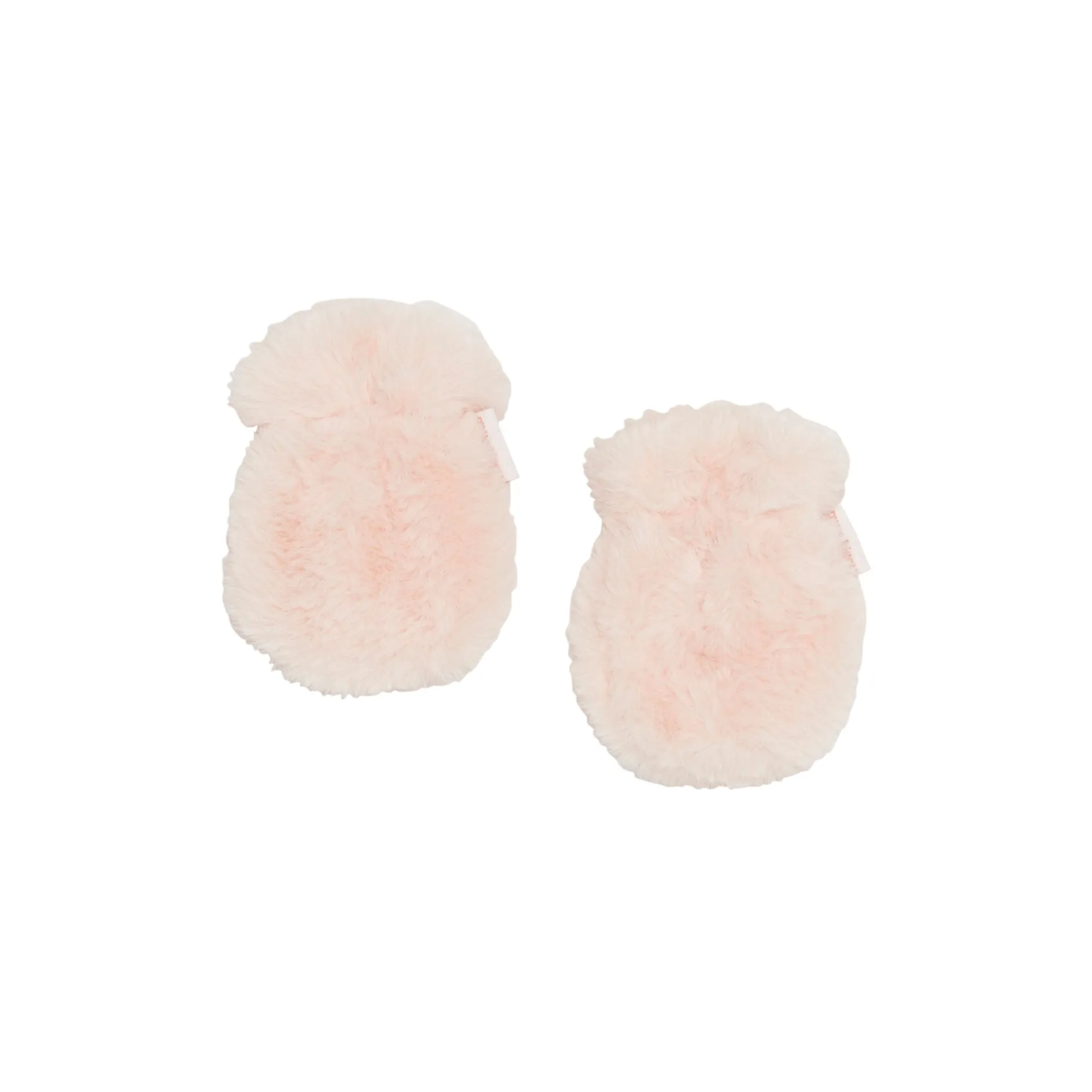 Moufles P’tit Bisou en fausse fourrure très douce rose pâle doublée de jersey uni rose.