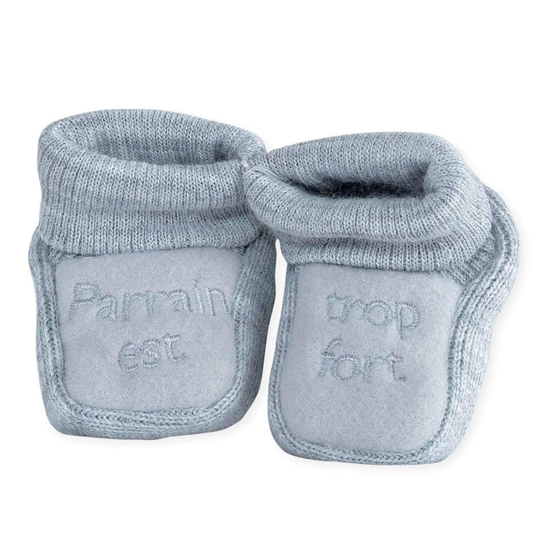 Paire de chaussons naissance à revers, avec broderie argentée. Différents modèles au choixCaractéristiques :Taille …