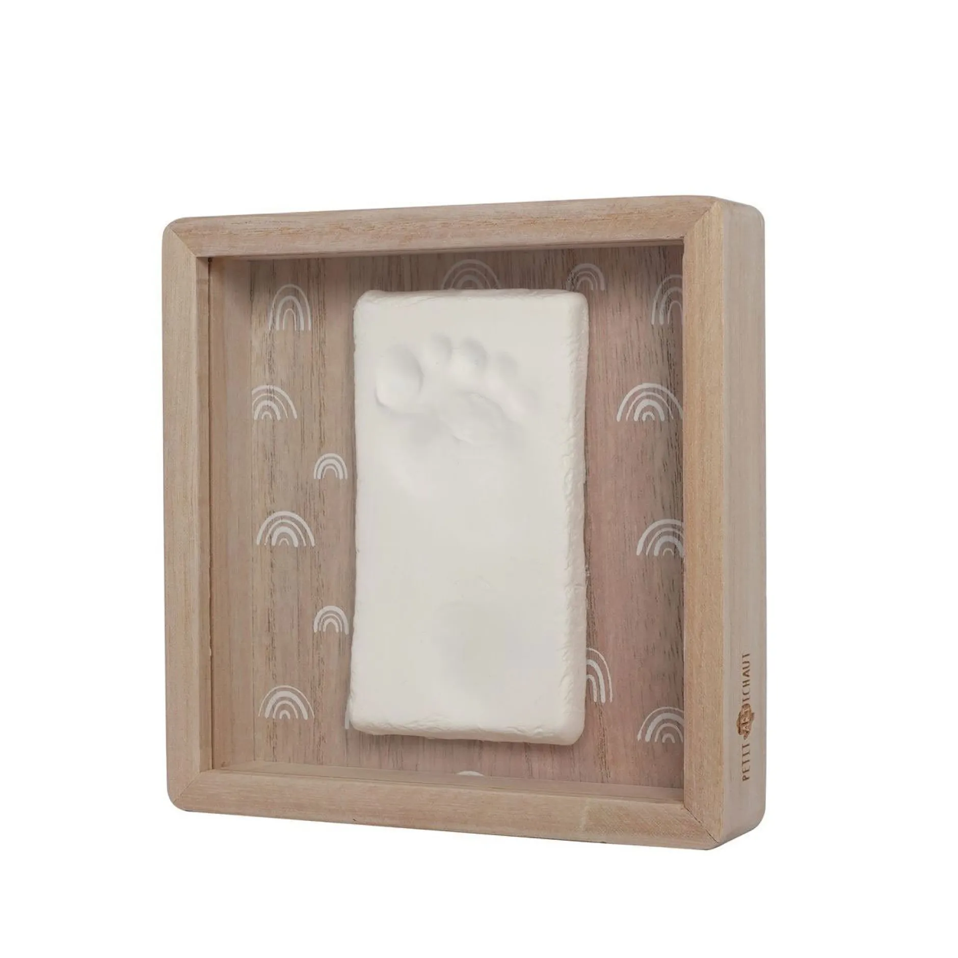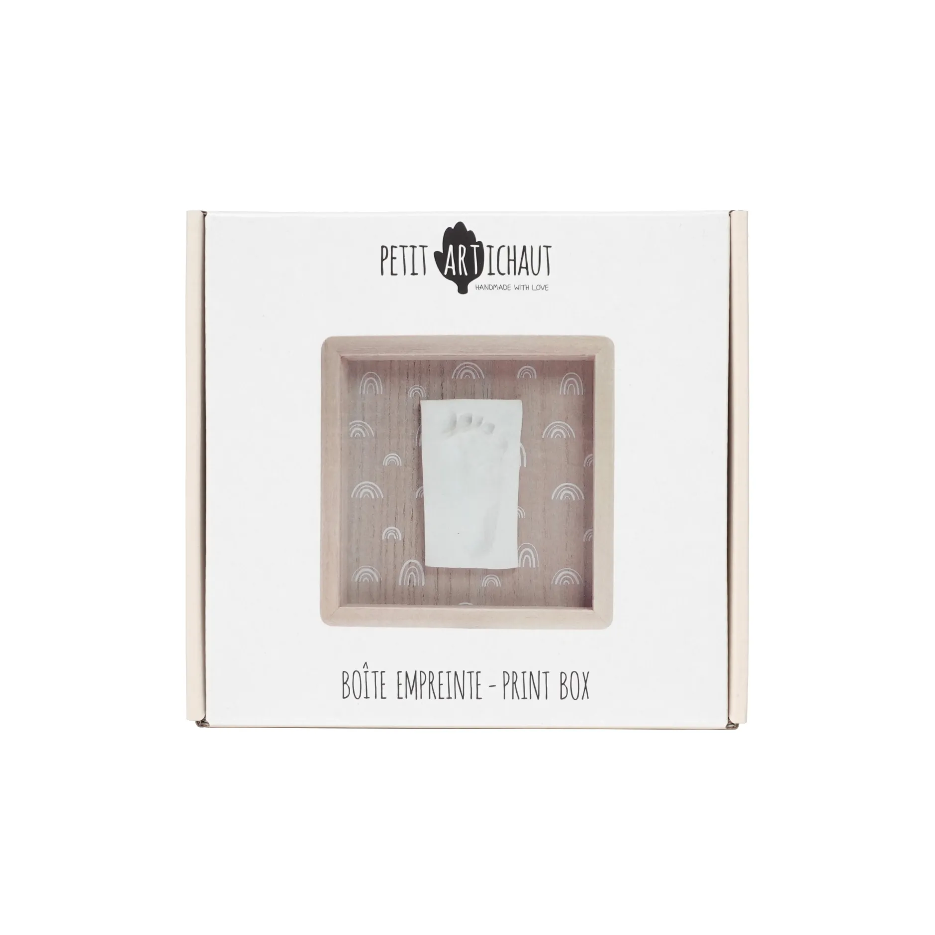 La Boîte Empreinte – Rainbow permet de créer un souvenir des petites mains ou des petits pieds de bébé. Cet élégant cadre carré avec son motif arc- en-ciel peut être posé sur un meuble ou fixé au mur pour décorer n’importe quel espace de la maison. Il comprend un cadre en bois avec couvercle de protection, un sachet de pâte hypoallergénique, un rouleau et un descriptif pour créer facilement l’empreinte.