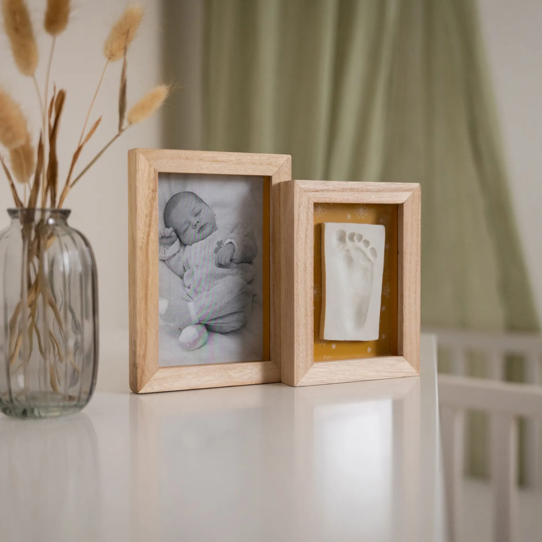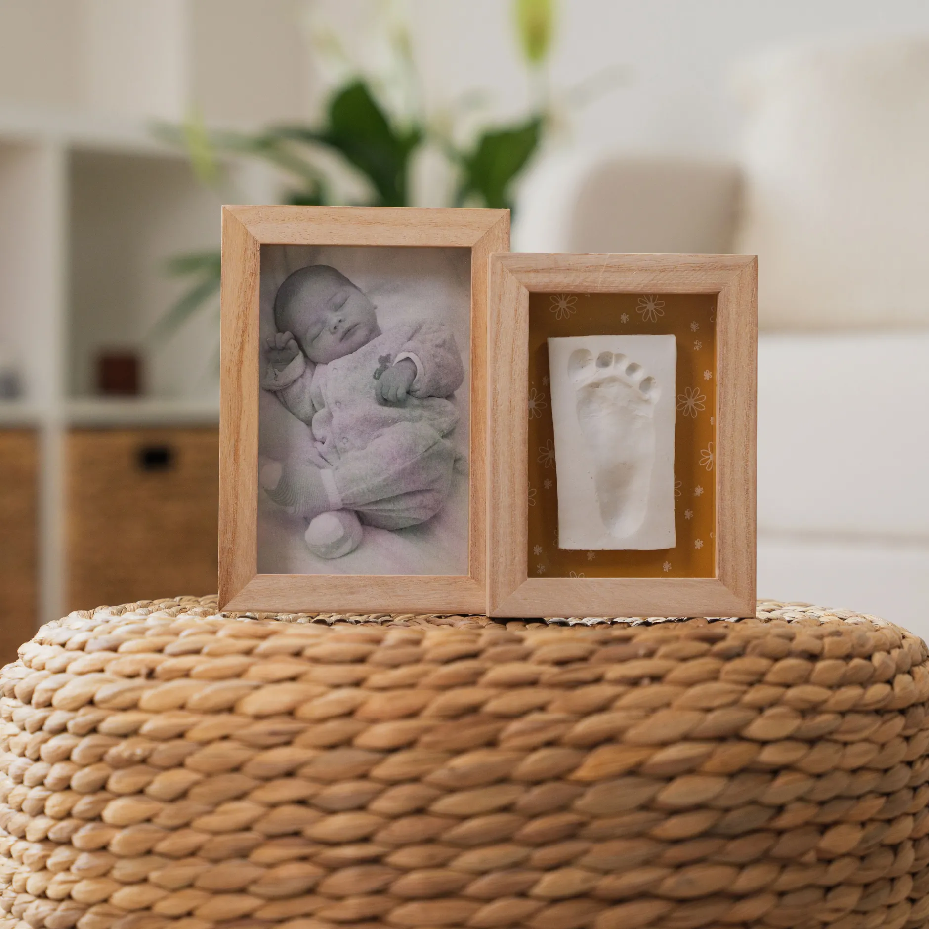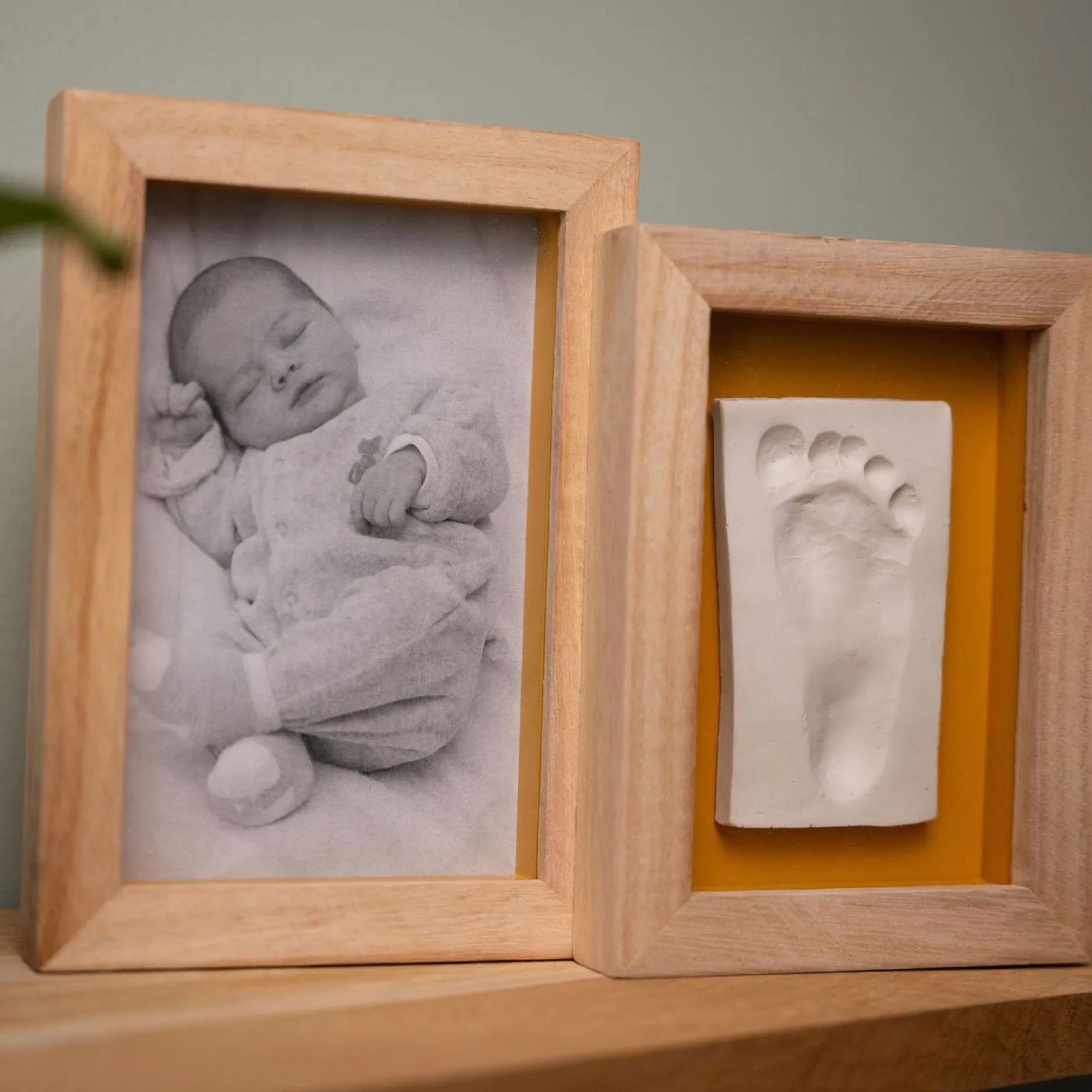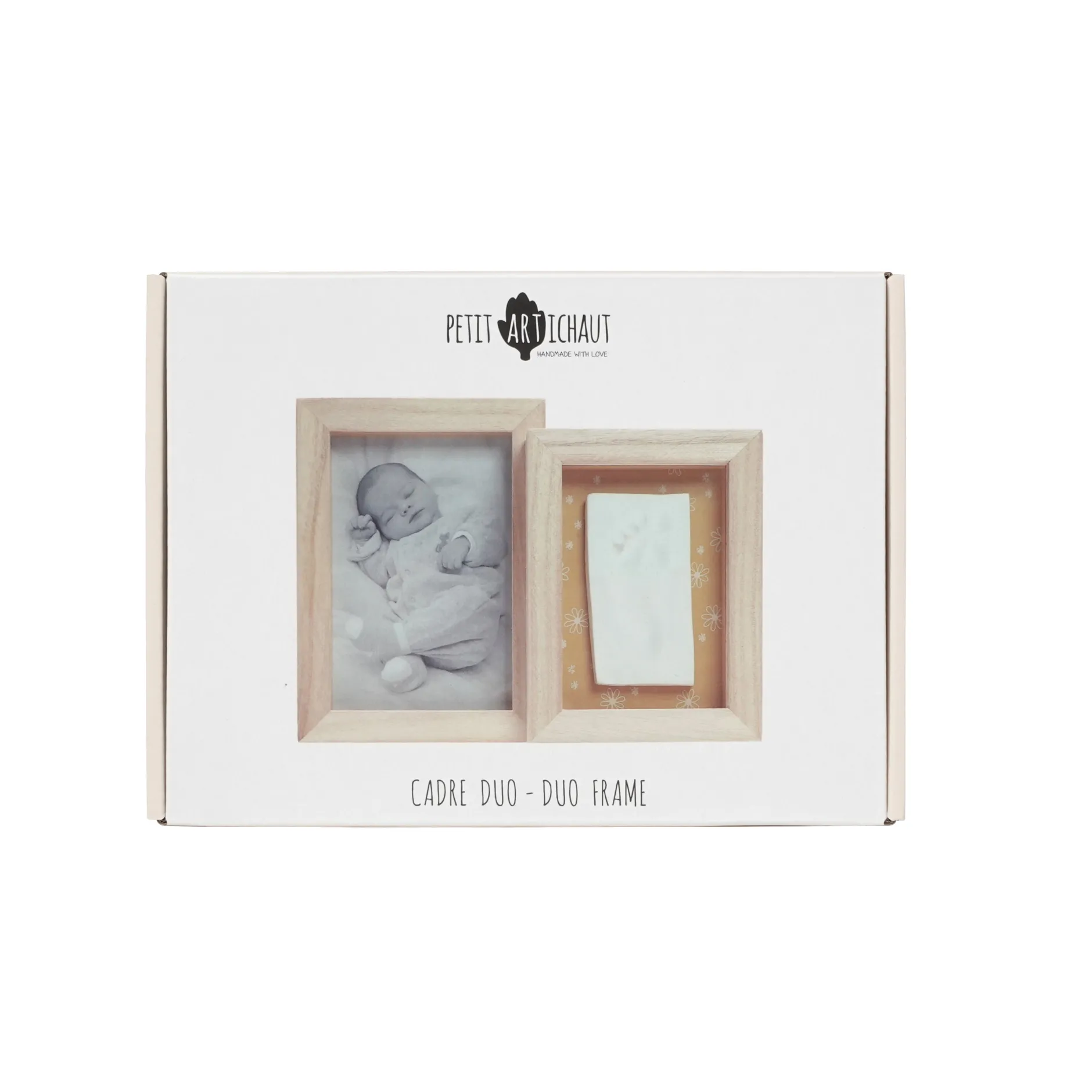 Le cadre Duo – Daisy Ochre associe harmonieusement empreinte et photo de bébé. Ce cadre à poser ajoute une touche de charme à la décoration avec son fond recto verso de couleur ochre avec ou sans motifs fleuris. Le kit comprend de la pâte hypoallergénique, un rouleau et un descriptif pour créer facilement l’empreinte.