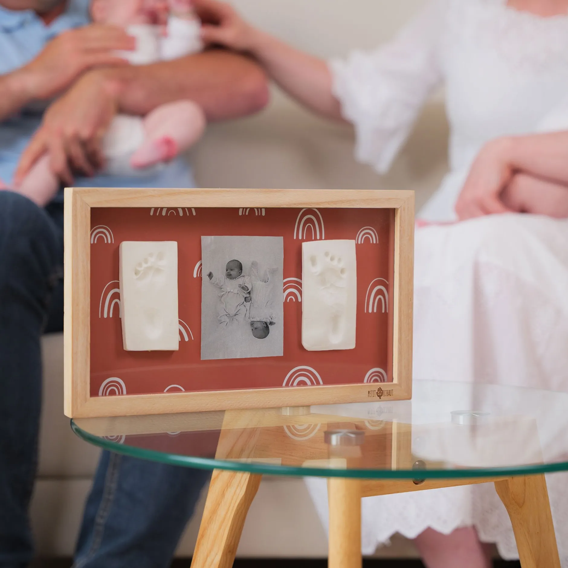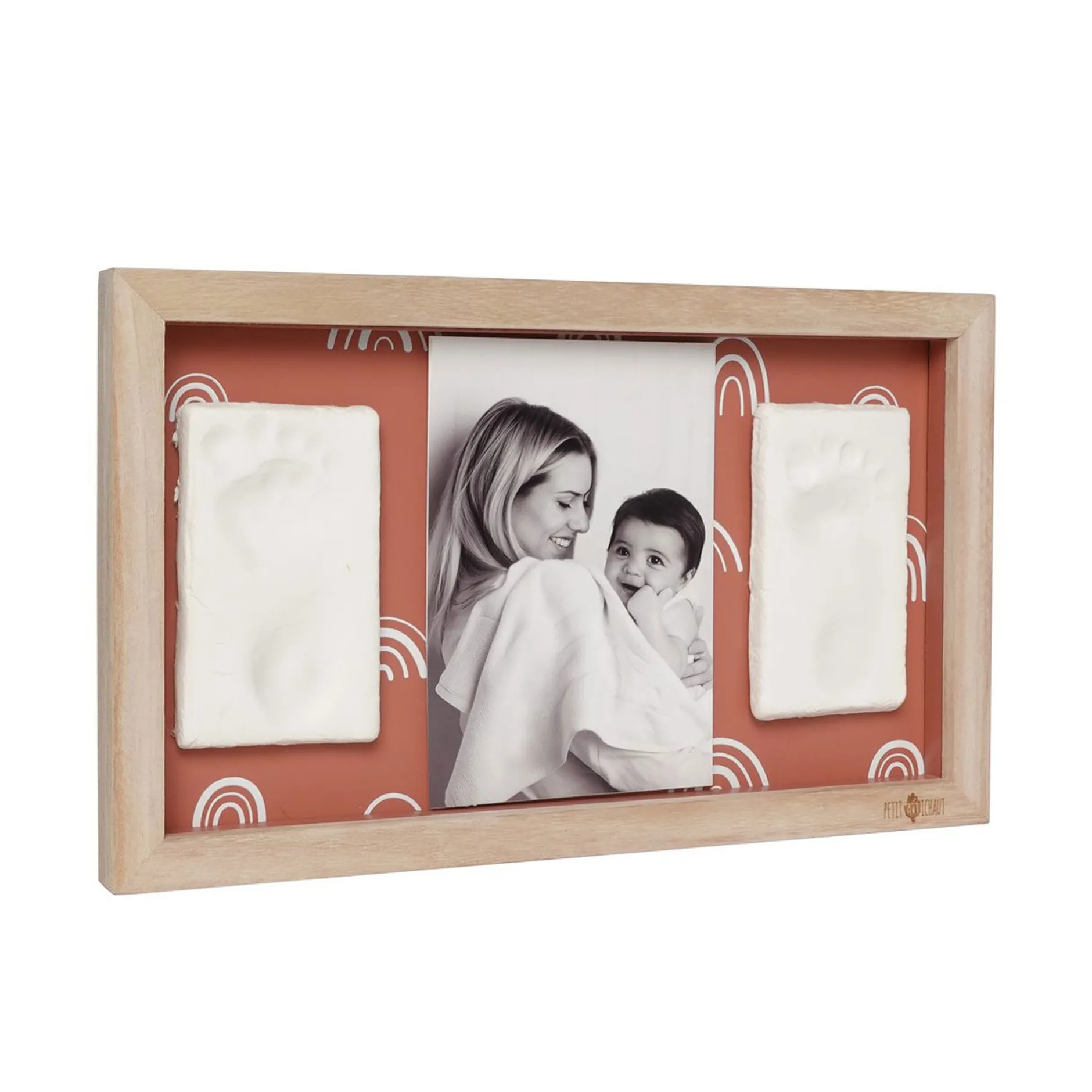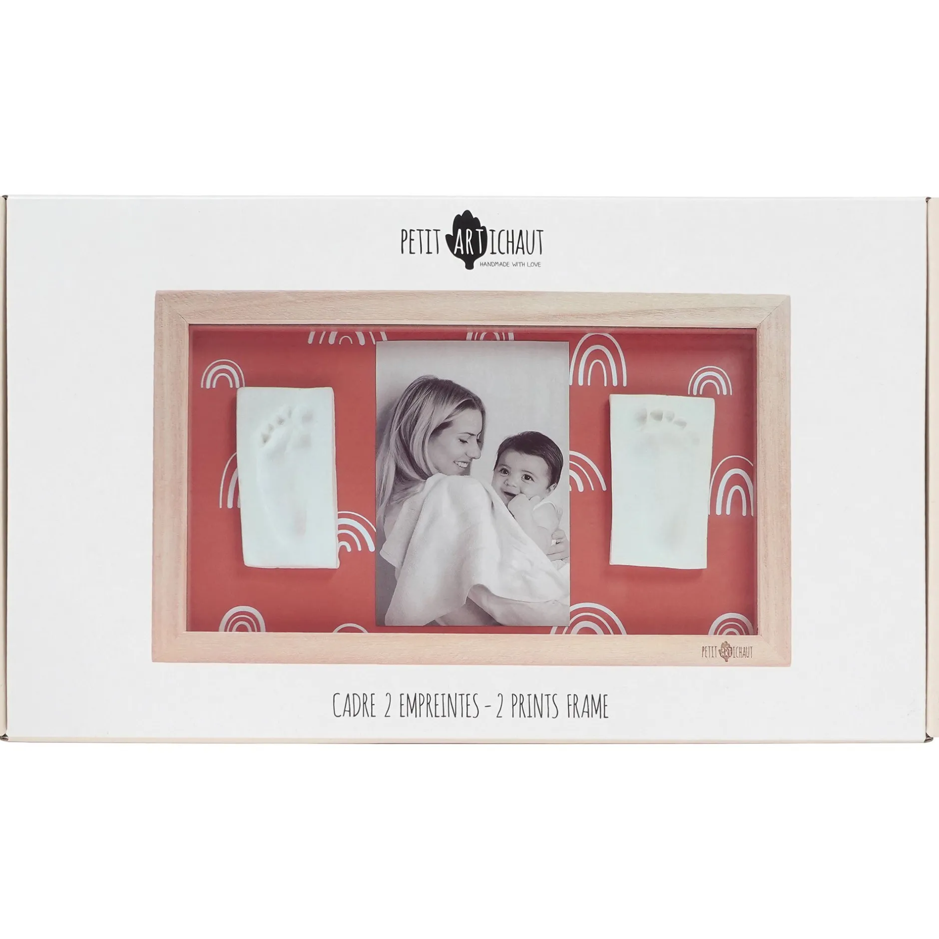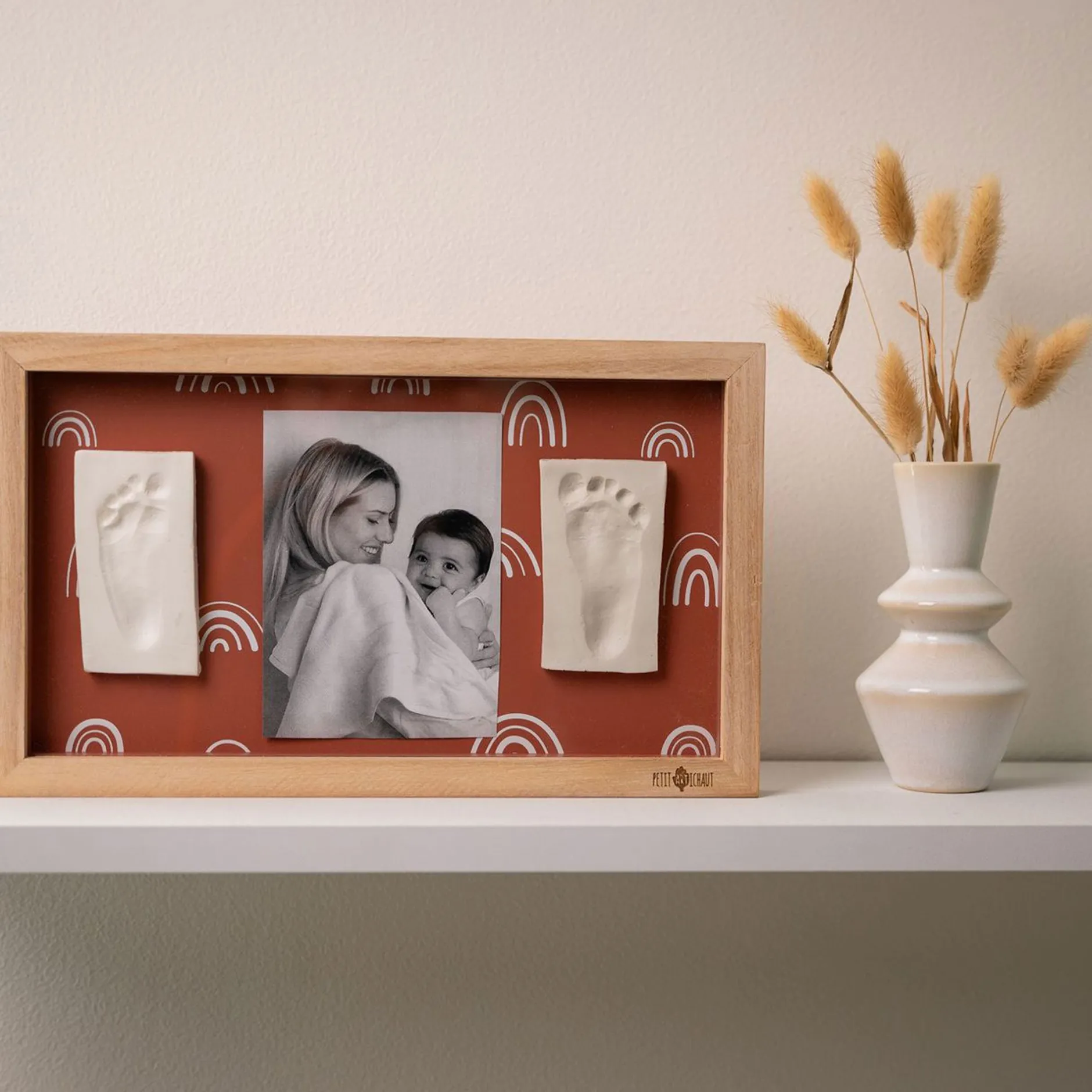 Idéal pour les jumeaux ou pour montrer l’évolution de l’enfant, le Cadre 2 Empreintes – Rainbow Terracotta offre un espace généreux pour empreintes et photo. Ce cadre long s’accroche au mur et inclut fond recto verso de couleur terracotta avec ou sans motifs arc-en-ciel. Le kit comprend de la pâte hypoallergénique, un rouleau et un descriptif pour créer facilement les empreintes.