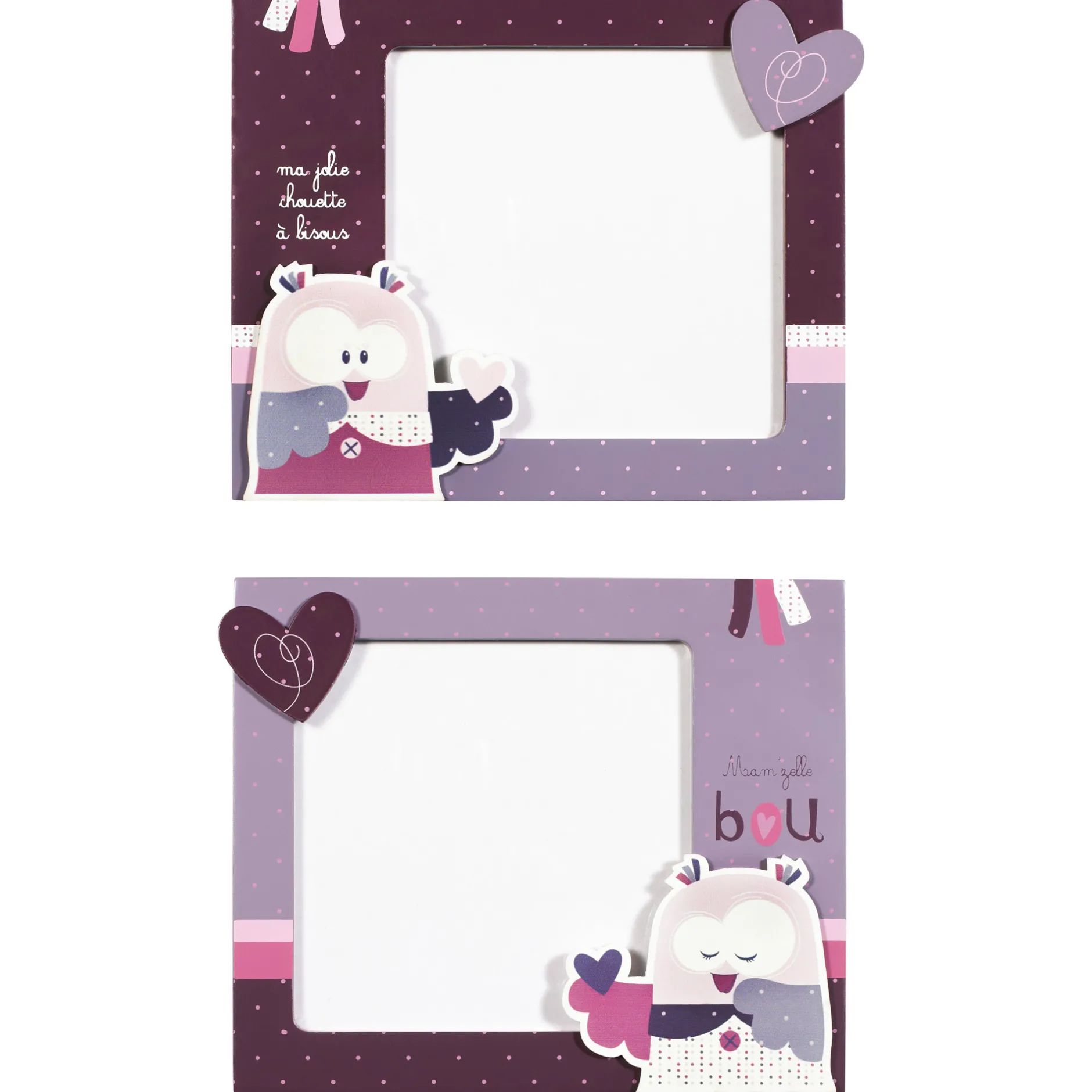 Set de 2 cadres photos à l’effigie de Mam’zelle Bou pour décorer facilement la chambre de bébé.Dimensions : 17×14.5 …