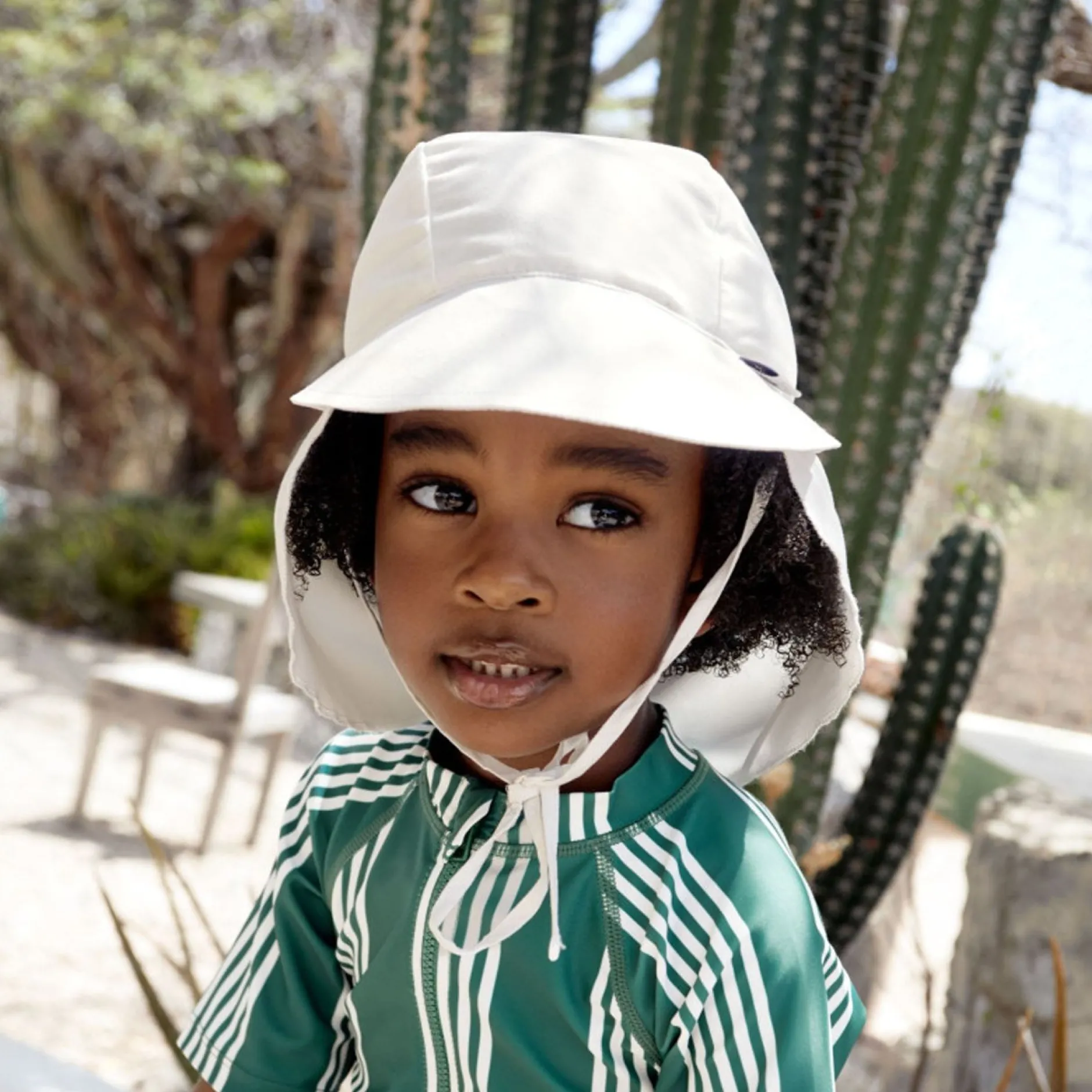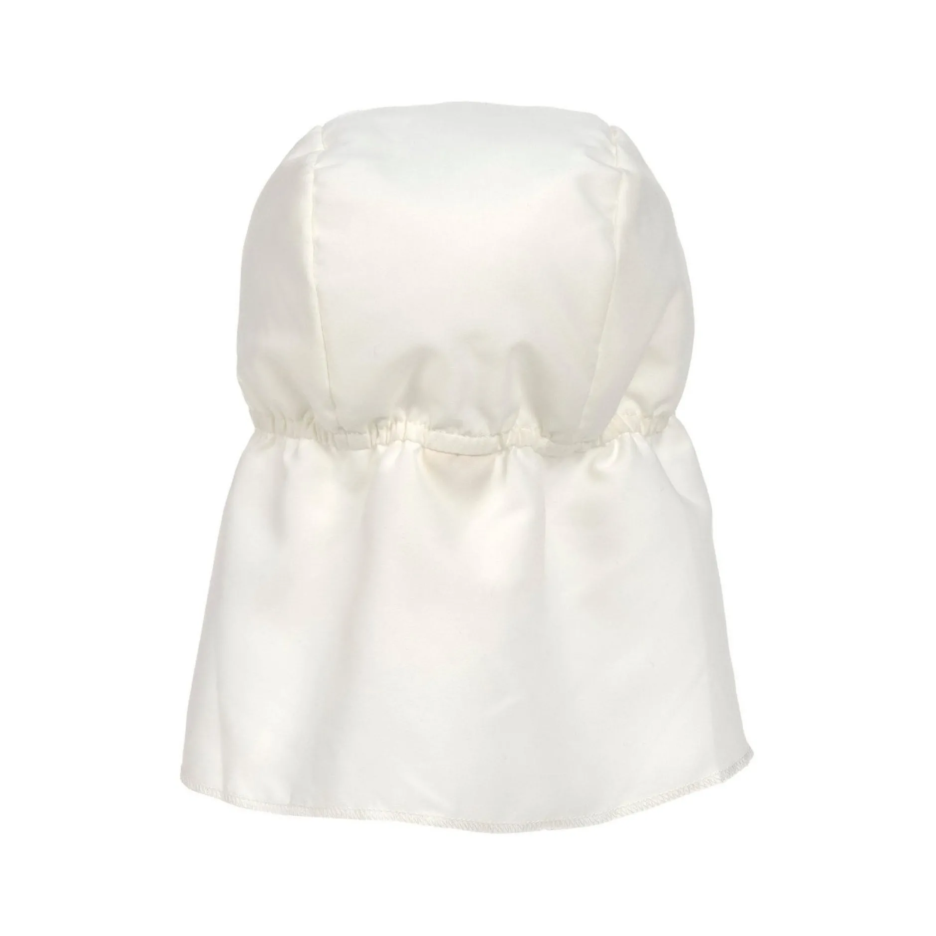 La casquette, avec sa longue protection pour la nuque, protège du soleil la tête, les yeux, les oreilles et la nuque des petits.