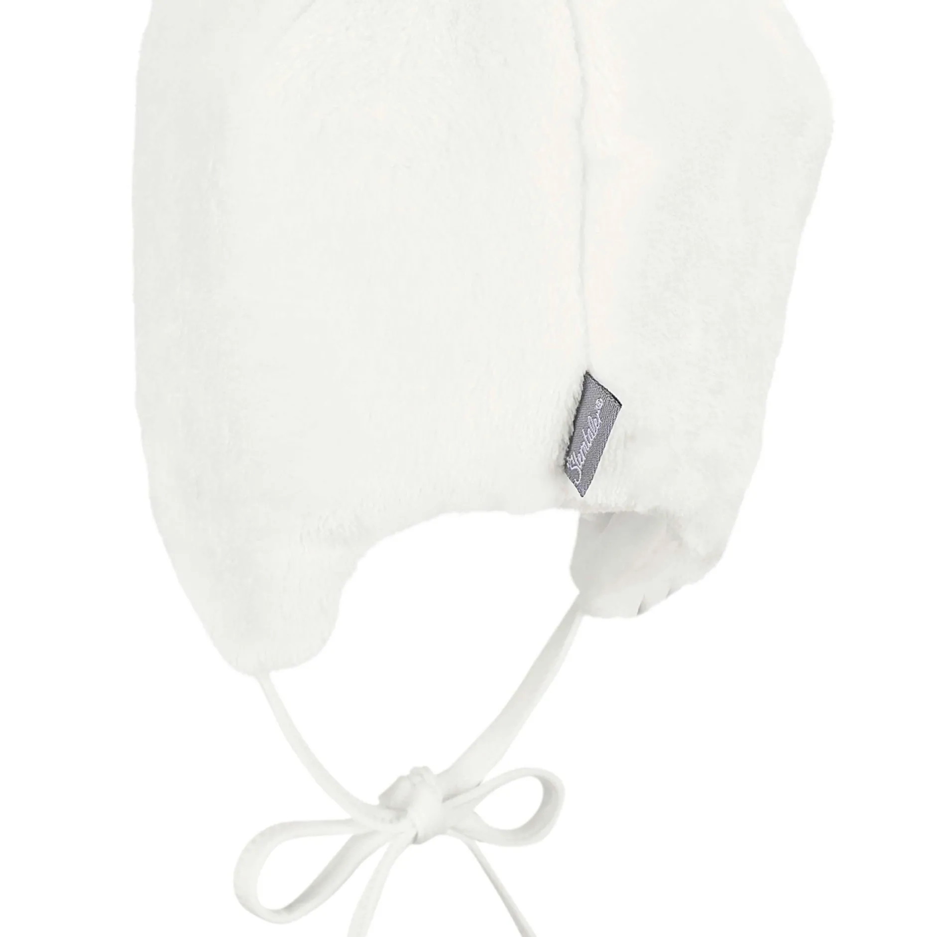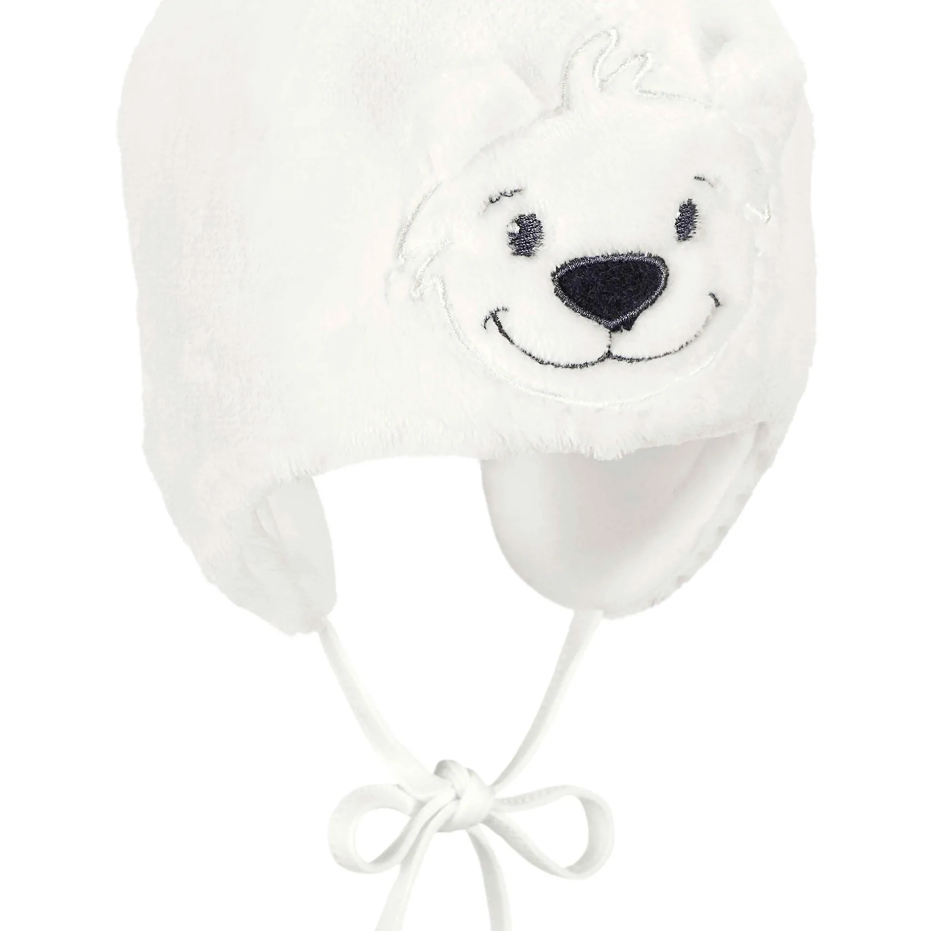Bonnet en peluche doudou avec oreillettes, nouettes et motif Ours, doublé de micropolaire.