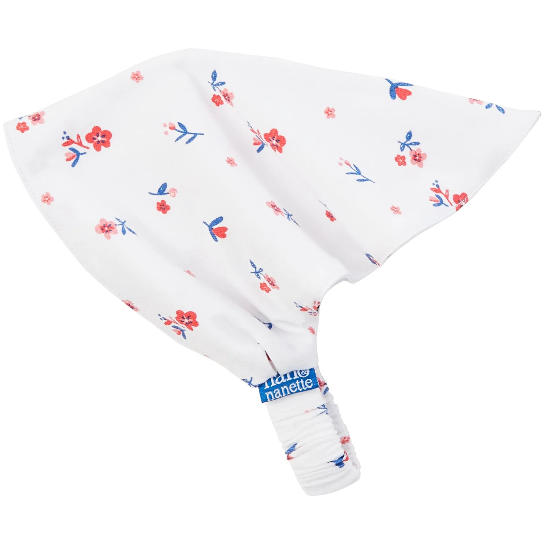 Coiffant forme fichu Nano et Nanette en jersey imprimé sur fond blanc « petites fleurettes ».