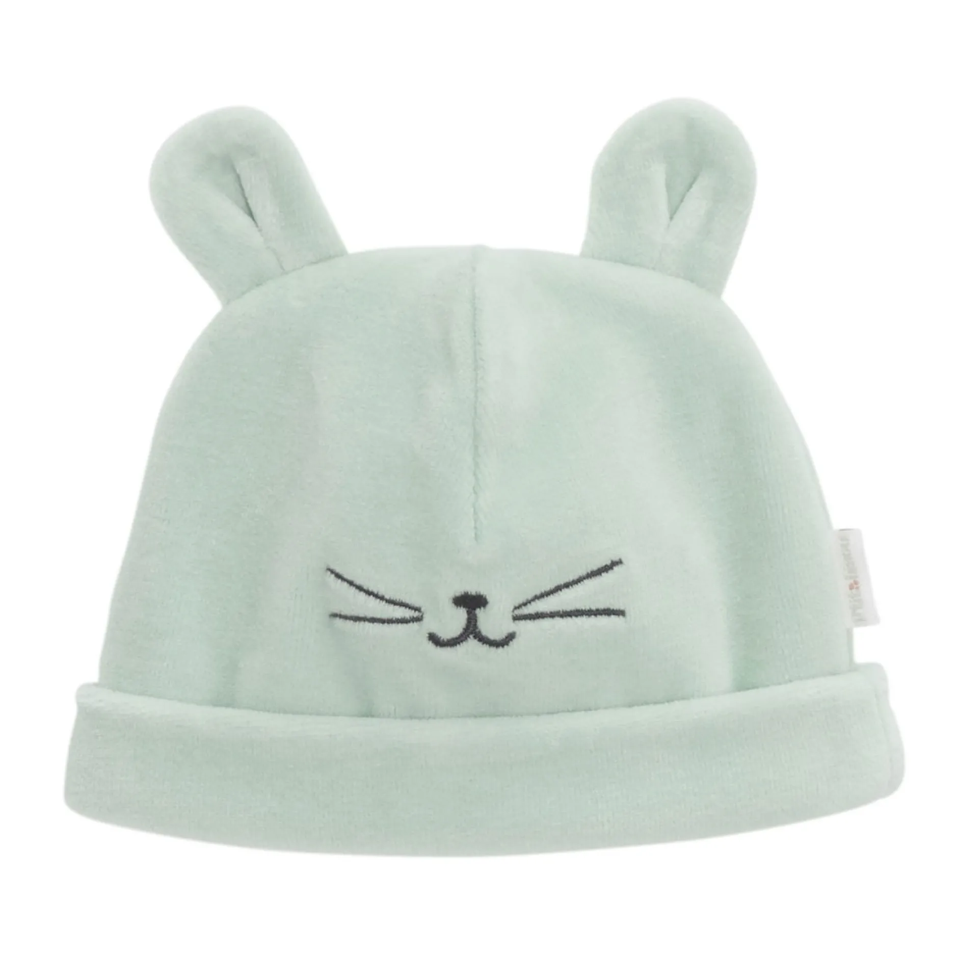 Bonnet naissance P’tit Bisou en velours vert sauge. Cet accessoire tient la tête des bébés bien au chaud et en même temps est très ludique avec ses petites oreilles de chat au dessus de la tête et sa broderie moustache de chat . Revers qui permet d’adapter le bonnet à la tête de bébé. Ce bonnet est doublé de jersey vert sauge uni pour plus de confort et de chaleur. L’accessoire parfait à la fois fonctionnel et joli et qui constitue un élément essentiel du trousseau naissance.