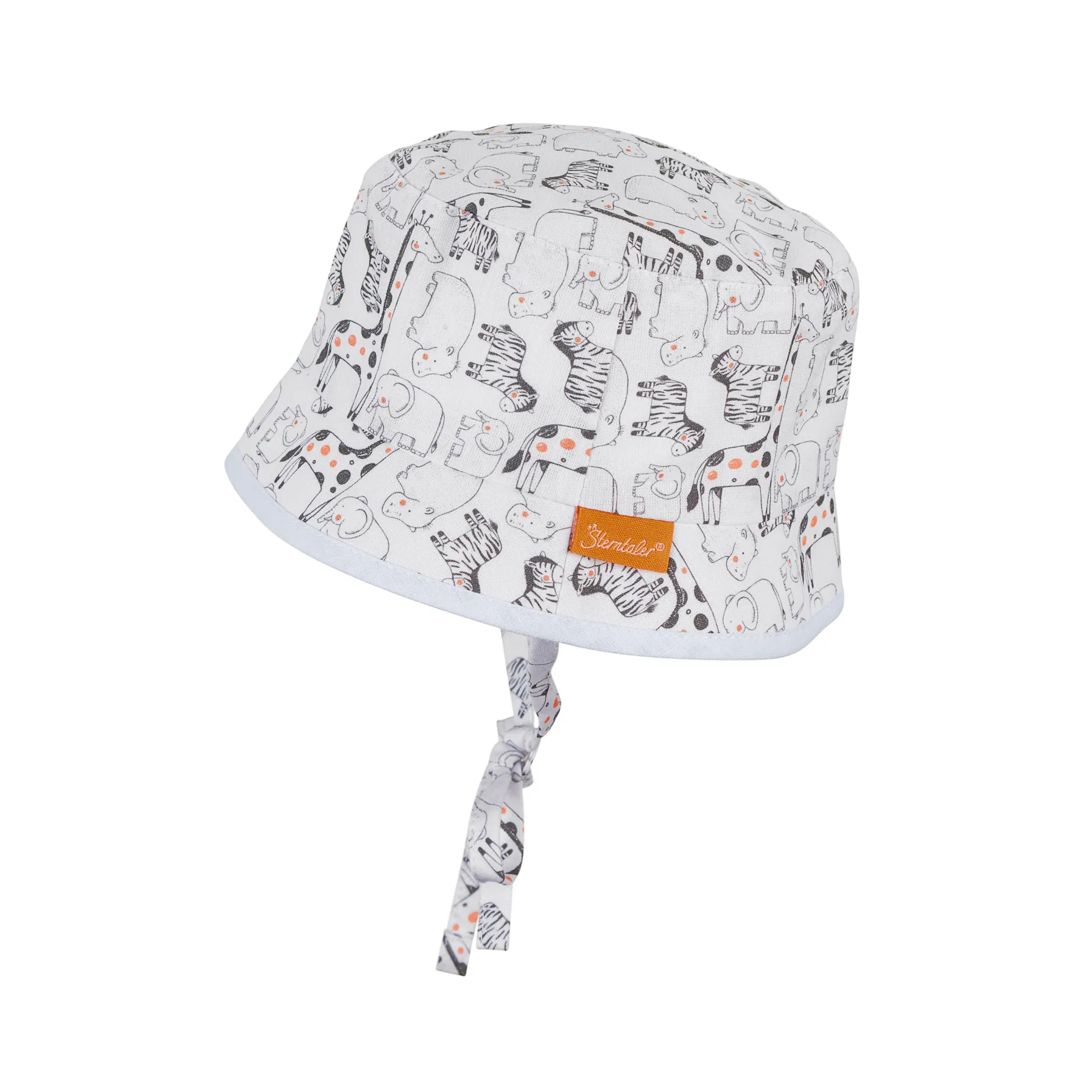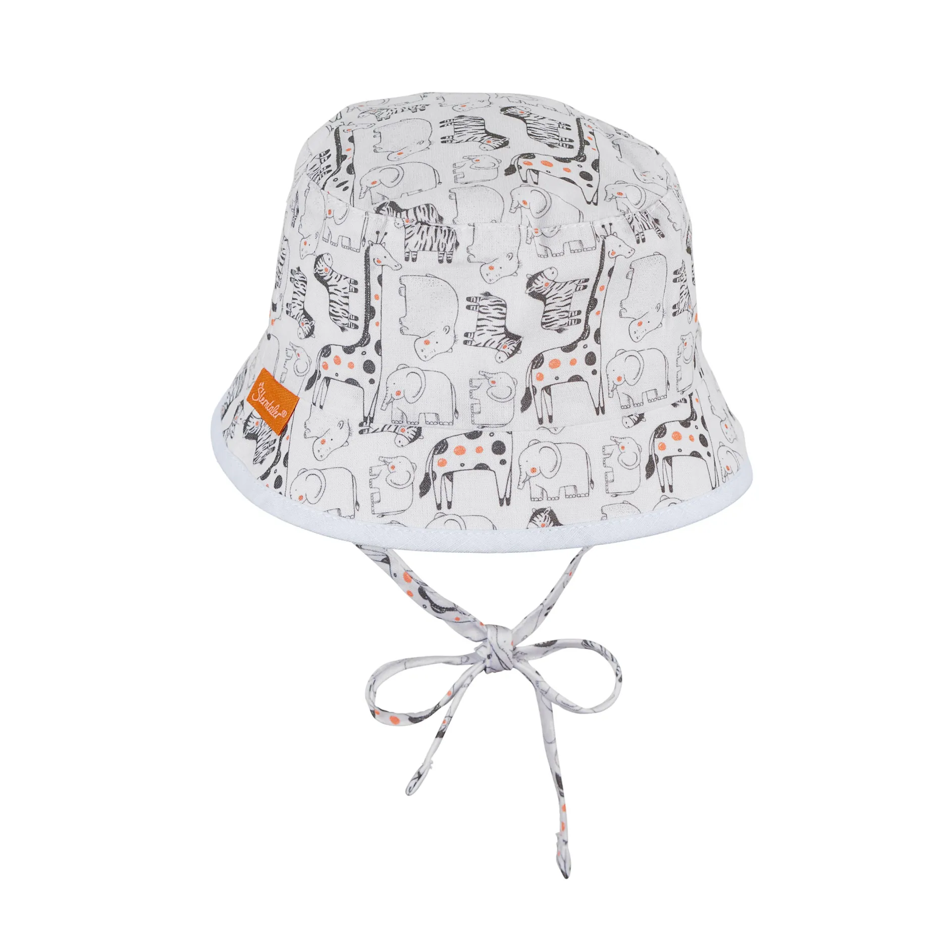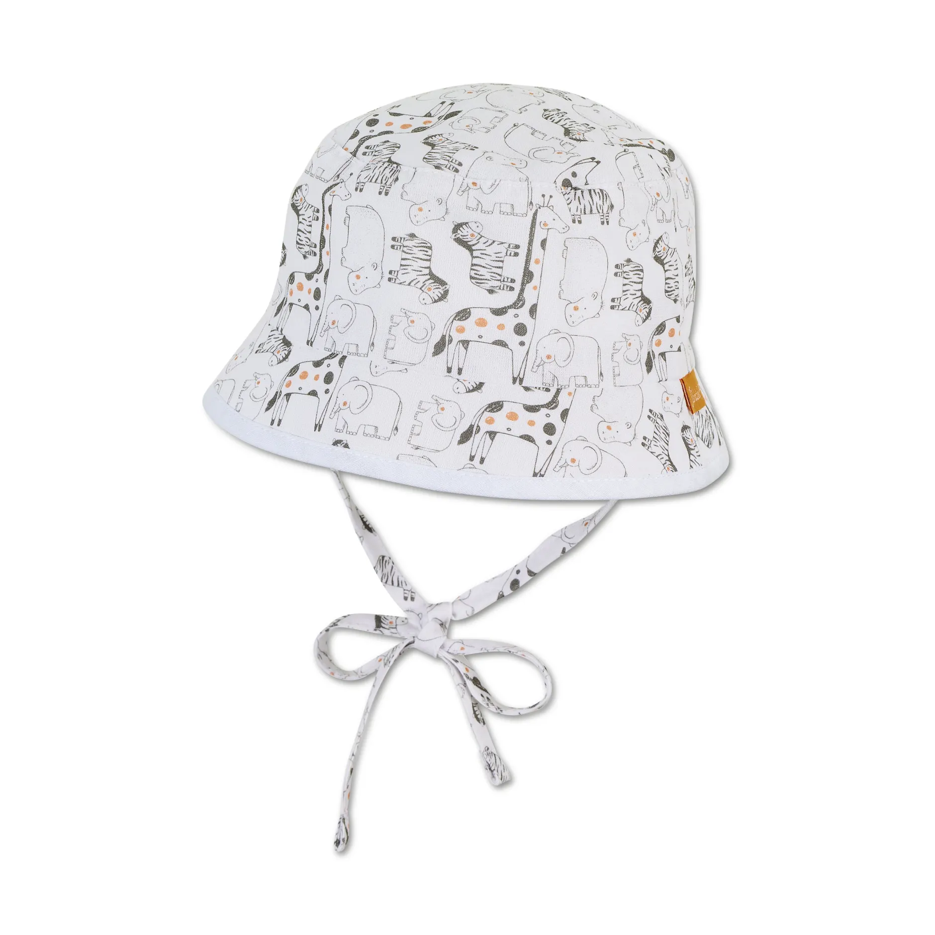 Chapeau Bob réversible en tissu de coton imprimé avec des animaux de safari, avec liens à nouer, doublé d’un tissu de coton structuré à l’aspect lin.