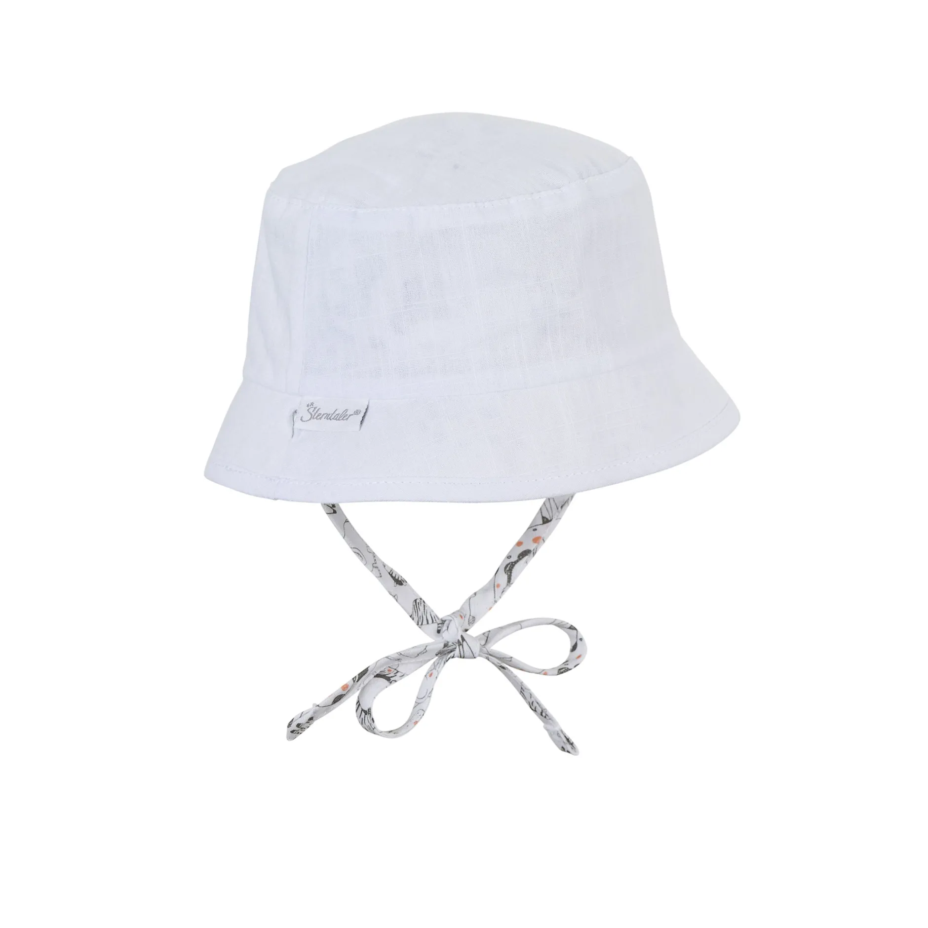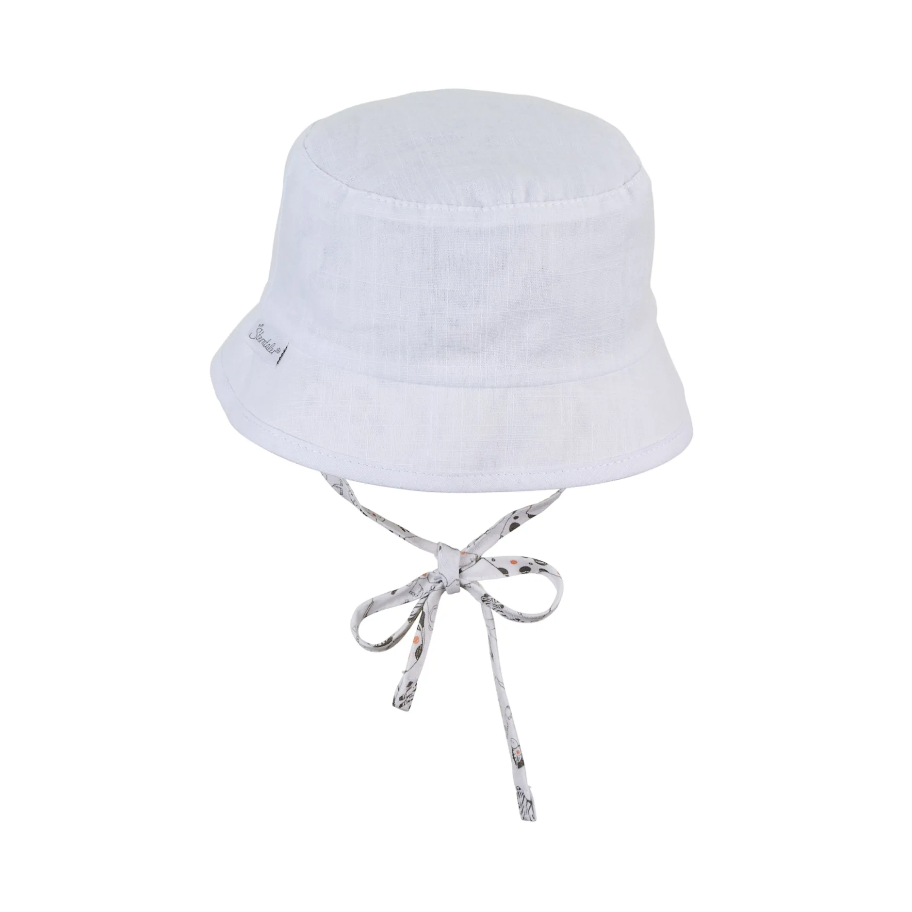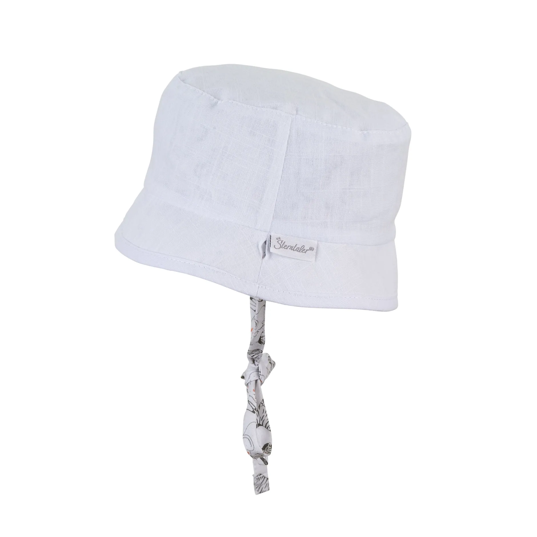 Chapeau Bob réversible en tissu de coton imprimé avec des animaux de safari, avec liens à nouer, doublé d’un tissu de coton structuré à l’aspect lin.