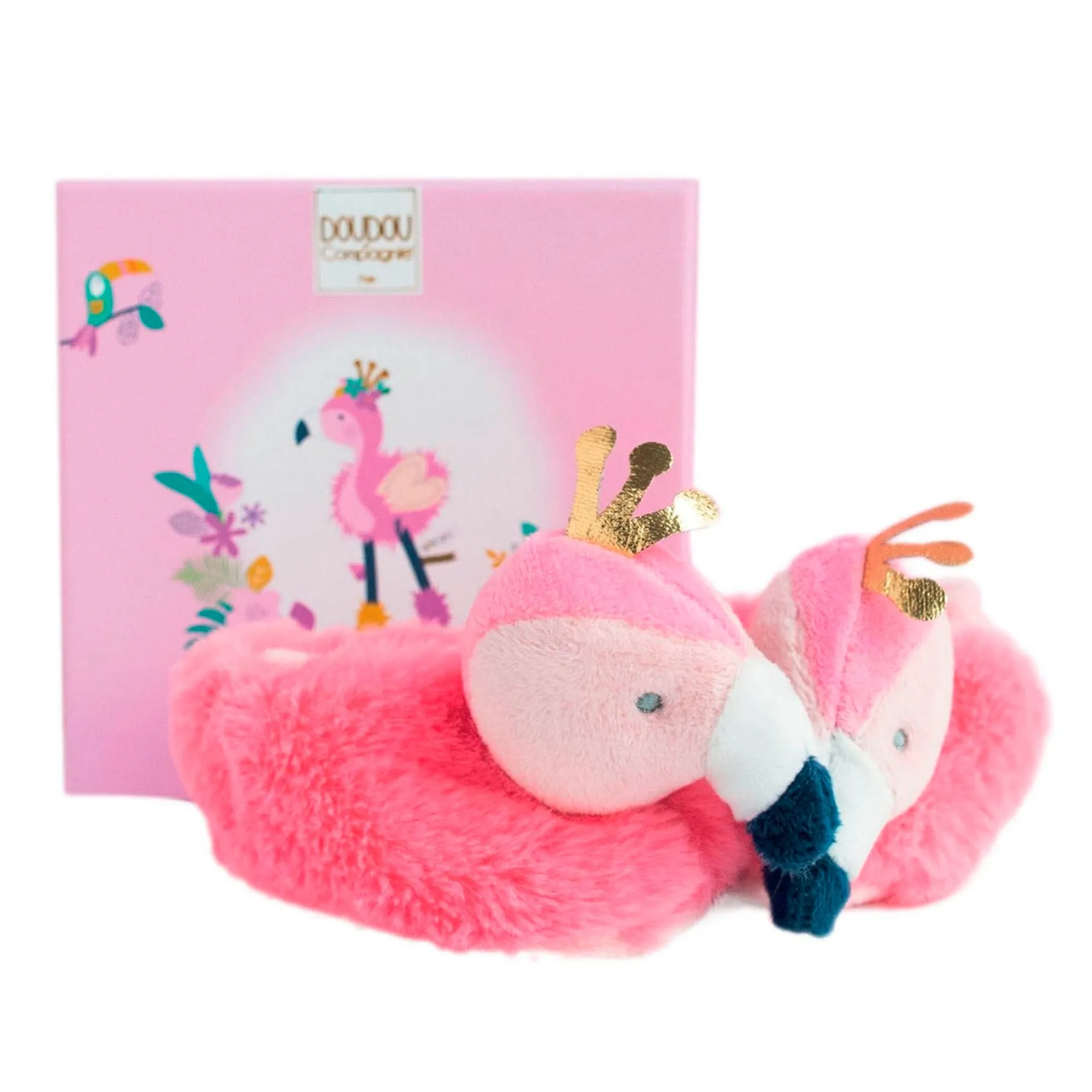 Jolie paire de chaussons avec hochet de la collection Tropicool de Doudou & Compagnie. Livrés dans une belle boîte cadeau, ces chaussons feront un cadeau de naissance idéal et permettront de garder bien au chaud les pieds de bébé.