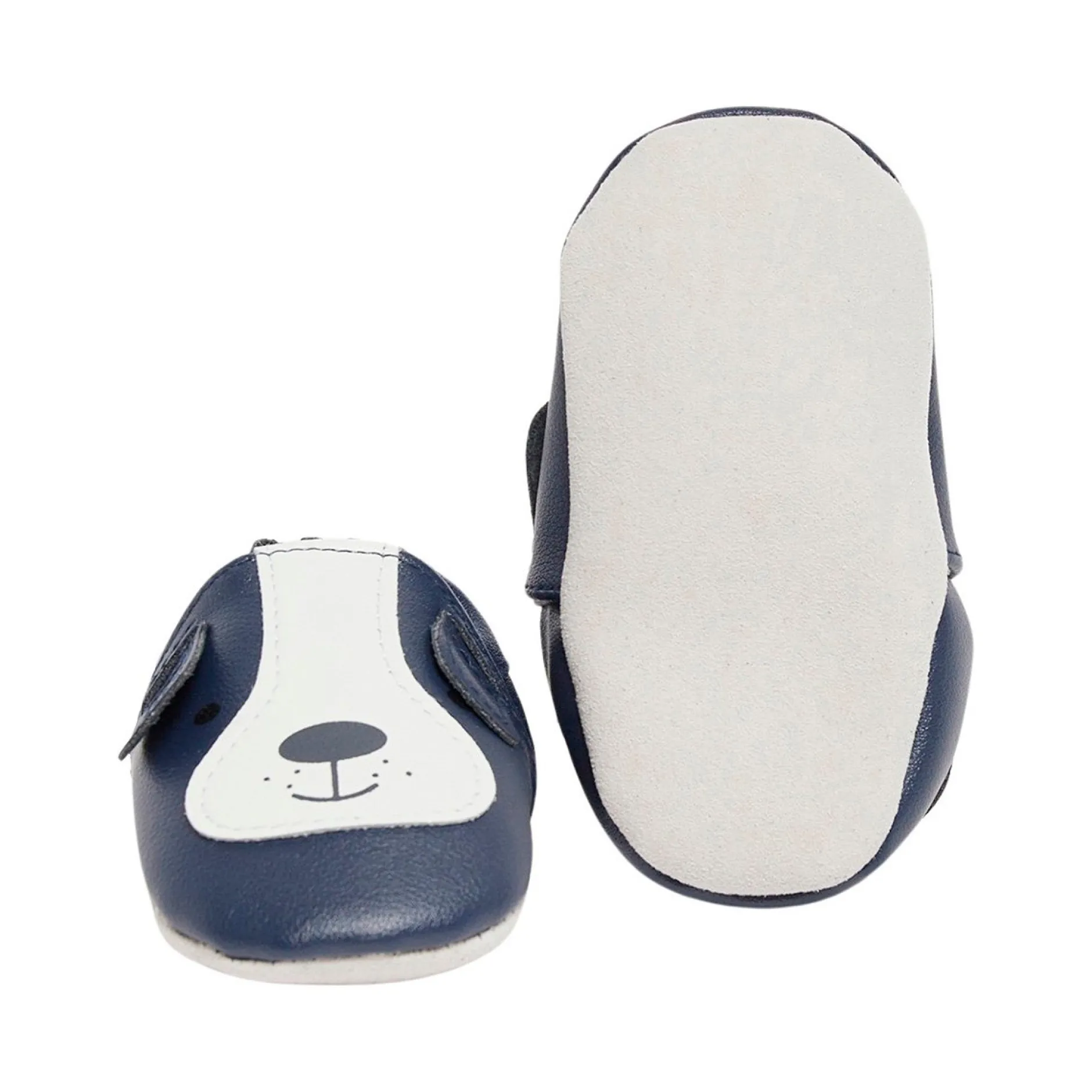 Chaussons en cuir véritable P’tit Bisou bleu marine représentant une tête de petit chien avec ses oreilles en volume. Très bon maintien du pied assuré par un élastique sous le rabat devant et derrière le pied. Semelle de dessous en cuir. A la fois ludiques et fonctionnels ces chaussons tiendront les petits petons de bébé bien au chaud.