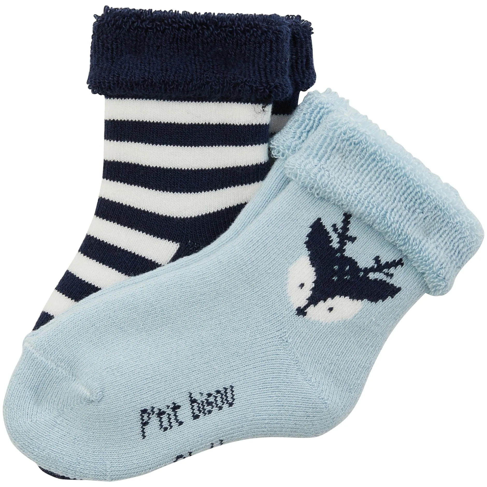 Une paire bleue avec un petit faon et une paire bleue marine à rayures blanches.