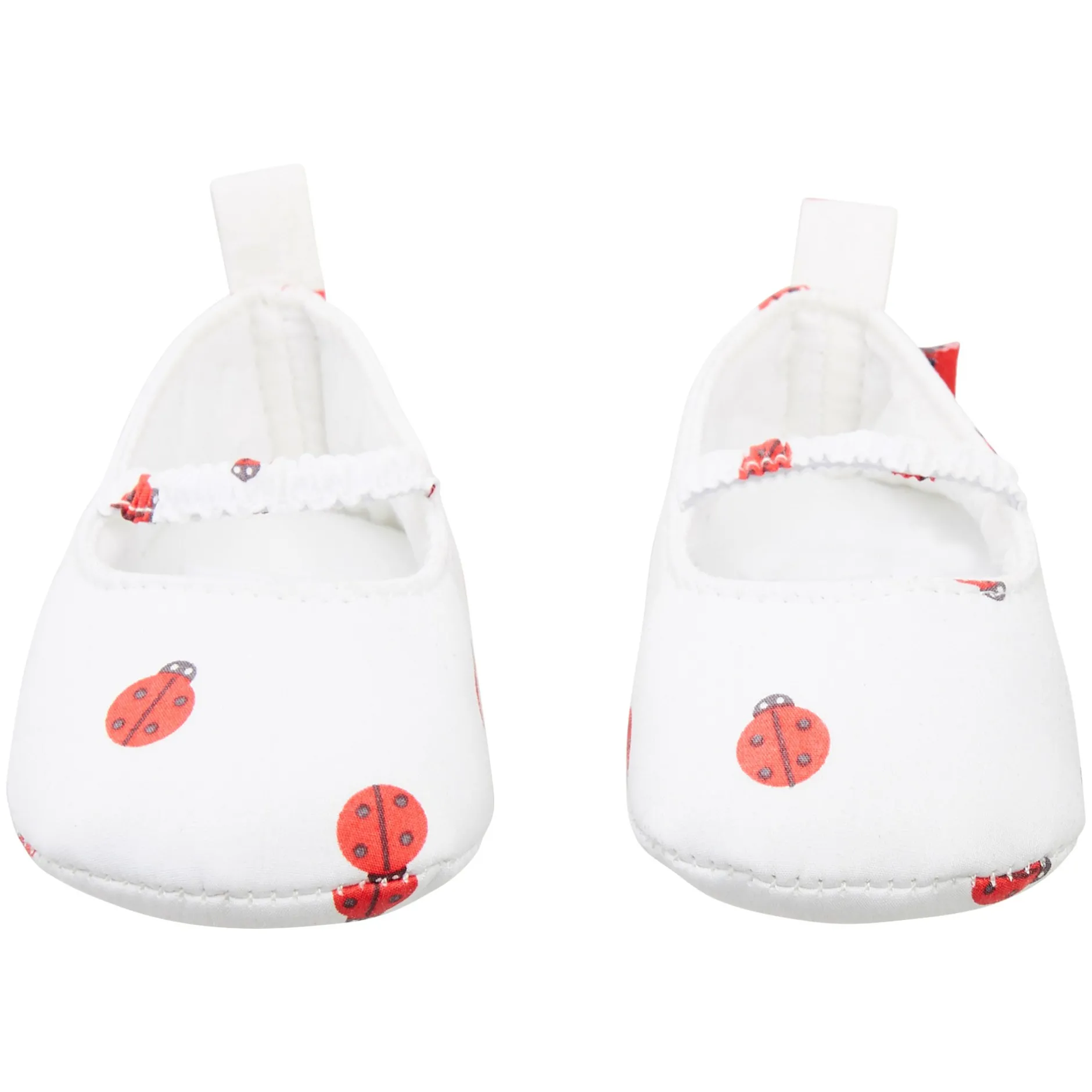Petits chaussons façon ballerines P’tit Bisou en voile de coton blanc en imprimé « coccinelles » de coloris rouge. Petit lien élastiqué sur le devant pour bien tenir le pied de bébé. 100% coton. L’accessoire idéal pour parfaire les tenues des petites filles !