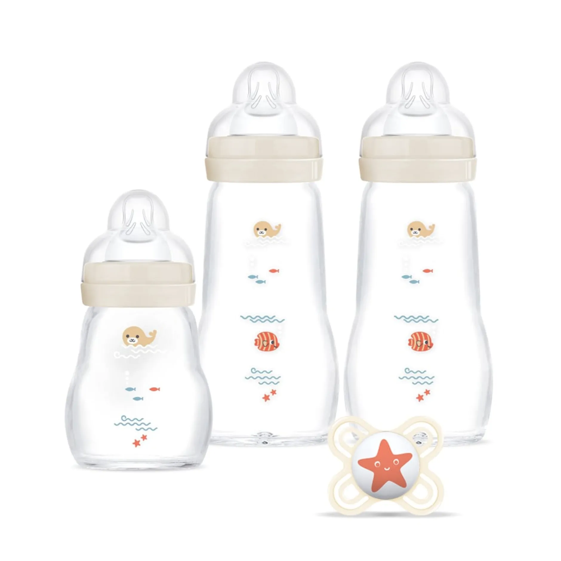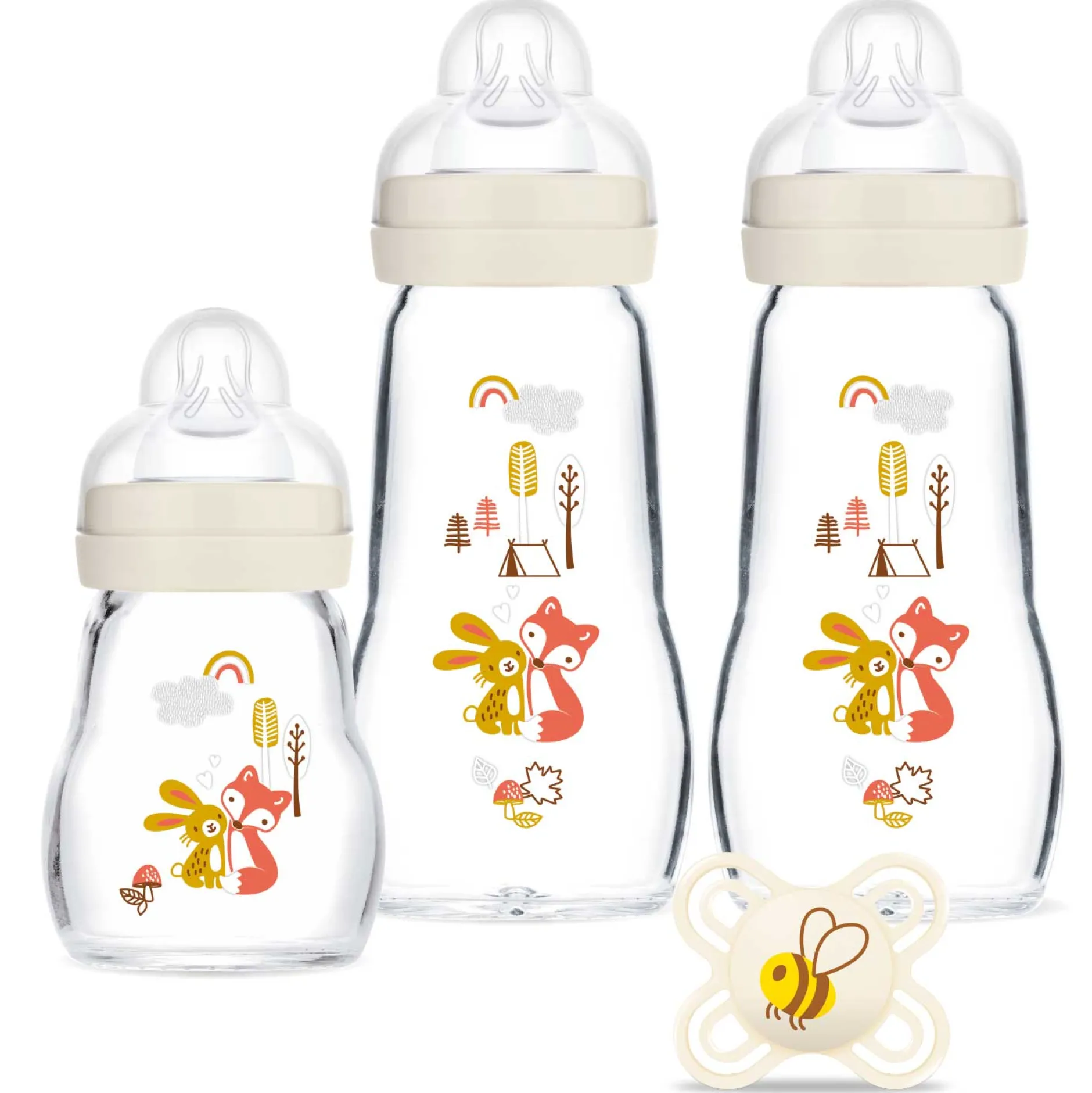 Coffret comprenant 1 biberon 170 ml, 2 biberons 260 ml en verre et une sucette naissance. Les biberons et la sucette arborent de jolis motifs avec arbre, oiseau et hérisson.