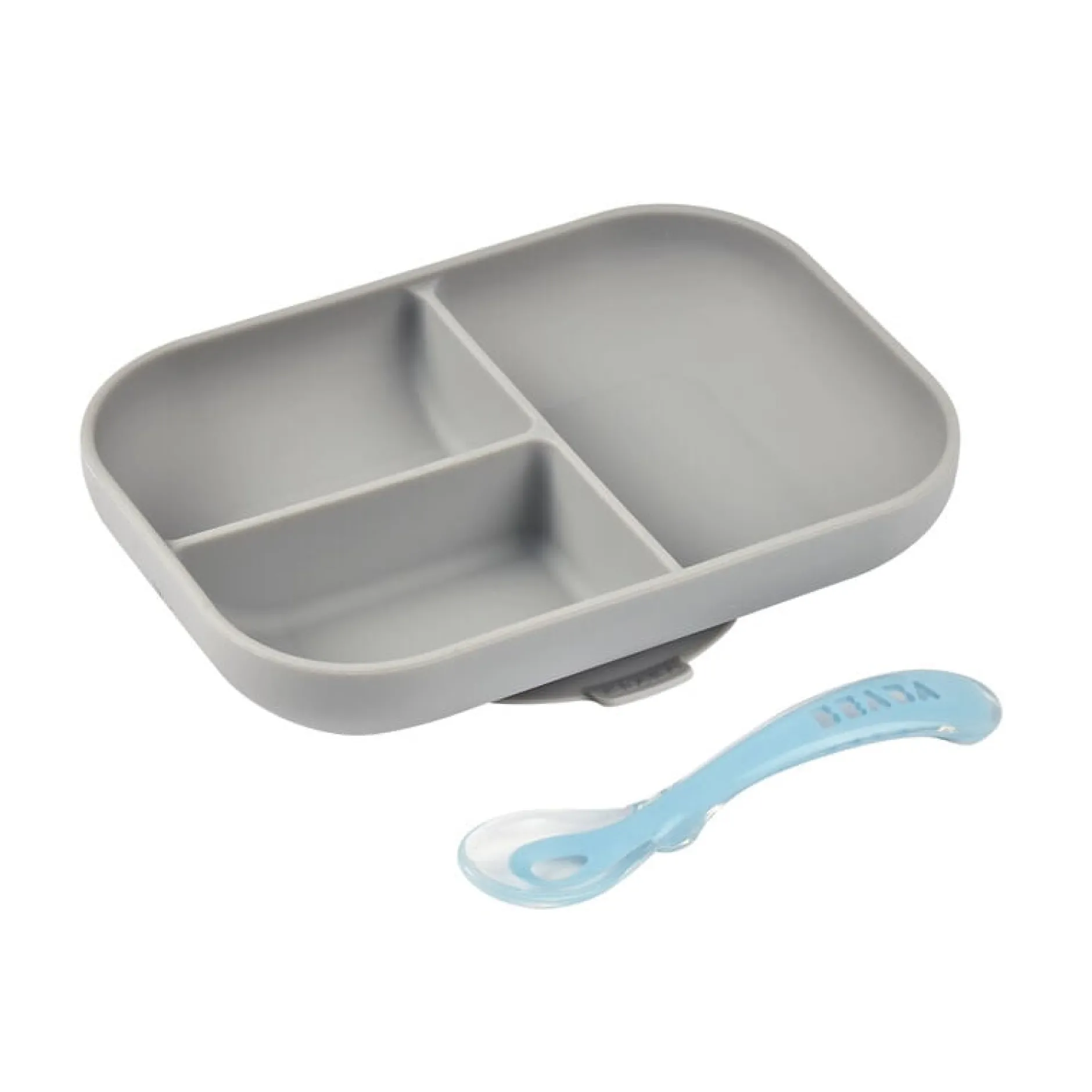 Set repas silicone composé d’une assiette repas 3 compartiments et d’une cuillère 2ème âge. Formes ergonomiques et matière silicone douce incassable pour faciliter l’apprentissage des repas, en toute sérénité.
