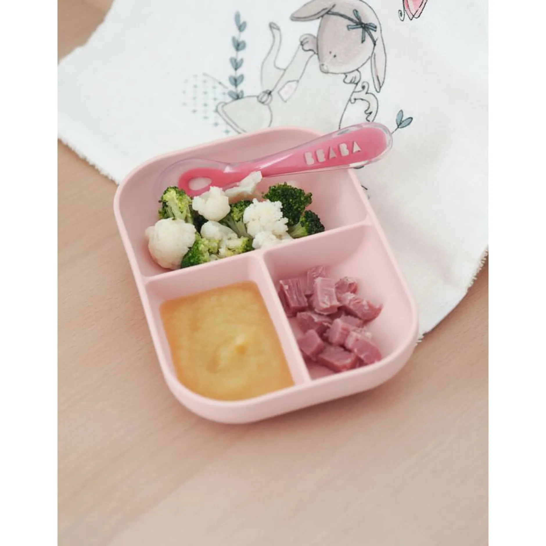 Set repas silicone composé d’une assiette repas 3 compartiments et d’une cuillère 2ème âge. Formes ergonomiques et matière silicone douce incassable pour faciliter l’apprentissage des repas, en toute sérénité.
