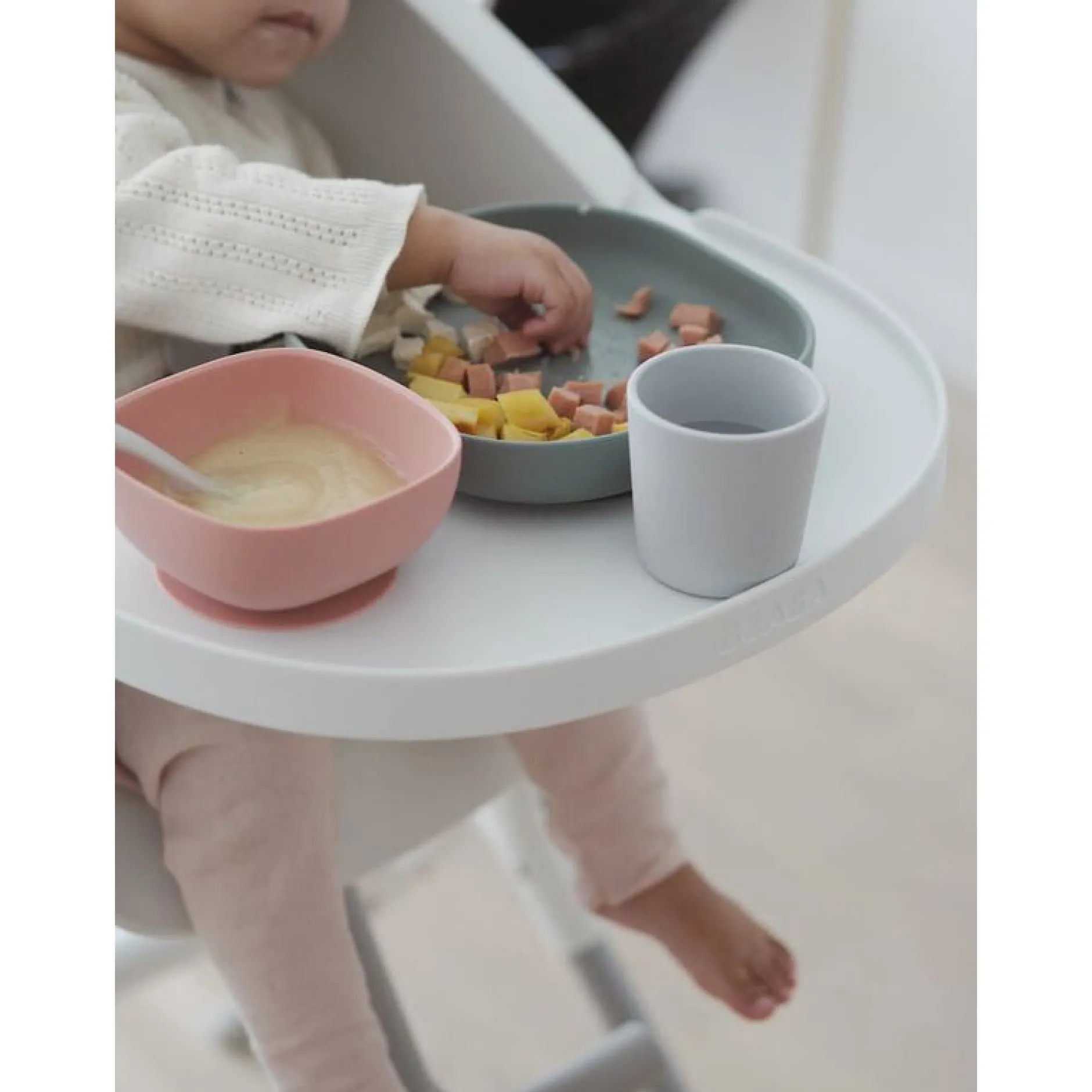 Gamme repas silicone composée d’une assiette et d’un bol avec ventouse, ainsi que d’un verre (cuillère 2ème âge silicone inclus dans le set)