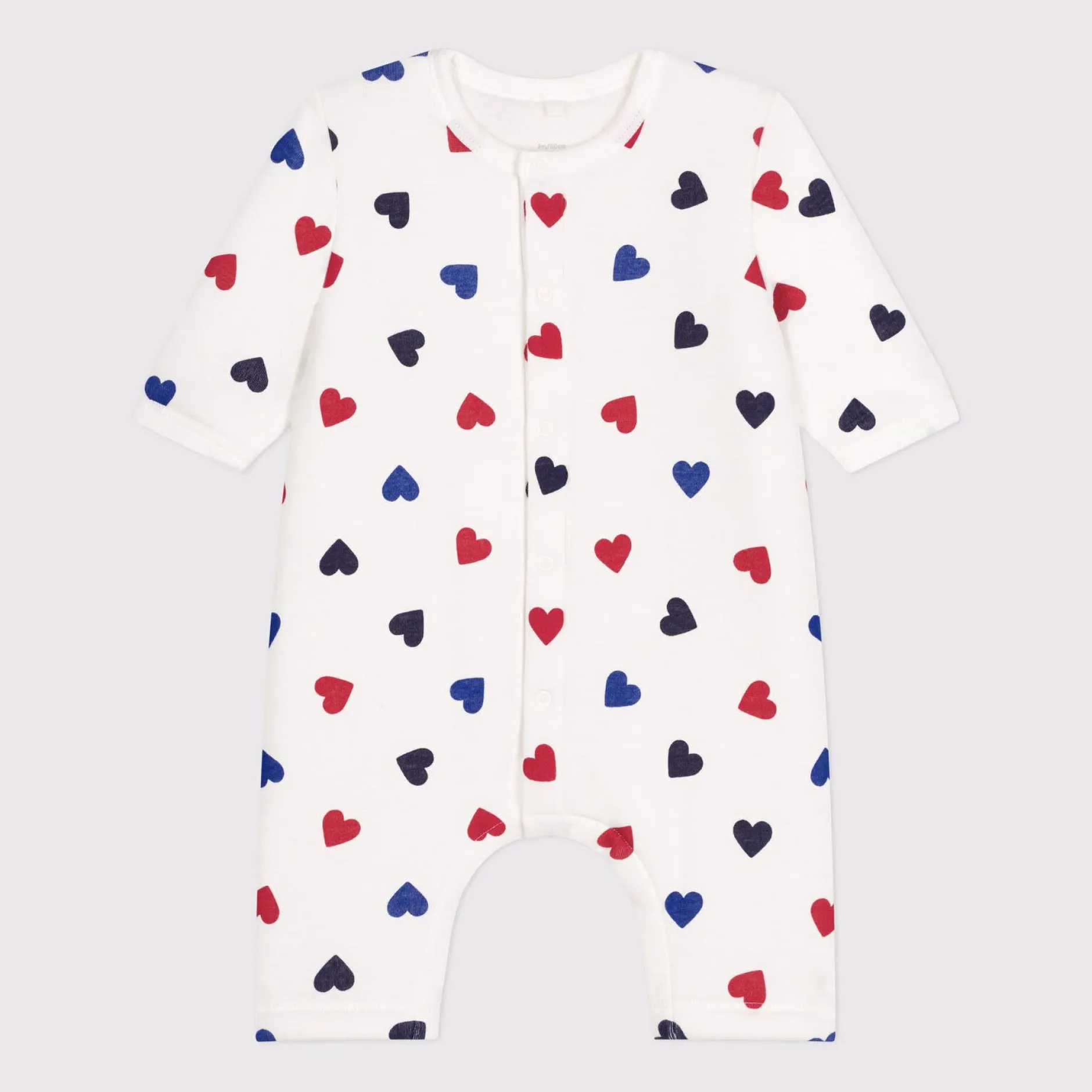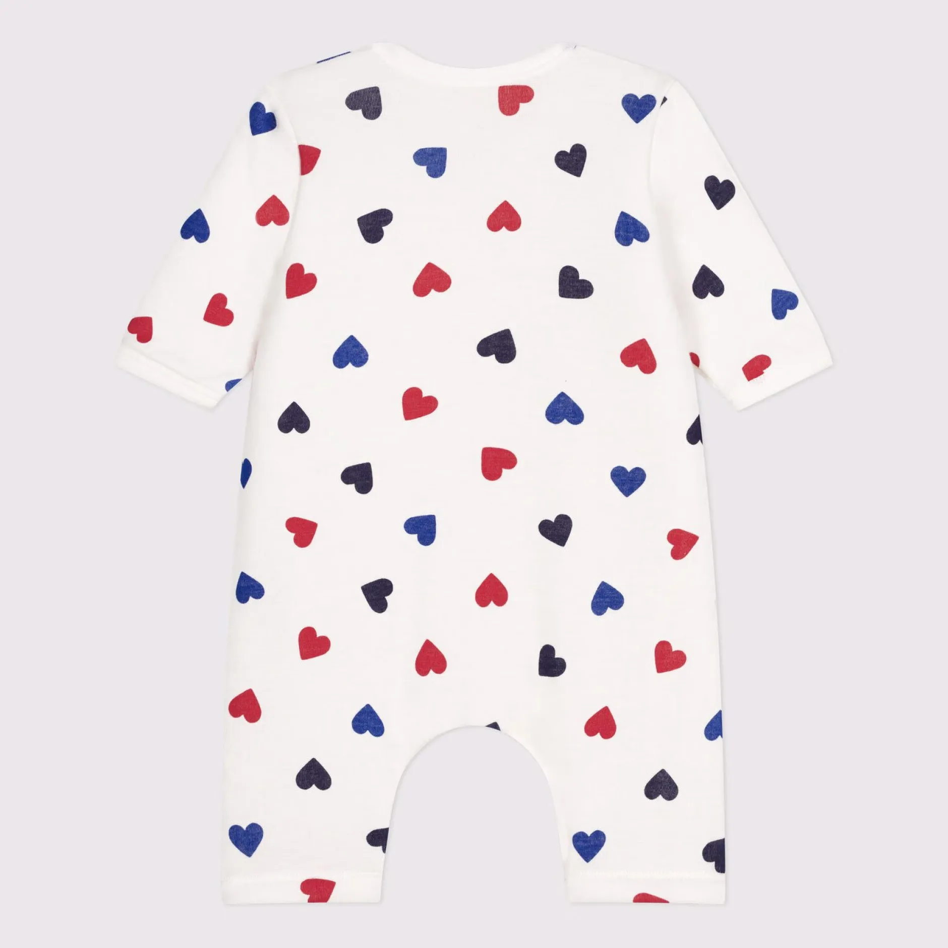 Combinaison unisexe en côte, une matière souple et extensible. Combinaison longue à motifs cœurs en trois couleurs, adorable ! Ouverture à boutons-pression sur toute la hauteur et à l’entrejambe pour faciliter l’enfilage.