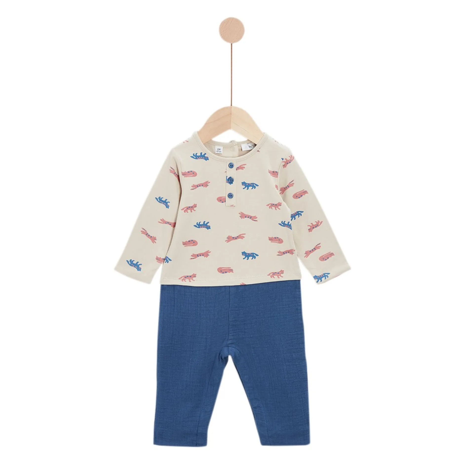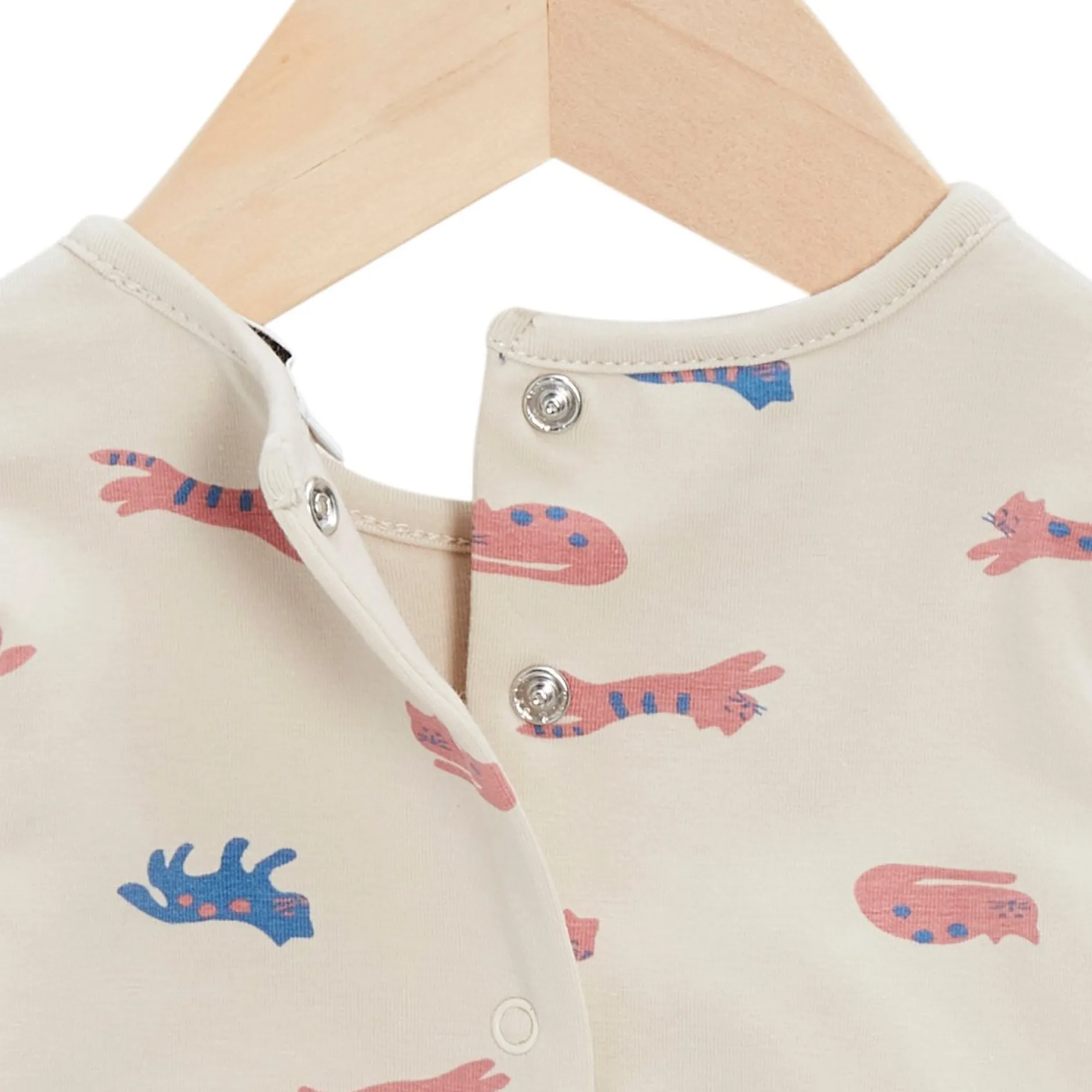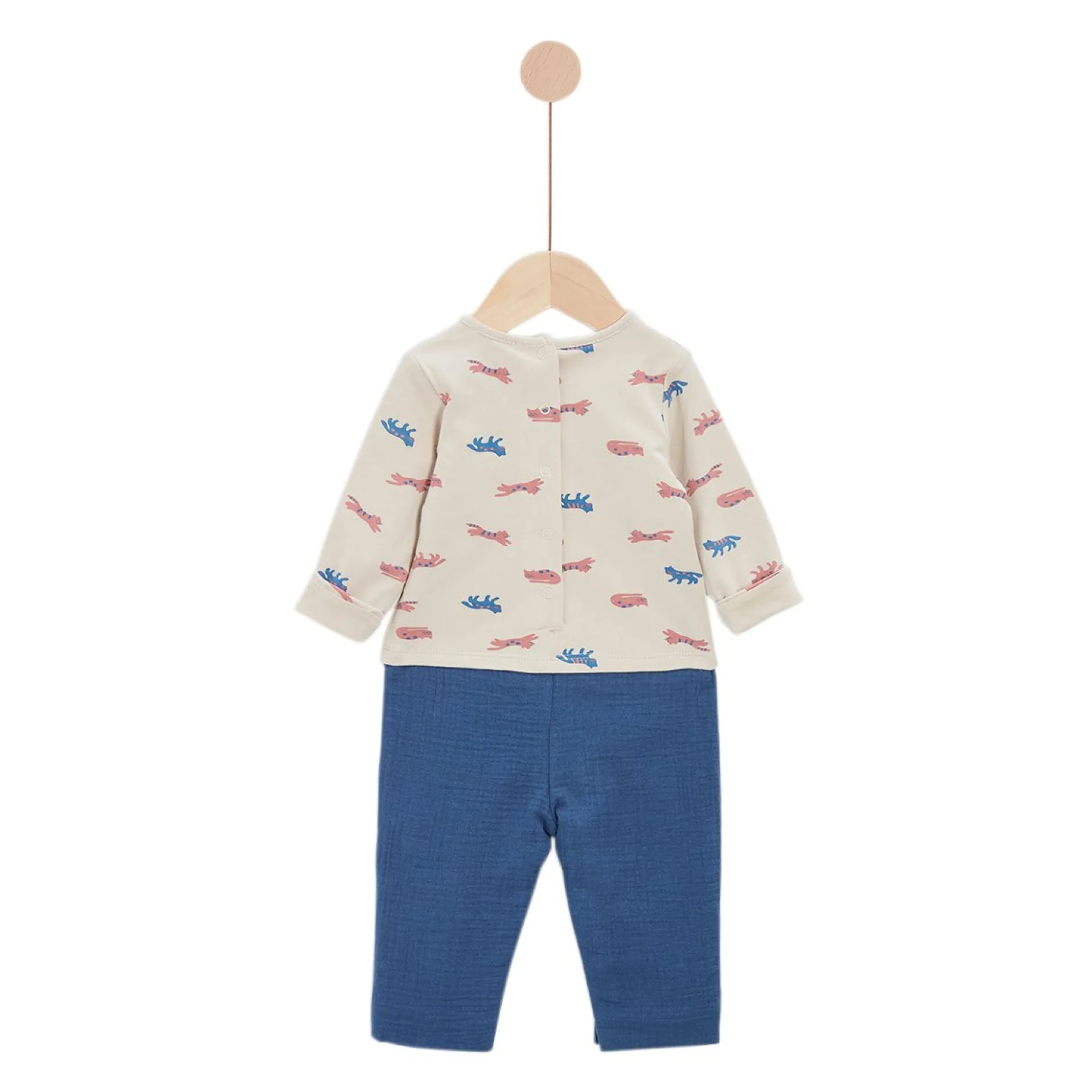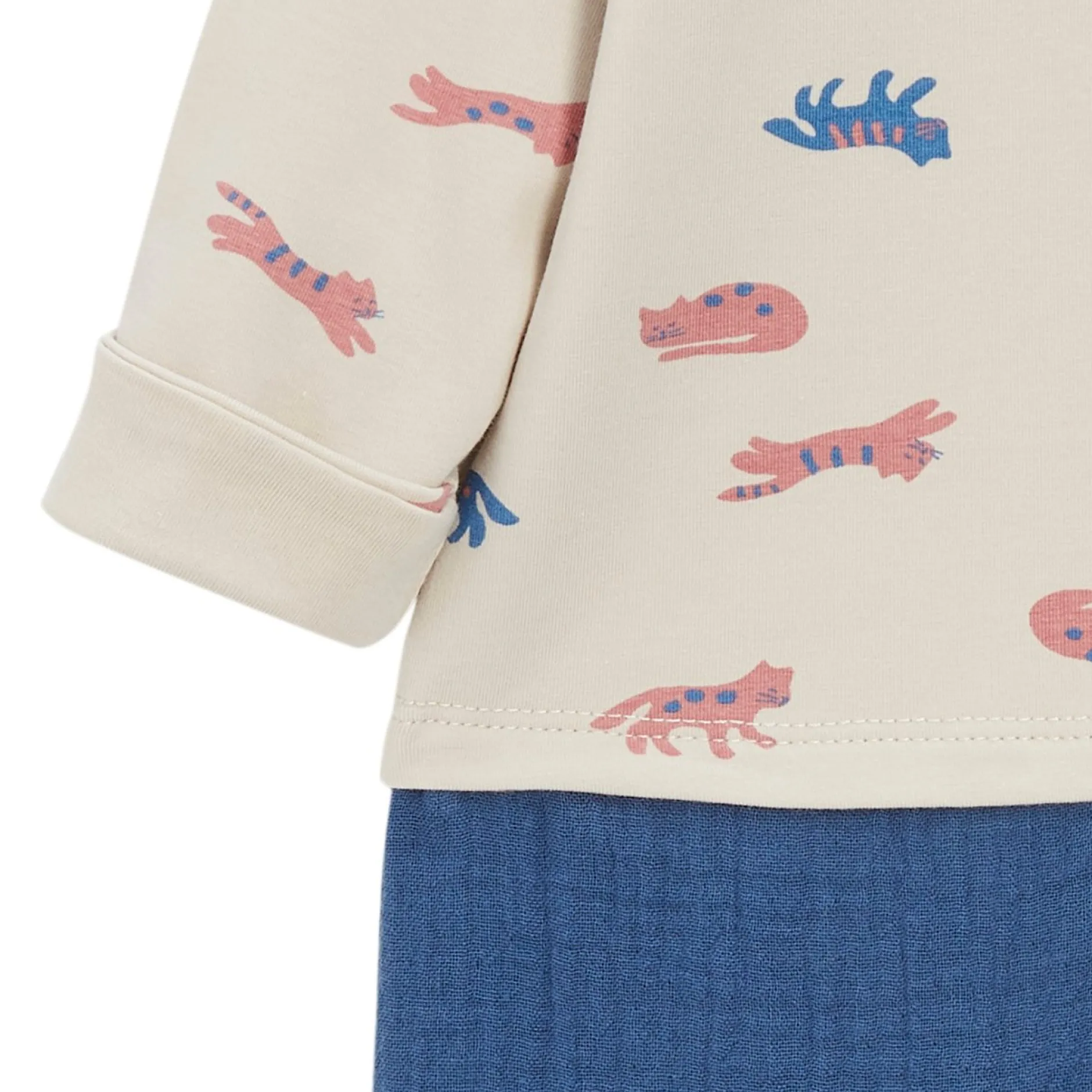 Combilongue Marèse en effet trompe l’oeil comme un tee shirt manches longues à col tunisien sur pantalon. Le Haut est en jersey de Coton sur fond beige avec imprimé « petits chats » en coloris bleu saphir et terracotta. Très belle pièce avec son effet trompe-l’œil d’un tee shirt sur un pantalon. Le Bas est en mousseline de gaze en bleu saphir doublé de voile pour une meilleure finition. Le pantalon a une forme tendance un peu « carotte » avec sa fourche descendue. Ouverture entrejambes par pressions cachées et ouvertures dans le dos par des pressions. La pièce confortable que l’on peut porter toute la journée à avoir dans son petit dressing ! Lavage à 30°C.