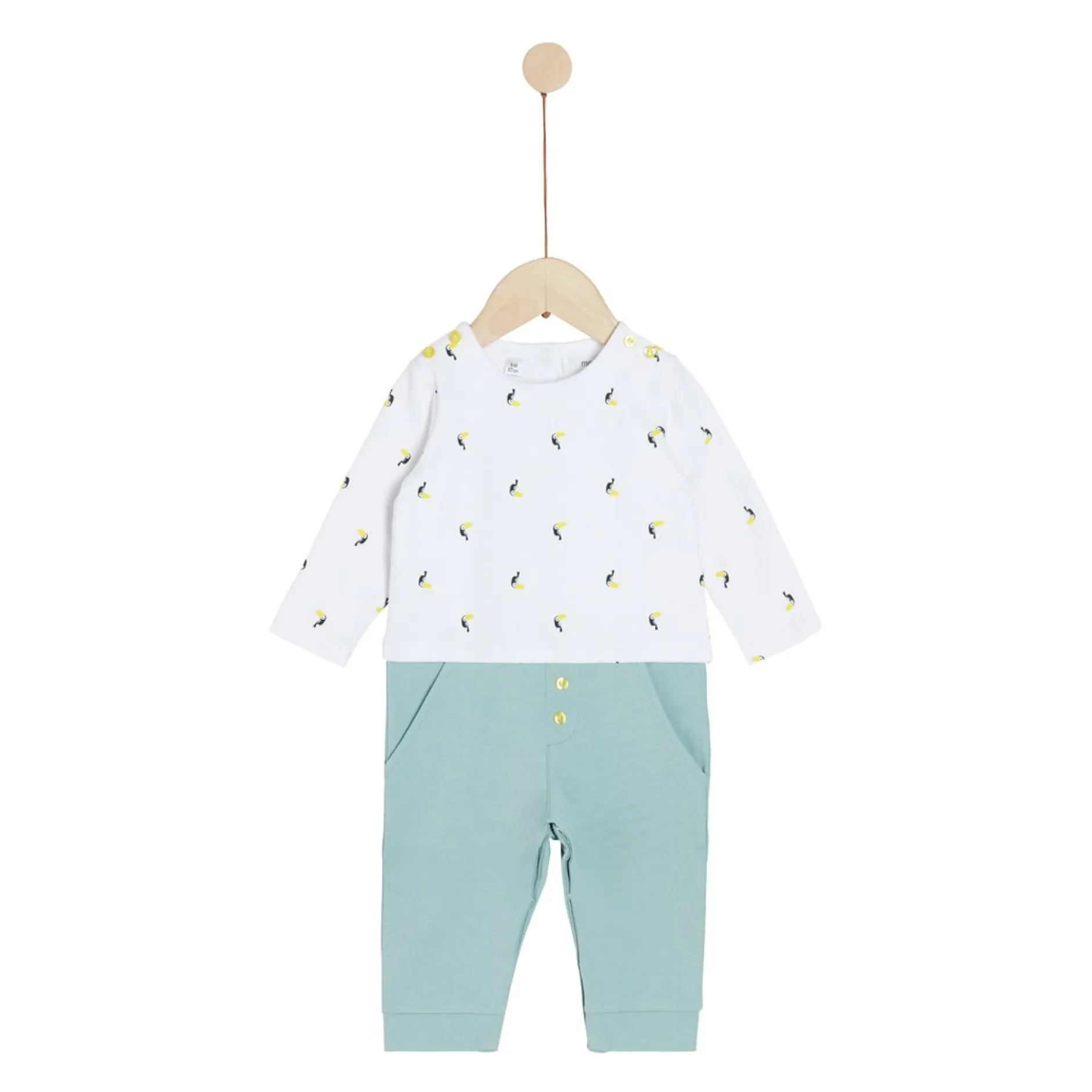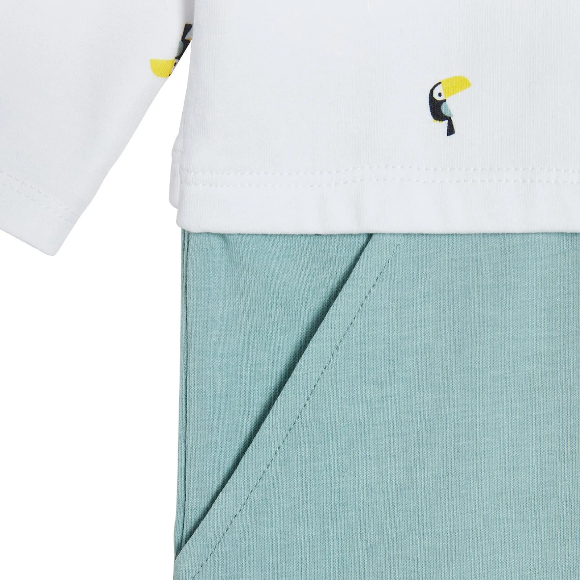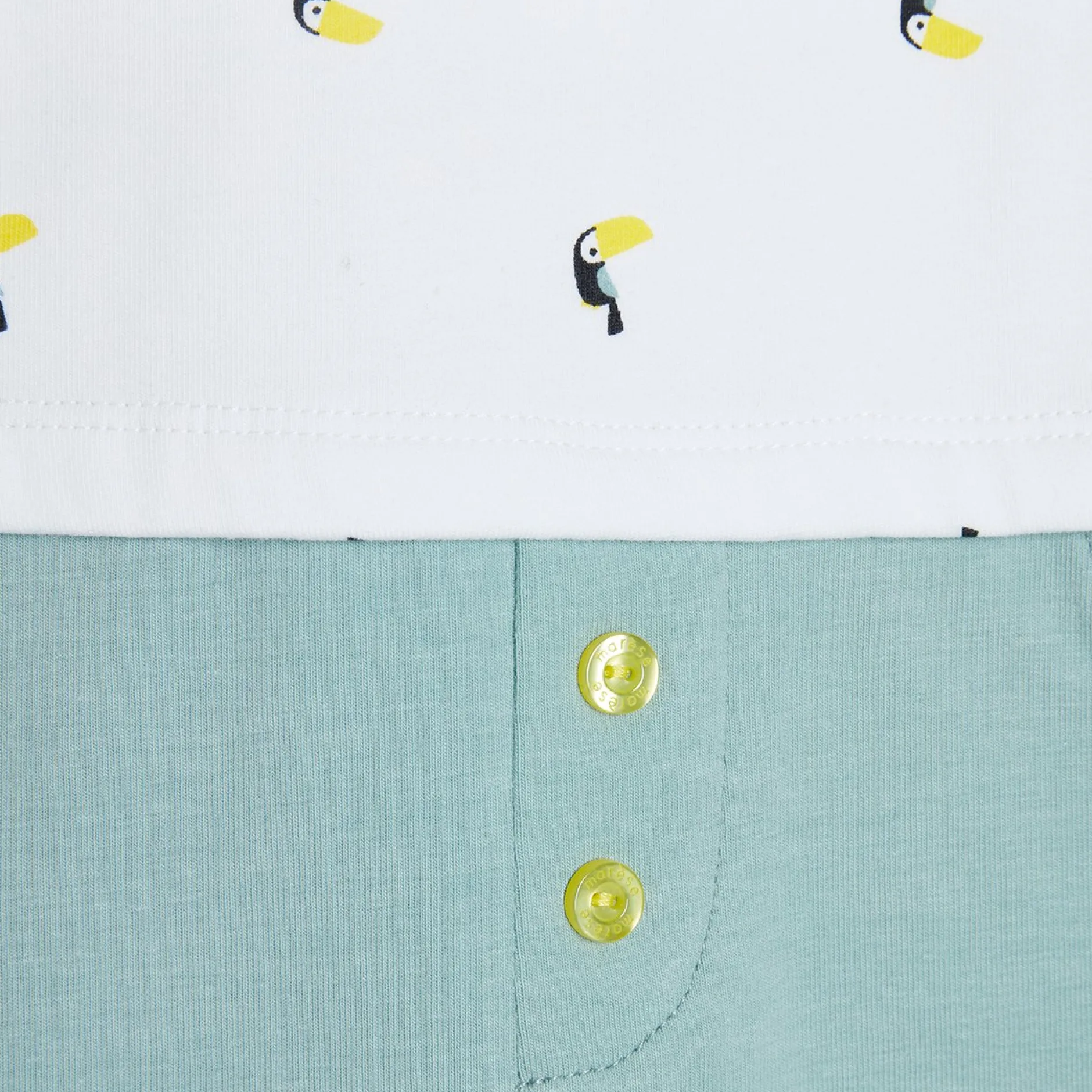 Combilongue Marèse en jersey de coton sur fond blanc et impressions de petits toucans exotiques sur le haut et jersey vert eucalyptus en bas. Très belle pièce avec son effet trompe-l-œil d’un tee shirt sur un pantalon. Entièrement doublée de jersey blanc sur le haut pour éviter la transparence et pour une meilleure finition. 2 petits boutons jaunes de chaque côté des épaules viennent apporter la touche couleur.