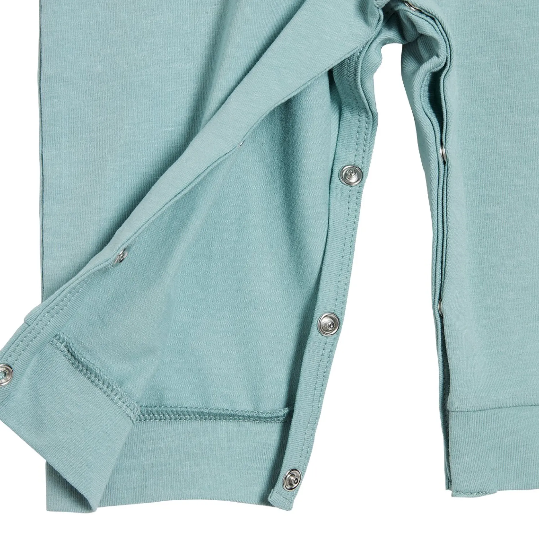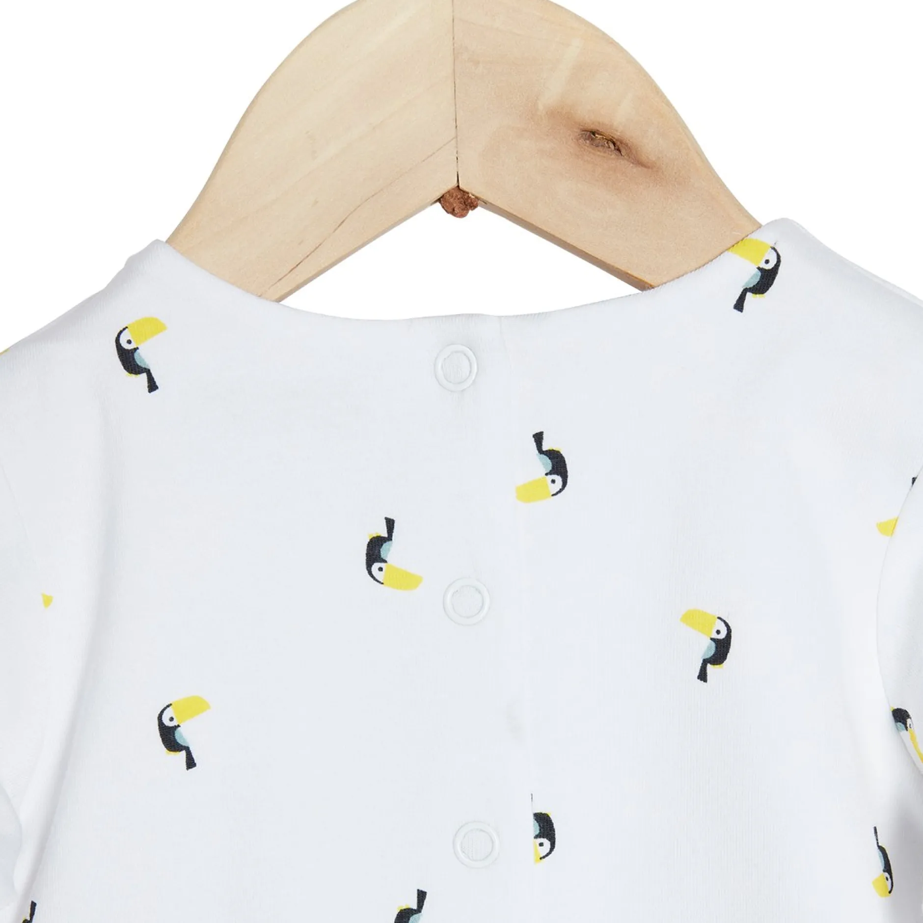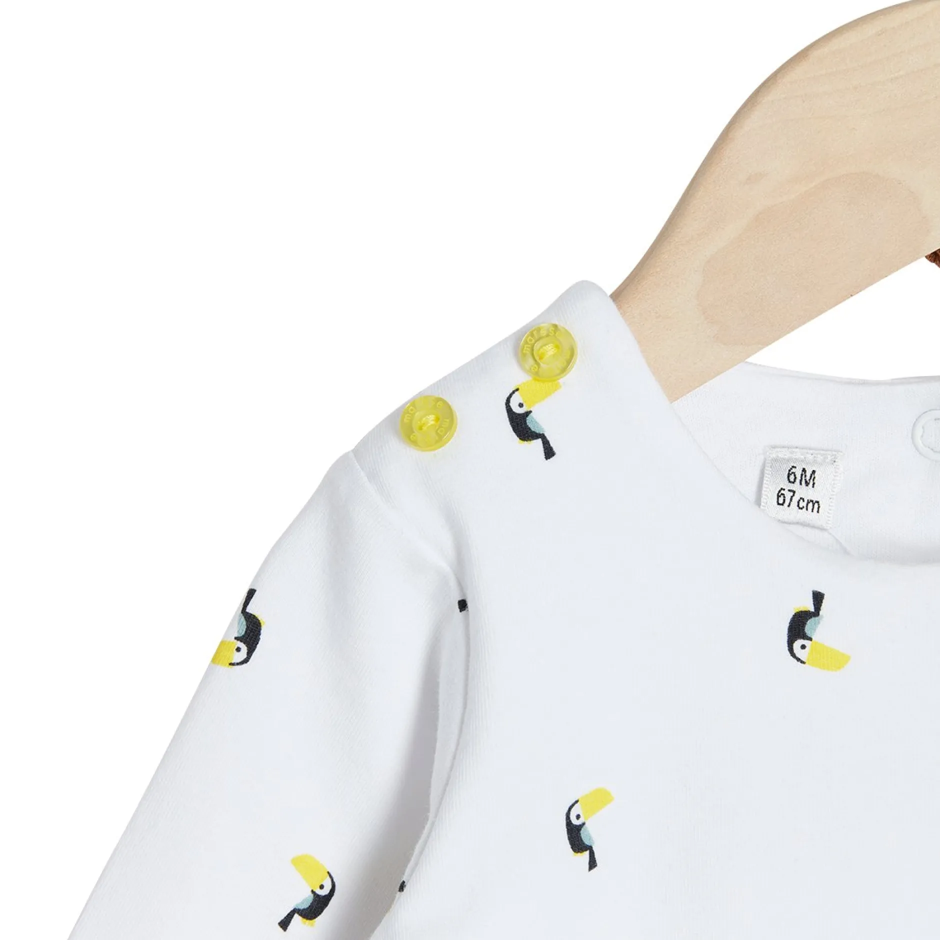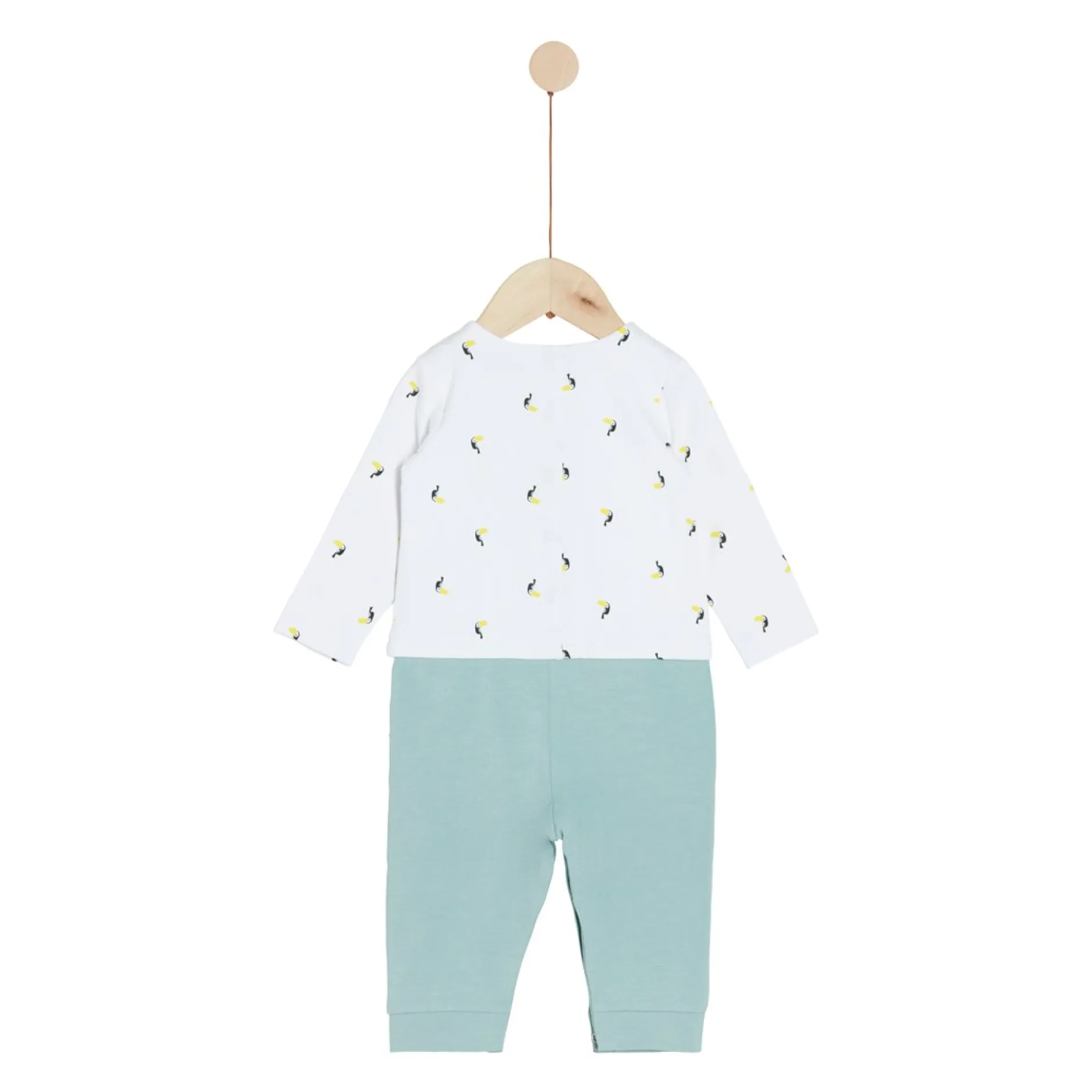 Combilongue Marèse en jersey de coton sur fond blanc et impressions de petits toucans exotiques sur le haut et jersey vert eucalyptus en bas. Très belle pièce avec son effet trompe-l-œil d’un tee shirt sur un pantalon. Entièrement doublée de jersey blanc sur le haut pour éviter la transparence et pour une meilleure finition. 2 petits boutons jaunes de chaque côté des épaules viennent apporter la touche couleur.