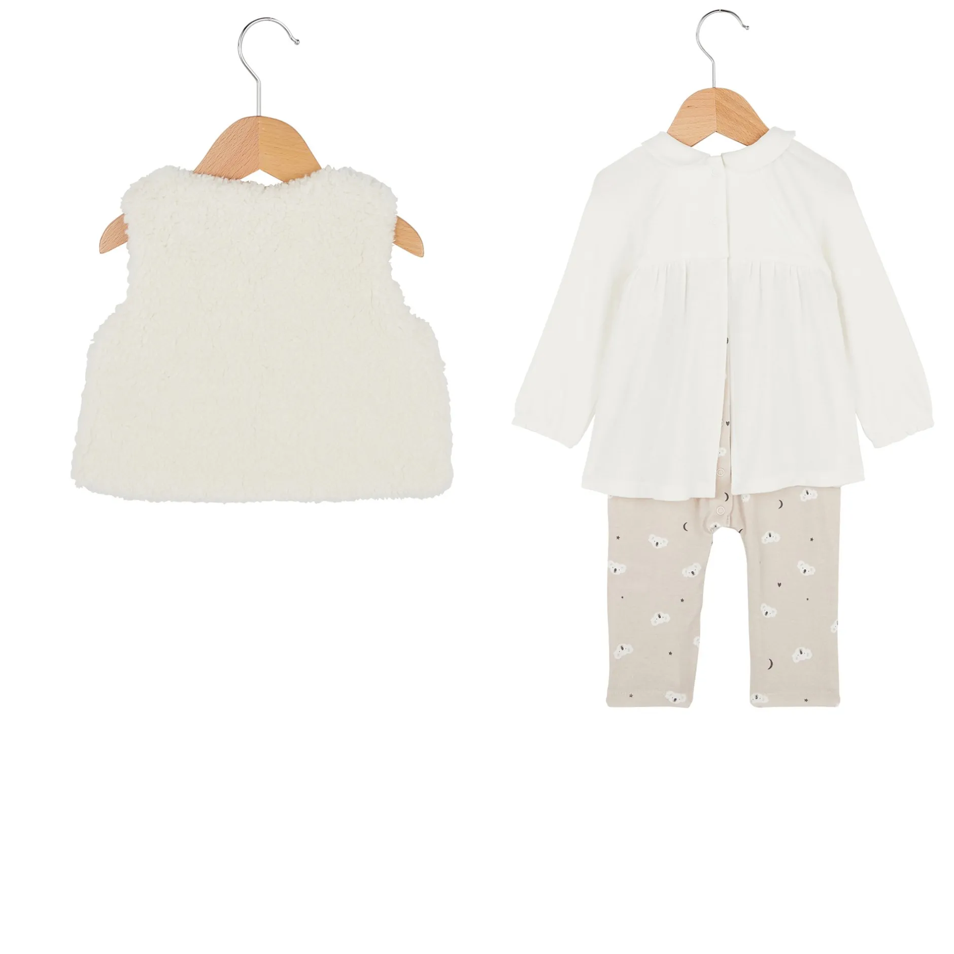 - une combi longue comme une tunique écru parsemée de petits cœurs dorés et à l’effigie de la mascotte du thème, le koala. Cette partie haute a un très joli col Claudine qui la rend très féminine. L’habillage est facile grâce aux boutons à pressions tout le long du dos. Le bas de la combinaison est attenant au haut est un legging en jersey côtelé avec l’imprimé exclusif au thème avec les petites têtes de koala.