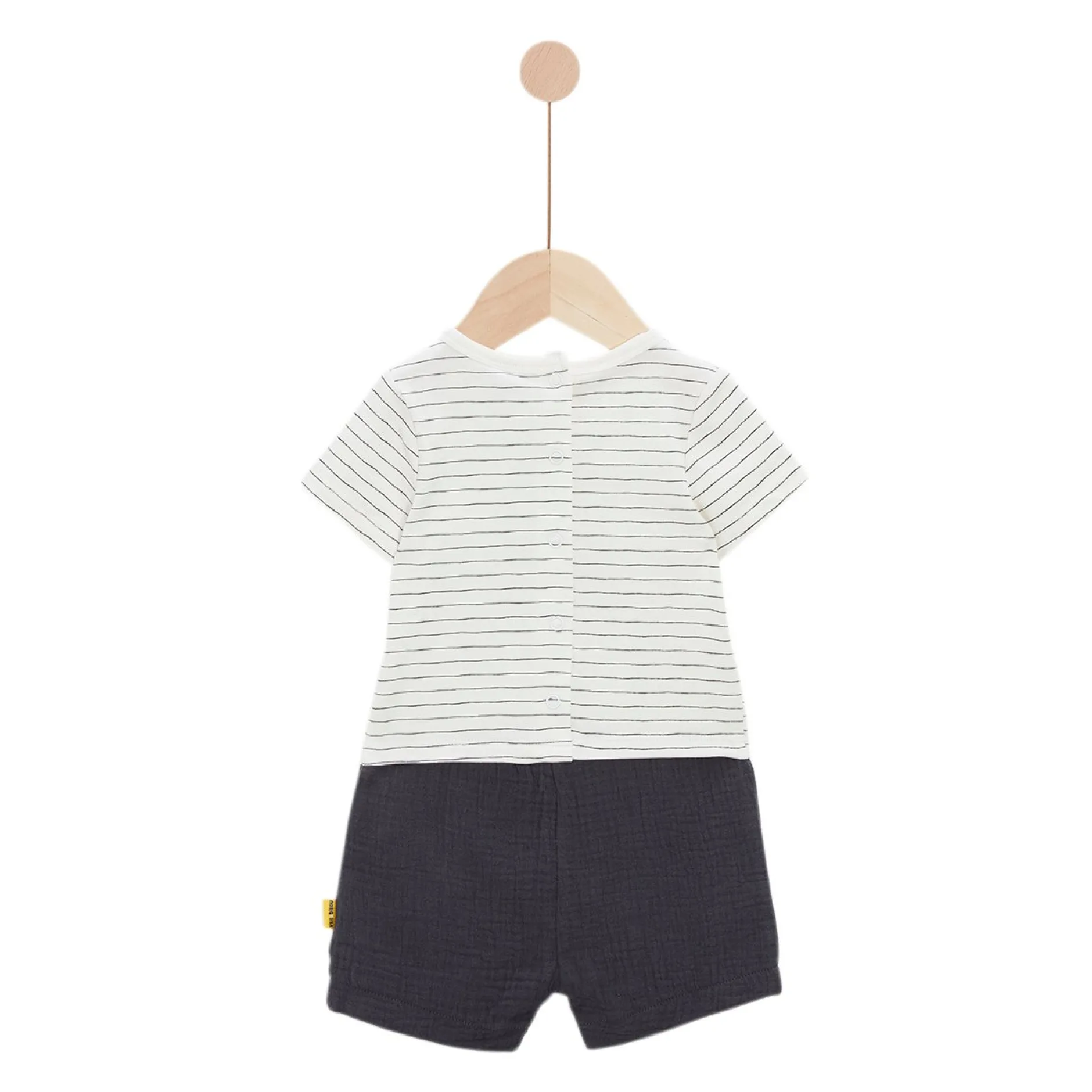 Combinaison P’tit Bisou forme effet trompe l’œil avec tee shirt sur short (le tout est attenant !). Cette combinaisons est ravissante avec son Haut en jersey rayé écru/gris à manches courtes ainsi que son animation avec une girafe qui lui confèrent un côté très ludique et affectif. Le Bas est en mousseline de gaze gris anthracite. Très fonctionnelle avec ouverture entrejambes par pressions cachées et ouverture pressions dos pou le Haut. La pièce idéale quand les températures grimperont et qui va ravir les mamans et les petits garçons. Lavage conseillé à 30°.